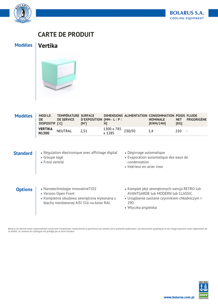 CARTE DE PRODUIT Modèles Vertika Modèles MODĖLE TEMPÉRATURE SURFACE DIMENSIONS ALIMENTATION CONSOMMATION POIDS FLUIDE DE DE SERVICE D'EXPOSITION [MM - L × P × NOMINALE NET FRIGORIGÈNE DISPOSITIF [ºC] [M2] H] [KWH/24H] [KG] VERTIKA N1300 Standard ● ● ● NEUTRAL 2,51 1300 x 785 230/50 x 1285 Régulation électronique avec affichage digital Groupe logé Froid ventilé ● ● ● Options ● ● ● Nanotechnologie innovativeTiO2 Version Open Front Kompletna obudowa zewnętrzna wykonana z blachy nierdzewnej AISI 316 na kolor RAL ● ● ● 1,4 210 - Dégivrage automatique Evaporation automatique des eaux de condensation Intérieur en acier inox Komplet płyt zewnętrznych wersja RETRO lub AVANTGARDE lub MODERN lub CLASSIC Urządzenie zasilane czynnikiem chłodniczym r290 Wtyczka angielska Bolarus SA décline toute responsabilité concernant l'exactitude, l'exhaustivité la pertinence du contenu de la présente publication. Les documents graphiques et les images peuvent varier légèrement de la réalité. Le contenu du catalogue est protégé par le droit d'auteur.