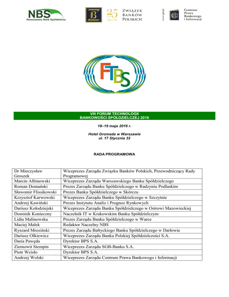VIII FORUM TECHNOLOGII BANKOWOŚCI SPÓŁDZIELCZEJ 2016 18–19 maja 2016 r. Hotel Gromada w Warszawie ul. 17 Stycznia 32 RADA PROGRAMOWA Dr Mieczysław Groszek Marcin Albinowski Roman Domański Sławomir Flissikowski Krzysztof Karwowski Andrzej Kawiński Dariusz Kołodziejski Dominik Konieczny Lidia Malinowska Maciej Małek Ryszard Mroziński Dariusz Olkiewicz Daria Pawęda Ziemowit Stempin Piotr Wcisło Andrzej Wolski Wiceprezes Zarządu Związku Banków Polskich, Przewodniczący Rady Programowej Wiceprezes Zarządu Warszawskiego Banku Spółdzielczego Prezes Zarządu Banku Spółdzielczego w Radzyniu Podlaskim Prezes Banku Spółdzielczego w Skórczu Wiceprezes Zarządu Banku Spółdzielczego w Szczytnie Prezes Instytutu Analiz i Prognoz Rynkowych Wiceprezes Zarządu Banku Spółdzielczego w Ostrowi Mazowieckiej Naczelnik IT w Krakowskim Banku Spółdzielczym Prezes Zarządu Banku Spółdzielczego w Warce Redaktor Naczelny NBS Prezes Zarządu Bałtyckiego Banku Spółdzielczego w Darłowie Wiceprezes Zarządu Banku Polskiej Spółdzielczości S.A. Dyrektor BPS S.A. Wiceprezes Zarządu SGB-Banku S.A. Dyrektor BPS S.A. Wiceprezes Zarządu Centrum Prawa Bankowego i Informacji PROGRAM I DZIEŃ – ŚRODA 18 MAJA 2016 R. 9.00 – 9.30 Rejestracja 9.30 – 10.20 Otwarcie konferencji Powitanie: Andrzej Wolski, Wiceprezes Zarządu Centrum Prawa Bankowego i Informacji Wystąpienie otwierające VIII Forum Technologii Bankowości Spółdzielczej – dr Mieczysław Groszek, Wiceprezes Związku Banków Polskich Przedstawiciel Ministerstwa Cyfryzacji (TBC) 10.20 – 10.50 Wizja rozwoju technologii informatycznych w bankach spółdzielczych w opinii zrzeszeń banków spółdzielczych Ziemowit Stempin, Wiceprezes Zarządu SGB-Banku S.A. (Spółdzielcza Grupa Bankowa) Dariusz Olkiewicz, Wiceprezes Zarządu Banku Polskiej Spółdzielczości S.A. 10.50 – 12.30 SESJA I Digitalizacja gospodarki i realizacja zadań sektora publicznego źródłem przychodów banków. Jak zwiększyć przychody banków spółdzielczych? 12.30 – 13.00 Inwestycja w nowe technologie nie musi być postrzegana jako koszt, jeżeli wdrażane rozwiązanie przyniesie Bankowi nowych klientów. Czy sektor banków spółdzielczych może być partnerem dla Administracji Publicznej? Czy będzie w stanie obsługiwać globalnych klientów, którzy oczekują takiej samej oferty w każdym miejscu Polski? Jakie wspólne działania i jakie rozwiązania trzeba wdrożyć, aby pozyskać nowych klientów. Jak zwiększyć umiejętności sprzedażowe banku spółdzielczego. Czy automatyzacja procesów na poziomie zrzeszenia, stworzenie Centrum Usług Wspólnych, rozwiązania CRM, Big Data, bankowość mobilna, zwiększą przychody lokalnego banku spółdzielczego? Wystąpienia wprowadzające Nowoczesny Katalog Produktów Bankowych (CUBE.ITG) Wystąpienie II (RedHat) Bankowość internetowa aktywnym kanałem komunikacji z klientem, Asseco Poland S.A. Panel dyskusyjny Moderator: Andrzej Kawiński – Prezes Instytutu Analiz i Prognoz Rynkowych Uczestnicy: Przedstawiciel Ministerstwa Rozwoju (TBC) Ziemowit Stempin, Wiceprezes Zarządu SGB-Banku S.A. (Spółdzielcza Grupa Bankowa) Dariusz Olkiewicz, Wiceprezes Zarządu Banku Polskiej Spółdzielczości S.A. Przedstawiciel Banku Spółdzielczego z grupy BPS Przedstawiciel Banku Spółdzielczego z grupy SGB-Banku S.A. Rozmowy kuluarowe – przerwa na kawę 13.00 – 14.45 SESJA II Nowości w ofercie technologicznej dla bankowości spółdzielczej Każdy rok przynosi nowe rozwiązania produktowe w bankach. Podczas tej sesji przyjrzymy się kilku rozwiązaniom dostrzeżonym w ostatnim czasie na rynku i uznanych za ciekawe. Skoro sprawdziły się w jednym banku, może warto je zaoferować klientom w innych częściach Polski? Prelegenci: Płatności mobilne HCE, IT-CARD Nowoczesne sposoby autoryzacji transakcji w bankowości, SoftNet Optymalizacja infrastruktury IT na przykładach, Krzysztof Wilczyński, HUAWEI 14.45 – 15.30 Lunch 15.30 – 17.35 SESJA III Zmiany regulacyjne w obszarze rachunków bankowych Bezpieczeństwo klientów bankowości elektronicznej jest coraz większym wyzwaniem. Również KNF w ostatnich miesiącach wydaje rekomendacje potwierdzające istotę tego zagadnienia. Jednym z elementów walki z cyberprzestępcami jest eliminacja możliwości wyprowadzenia pieniędzy z banku. Przestępcy w tym celu wykorzystują pośredników (słupy). Jakie zmiany regulacyjne pomogą bankom w eliminacji lub blokowaniu rachunków nieaktywnych. Krajowa Izba Rozliczeniowa rozbudowuje funkcjonalność aplikacji Ognivo. Jakie nowe cechy będą zaoferowane bankom spółdzielczym? Jak przygotować się technologicznie do podłączenia do systemu Ognivo 2. Wystąpienia wprowadzające: Przedstawiciel BIK Przedstawiciel ZBP Centralna informacja o rachunkach uśpionych - nowa funkcjonalność usługi Ognivo, Maja Markiewicz, dyrektor Linii biznesowej usługi Ognivo, Krajowa Izba Rozliczeniowa S.A. Przedstawiciel Sygnity Panel dyskusyjny Uczestnicy: Krzysztof Karwowski – Wiceprezes Zarządu Banku Spółdzielczego w Szczytnie Przedstawiciel Zrzeszenia Przedstawiciel Związku Banków Polskich Przedstawiciel KIR 17.35 – 17.45 Losowanie atrakcyjnych nagród 20.00 Gala wręczenia nagród Krajowego Rankingu „Wyróżniające się banki spółdzielcze” miesięcznika „Nowoczesny Bank Spółdzielczy” z udziałem gościa honorowego Obchody 25-lecia Związku Banków Polskich – wręczenie medali Kopernika – przedstawiciel zarządu Związku Banków Polskich II DZIEŃ – CZWARTEK 19 MAJA 2016 R. 10.00 – 10.20 Wystąpienie Gościa Specjalnego 10.20 – 12.20 SESJA IV: Bezpieczeństwo klientów bankowości elektronicznej – cyberzagrożenia Banki jako instytucje zaufania publicznego muszą zwrócić szczególną uwagę na bezpieczeństwo swoich klientów. Zabezpieczenie komunikacji z klientom będzie kolejnym dużym wyzwaniem. Jakie działania będą podejmowane przez banki celem zabezpieczenia użytkowników
