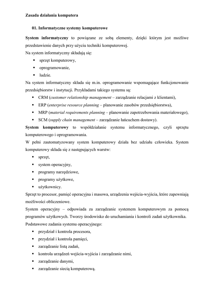 Zasada działania komputera 01. Informatyczne systemy komputerowe System informatyczny to powiązane ze sobą elementy, dzięki którym jest możliwe przedstawienie danych przy użyciu techniki komputerowej. Na system informatyczny składają się: sprzęt komputerowy, oprogramowanie, ludzie. Na system informatyczny składa się m.in. oprogramowanie wspomagające funkcjonowanie przedsiębiorstw i instytucji. Przykładami takiego systemu są: CRM (customer relationship management – zarządzanie relacjami z klientami), ERP (enterprise resource planning – planowanie zasobów przedsiębiorstwa), MRP (material requirements planning – planowanie zapotrzebowania materiałowego), SCM (supply chain management – zarządzanie łańcuchem dostawy). System komputerowy to współdziałanie systemu informatycznego, czyli sprzętu komputerowego i oprogramowania. W pełni zautomatyzowany system komputerowy działa bez udziału człowieka. System komputerowy składa się z następujących warstw: sprzęt, system operacyjny, programy narzędziowe, programy użytkowe, użytkownicy. Sprzęt to procesor, pamięć operacyjna i masowa, urządzenia wejścia-wyjścia, które zapewniają możliwości obliczeniowe. System operacyjny – odpowiada za zarządzanie systemem komputerowym za pomocą programów użytkowych. Tworzy środowisko do uruchamiania i kontroli zadań użytkownika. Podstawowe zadania systemu operacyjnego: przydział i kontrola procesora, przydział i kontrola pamięci, zarządzanie listą zadań, kontrola urządzeń wejścia-wyjścia i zarządzanie nimi, zarządzanie danymi, zarządzanie siecią komputerową. Zasada działania komputera Przykłady systemów operacyjnych: Microsoft Windows Linux Novell Apple Android Oprogramowanie narzędziowe – odpowiada za zarządzanie zasobami sprzętowymi poprzez interfejsy użytkowe do zarządzania pamięcią komputera, obróbki plików, diagnozowania i konfigurowania komputera. Oprogramowanie użytkowe to programy mające zastosowanie jako konkretne oprogramowanie: edytory, arkusze kalkulacyjne, bazy danych. Dzięki nim można rozwiązywać problemy obliczeniowe zadane przez użytkownika. Użytkownicy to ludzie lub komputery. Mają bezpośredni kontakt z oprogramowaniem użytkowym.