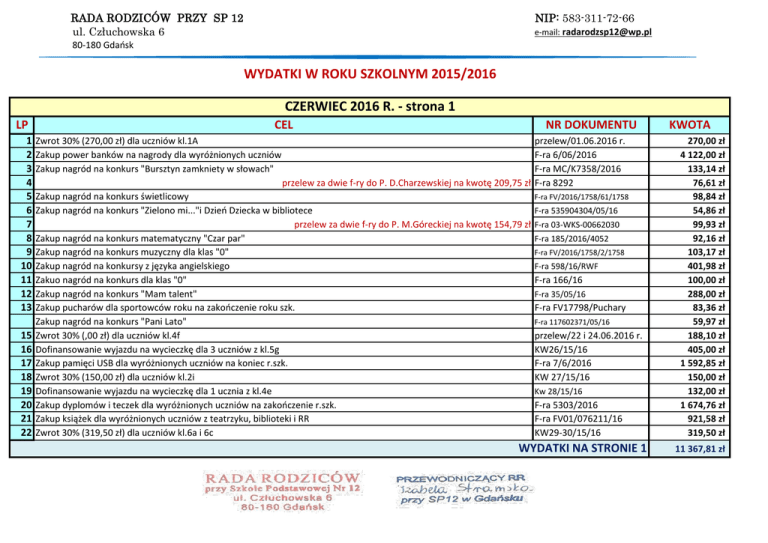 RADA RODZICÓW PRZY SP 12 ul. Człuchowska 6 NIP: 583-311-72-66 e-mail: [email protected] 80-180 Gdańsk WYDATKI W ROKU SZKOLNYM 2015/2016 CZERWIEC 2016 R. - strona 1 LP 1 2 3 4 5 6 7 8 9 10 11 12 13 15 16 17 18 19 20 21 22 CEL Zwrot 30% (270,00 zł) dla uczniów kl.1A Zakup power banków na nagrody dla wyróżnionych uczniów Zakup nagród na konkurs "Bursztyn zamkniety w słowach" NR DOKUMENTU przelew/01.06.2016 r. F-ra 6/06/2016 F-ra MC/K7358/2016 przelew za dwie f-ry do P. D.Charzewskiej na kwotę 209,75 zł F-ra 8292 Zakup nagród na konkurs świetlicowy Zakup nagród na konkurs "Zielono mi..."i Dzień Dziecka w bibliotece przelew za dwie f-ry do P. M.Góreckiej na kwotę 154,79 zł Zakup nagród na konkurs matematyczny "Czar par" Zakup nagród na konkurs muzyczny dla klas "0" Zakup nagród na konkursy z języka angielskiego Zakuo nagród na konkurs dla klas "0" Zakup nagród na konkurs "Mam talent" Zakup pucharów dla sportowców roku na zakończenie roku szk. Zakup nagród na konkurs "Pani Lato" Zwrot 30% (,00 zł) dla uczniów kl.4f Dofinansowanie wyjazdu na wycieczkę dla 3 uczniów z kl.5g Zakup pamięci USB dla wyróżnionych uczniów na koniec r.szk. Zwrot 30% (150,00 zł) dla uczniów kl.2i Dofinansowanie wyjazdu na wycieczkę dla 1 ucznia z kl.4e Zakup dyplomów i teczek dla wyróżnionych uczniów na zakończenie r.szk. Zakup książek dla wyróżnionych uczniów z teatrzyku, biblioteki i RR Zwrot 30% (319,50 zł) dla uczniów kl.6a i 6c F-ra FV/2016/1758/61/1758 F-ra 535904304/05/16 F-ra 03-WKS-00662030 F-ra 185/2016/4052 F-ra FV/2016/1758/2/1758 F-ra 598/16/RWF F-ra 166/16 F-ra 35/05/16 F-ra FV17798/Puchary F-ra 117602371/05/16 przelew/22 i 24.06.2016 r. KW26/15/16 F-ra 7/6/2016 KW 27/15/16 Kw 28/15/16 F-ra 5303/2016 F-ra FV01/076211/16 KW29-30/15/16 WYDATKI NA STRONIE 1 KWOTA 270,00 zł 4 122,00 zł 133,14 zł 76,61 zł 98,84 zł 54,86 zł 99,93 zł 92,16 zł 103,17 zł 401,98 zł 100,00 zł 288,00 zł 83,36 zł 59,97 zł 188,10 zł 405,00 zł 1 592,85 zł 150,00 zł 132,00 zł 1 674,76 zł 921,58 zł 319,50 zł 11 367,81 zł RADA RODZICÓW PRZY SP 12 ul. Człuchowska 6 NIP: 583-311-72-66 e-mail: [email protected] 80-180 Gdańsk WYDATKI W ROKU SZKOLNYM 2015/2016 CZERWIEC 2016 R. - strona 2 LP 23 24 25 26 27 28 29 30 31 32 33 34 35 36 37 38 39 40 41 42 43 44 CEL Dofinansowanie do balu klas szóstych dla ucznia z kl.6e Zwrot 30% i nagrody za zajęcie II msc we wpłatach na fundusz RR dla klas 1d i 04 Zwrot 30% i nagrody za zajęcie I i III msc we wpłatach na fundusz RR dla klas 1f;5g;5c;2h;3d;09;1a i 1i Zapłata za znakowanie power banków zakupionych na zak.r.szk. Zakup podziękowania na deseczce dla p.Harapkiewicza na zak.r.szk. Zakup kwiatów na zak.r.szk. dla P.Dyrektor, P.Kierownik i P.Sekretarki (wręczone przez uczniów) Stypendium jednorazowe dla Ucznia Roku Zabezpieczenie medyczne uroczystości zakończenia r.szk. (cały dzień) Prowadzenie rachunku Opłaty za przelew Opłata za kartę i sms autoryzacyjny NR DOKUMENTU KW 31/15/16 KW 32-33/15/16 KW 34-41/15/16 F-ra 23/6/16 F-ra F-ra 77/O/2016 KW 42/15/16 F-ra 80/16 opłaty za VI/2016 Opłata za 12 przelewów opłaty za VI/2016 KWOTA 130,00 zł 266,50 zł 725,00 zł 368,63 zł 33,16 zł 90,00 zł 200,00 zł 276,89 zł 25,00 zł 12,00 zł 6,19 zł WYDATKI NA STRONIE 2 2 133,37 zł Razem wydatki VI/2016: 13 501,18 zł
