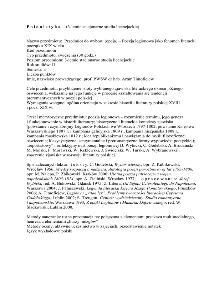 Polonistyka (3-letnie stacjonarne studia licencjackie) Nazwa przedmiotu: Przedmiot do wyboru (opcja) – Poezja legionowa jako fenomen literacki początku XIX wieku Kod przedmiotu Typ przedmiotu: ćwiczenia (30 godz.) Poziom przedmiotu: 3-letnie stacjonarne studia licencjackie Rok studiów: II Semestr: 3 Liczba punktów Imię, nazwisko prowadzącego: prof. PWSW dr hab. Artur Timofiejew Cele przedmiotu: przybliŜenie istoty wybranego zjawiska literackiego okresu późnego oświecenia, wskazanie na jego funkcję w procesie kształtowania się tendencji preromantycznych w poezji polskiej Wymagania wstępne: ogólna orientacja w zakresie historii i literatury polskiej XVIII i pocz. XIX w. Treści merytoryczne przedmiotu: poezja legionowa – rozumienie terminu, jego geneza i funkcjonowanie w historii literatury; historyczne i literackie konteksty zjawiska (powstanie i czyn zbrojny Legionów Polskich we Włoszech 1797-1802, powstanie Księstwa Warszawskiego 1807 r. i kampania galicyjska 1809 r., kampania hiszpańska 1808 r., kampania moskiewska 1812 r.; idea republikanizmu i nawiązania do myśli filozoficznej oświecenia; klasycystyczne, sentymentalne i preromantyczne formy wypowiedzi poetyckiej); „reportaŜowy” i refleksyjny nurt poezji legionowej (J. Wybicki, C. Godebski, A. Brodziński, M. Molski, F. Morawski, W. Reklewski, J. Świderski, W. Turski, A. Wybranowski); znaczenie zjawiska w rozwoju literatury polskiej Spis zalecanych lektur: t e k s t y: C. Godebski, Wybór wierszy, opr. Z. Kubikowski, Wrocław 1956; Między rozpaczą a nadzieją. Antologia poezji porozbiorowej lat 1793-1806, opr. M. Nalepa, P. śbikowski, Kraków 2006; Ulotna poezja patriotyczna wojen napoleońskich 1805-1814, opr. A. Zieliński, Wrocław 1977; o p r a c o w a n i a: Józef Wybicki, red. A. Bukowski, Gdańsk 1975; Z. Libera, Od Sejmu Czteroletniego do Napoleona, Warszawa 2004; J. Paluszewski, Legenda literacka księcia Józefa Poniatowskiego, Pruszków 2006; A. Timofiejew, Legiony i „vitae lex”. Problemy twórczości literackiej Cypriana Godebskiego, Lublin 2002; S. Treugutt, Geniusz wydziedziczony. Studia romantyczne i napoleońskie, Warszawa 1993; Z epoki Legionów i Mazurka Dąbrowskiego, red. W. Śladkowski, Lublin 2000. Metody nauczania: ustna prezentacja tez połączona z elementami przekazu multimedialnego, heureza z elementami „burzy mózgów” Metody oceny: aktywne uczestnictwo w zajęciach, przedstawienie notatek Język wykładowy: polski