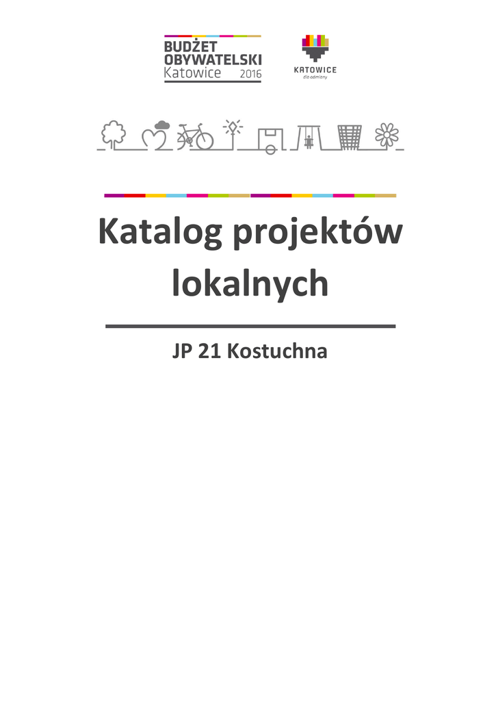 Katalog projektów lokalnych JP 21 Kostuchna Numer ID za pomocą którego będziesz głosować: L/1/21/2015 Zakup nowości książkowych + wymiana wykładziny podłogowej o wysokiej klasie ścieralności LOKALIZACJA ZADANIA Miejska Biblioteka Publiczna, Filia 27, ul. Szarych Szeregów 62 KWOTA ZADANIA 40 000,00 zł SKRÓCONY OPIS ZADANIA Zakup nowości książkowych, wymiana bardzo zniszczonej wykładziny podłogowej w lokalu biblioteki. WNIOSKODAWCA Marta Bywalec KONTAKT 691 952 289 [email protected] Numer ID za pomocą którego będziesz głosować: L/2/21/2015 Doposażenie klas lekcyjnych I-III w nowoczesne meble i sprzęt multimedialny w formie tablic interaktywnych i sprzęt ICT LOKALIZACJA ZADANIA Szkoła Podstawowa nr 29, ul. Lepszego 2 KWOTA ZADANIA 64 300,00 zł SKRÓCONY OPIS ZADANIA Szkoła nowoczesnych technologii - doposażenie pomieszczeń klasowych w sprzęt multimedialny w formie tablic interaktywnych i sprzęt ICT oraz nowoczesne meble. WNIOSKODAWCA Łukasz Jakóbiński KONTAKT 603 943 561 [email protected] Numer ID za pomocą którego będziesz głosować: L/4/21/2015 Muzyczny Festyn na Wakacje - Kostuchna 2016 LOKALIZACJA ZADANIA ul. T. Boya-Żeleńskiego 96 KWOTA ZADANIA 45 000,00 zł SKRÓCONY OPIS ZADANIA Projekt zakłada wykorzystanie istniejącego już potencjału kulturalnego w Kostuchnie i przedstawienie go wszystkim mieszkańcom dzielnicy. Organizujemy imprezę środowiskową, której zadaniem jest międzypokoleniowa integracja i wspólne świętowanie obchodów 70-lecia Zespołu Szkół nr 4 im. Tomasza Klenczara. Zapraszamy do wspólnej zabawy na koncercie zespołu o ugruntowanej pozycji na rynku muzycznym. Zakładamy też zaproszenie zespołu związanego ze scena lokalną, a przed gwiazdami wieczoru swoją twórczość prezentowałyby młode składy z Kostuchny i okolic. Planujemy termin festynu na czerwiec 2016 - przy dobrej pogodzie i dobrym śląskim jedzeniu podsumujemy rok szkolny 2016. Rozegramy mecze siatkówki i piłki nożnej. Projekt festiwalu ma również przed sobą spore możliwości w kwestii przyszłego rozwoju oraz zapisanie się na stałe w kalendarzu imprez Kostuchny jako muzyczne świętowanie zakończenia roku szkolnego. WNIOSKODAWCA Rita Pawłowska KONTAKT 506 059 161 [email protected] Numer ID za pomocą którego będziesz głosować: L/5/21/2015 Przebudowa drogi i parkingu przy budynku wielorodzinnym ul. T. B. Żeleńskiego 103 LOKALIZACJA ZADANIA ul. T.B. Żeleńskiego 103 (w okolicy dawny "REMAG") KWOTA ZADANIA 298 474,00 zł SKRÓCONY OPIS ZADANIA Rewitalizacja terenu przy budynku B. Żeleńskiego 103 polega na odsunięciu drogi i miejsc postojowych od okien budynku wielorodzinnego i placu zabaw. Realizacja tego zadania pozwoli na ekologiczne spędzanie czasu wolnego na ławeczkach przed budynkiem, a co najważniejsze na bezpieczny wypoczynek dzieci na placu zabaw, przy którym w chwili obecnej parkują samochody. Zlikwiduje błotne kałuże na drodze, która znajduje się przy budynku w odległości 1,5m od okien budynku. Podniesie walory estetyczne terenu. WNIOSKODAWCA Kazimierz Kasprzak KONTAKT 32 209 45 04 Numer ID za pomocą którego będziesz głosować: L/6/21/2015 Sfinansowanie działań na rzecz edukacji regionalnej "Śląsk - jestem dumny" przeznaczone dla uczniów i absolwentów Gimnazjum nr 18 im. Józefa Nowary jako organizatora projektu LOKALIZACJA ZADANIA Gimnazjum nr 18, ul. Wantuły 11 KWOTA ZADANIA 11 900,00 zł SKRÓCONY OPIS ZADANIA Naszym zadaniem, w czasach ogólnej globalizacji jest przekazanie młodemu pokoleniu i społeczności lokalnej całej spuścizny przodków. Szczególnie ważnym zadaniem jest wyposażenie młodego pokolenia w szeroki zasób wiedzy o własnym regionie obejmujący wiele dziedzin: kulturową, historyczną, geograficzną, społeczną. Działania na rzecz edukacji regionalnej "Śląsk - jestem dumny" adresowane są do środowiska szkolnego Gimnazjum nr 18 im. Józefa Nowary jako organizatora. Zdobycie odznaki "Znam Katowice", "Krajoznawczej Odznaki Górnośląskiej", uczestniczenie w lekcjach gwary śląskiej i śpiewu, warsztatach twórczości ludowej i spotkań z ciekawymi ludźmi, również mieszkańcami dzielnicy Kostuchna, stwarza możliwość wzbogacania przez uczestników szeroko pojętej wiedzy na temat własnego regionu. Uczy poszanowania własnego dziedzictwa kulturowego, tradycji, ludzi z nim związanych. Organizowanie konkursów o tematyce regionalnej, plenerów fotograficznych imprez środowiskowych pozwoli zaprezentować region innym. Realizacja projektu - otwartość szkoły, współpraca z rodzicami z szeroko pojętym środowiskiem lokalnym ukształtuje postawy patriotyzmu lokalnego, postawy otwartości wobec świata i ludzi. WNIOSKODAWCA Gabriela Przyłucka KONTAKT 32 20 29 114 Numer ID za pomocą którego będziesz głosować: L/7/21/2015 Remont Izby Regionalnej w Gimnazjum nr 18 w Katowicach LOKALIZACJA ZADANIA Gimnazjum nr 18 im. Józefa Nowary, ul. Wantuły 11 KWOTA ZADANIA 17 200,00 zł SKRÓCONY OPIS ZADANIA "Izba regionalna" stwarza możliwość wzbogacania przez uczniów i mieszkańców szeroko pojętej wiedzy na temat własnego regionu. Uczy poszanowania własnego dziedzictwa kulturowego, tradycji, ludzi z nim związanych. Pozwoli zgromadzić, i zachować pamiątki po przodkach, a treści w nich zawarte ułatwiają zrozumienie własnego regionu i stworzą możliwość zaprezentowania regionu innym. Izba będzie miejscem dostępnym dla szeroko pojętego środowiska szkolnego Gimnazjum nr 18 im Józefa Nowary w Katowicach. WNIOSKODAWCA Gabriela Przyłucka KONTAKT 32 20 29 114 Numer ID za pomocą którego będziesz głosować: L/8/21/2015 Przebudowa ulicy Tymiankowej LOKALIZACJA ZADANIA ul. Tymiankowa od nr 3 do nr 61 KWOTA ZADANIA 620 000,00 zł SKRÓCONY OPIS ZADANIA Ulica Tymiankowa od skrzyżowania z ul. Szarych Szeregów do wysokości budynku Tymiankowa 3 jest ulicą miejską o nawierzchni asfaltowej. Część ul. Tymiankowej od wysokości budynku nr 3 do placu 