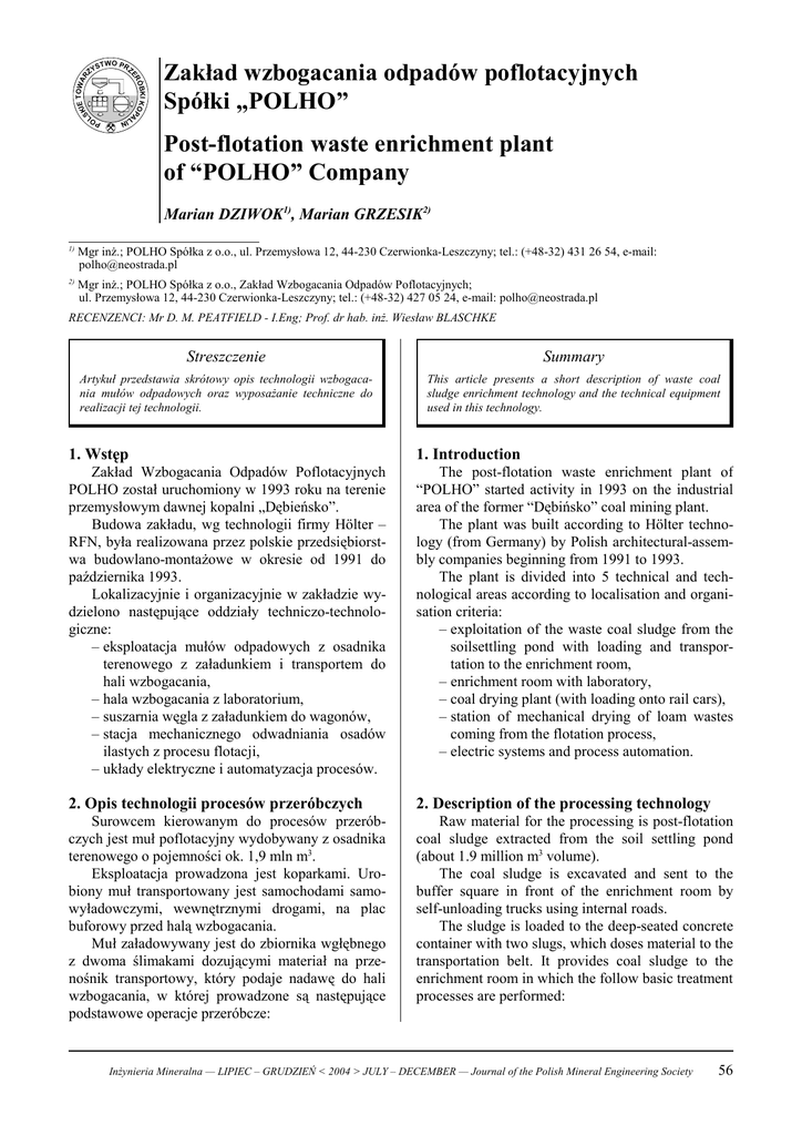 TWO PR Z IE TOWAR SK ÓBKI KOPA ER S ZY Zakład wzbogacania odpadów poflotacyjnych Spółki „POLHO” N LI PO L Post-flotation waste enrichment plant of “POLHO” Company Marian DZIWOK1), Marian GRZESIK2) 1) Mgr inż.; POLHO Spółka z o.o., ul. Przemysłowa 12, 44-230 Czerwionka-Leszczyny; tel.: (+48-32) 431 26 54, e-mail: [email protected] 2) Mgr inż.; POLHO Spółka z o.o., Zakład Wzbogacania Odpadów Poflotacyjnych; ul. Przemysłowa 12, 44-230 Czerwionka-Leszczyny; tel.: (+48-32) 427 05 24, e-mail: [email protected] RECENZENCI: Mr D. M. PEATFIELD - I.Eng; Prof. dr hab. inż. Wiesław BLASCHKE Streszczenie Summary Artykuł przedstawia skrótowy opis technologii wzbogacania mułów odpadowych oraz wyposażanie techniczne do realizacji tej technologii. This article presents a short description of waste coal sludge enrichment technology and the technical equipment used in this technology. 1. Wstęp 1. Introduction Zakład Wzbogacania Odpadów Poflotacyjnych POLHO został uruchomiony w 1993 roku na terenie przemysłowym dawnej kopalni „Dębieńsko”. Budowa zakładu, wg technologii firmy Hölter – RFN, była realizowana przez polskie przedsiębiorstwa budowlano-montażowe w okresie od 1991 do października 1993. Lokalizacyjnie i organizacyjnie w zakładzie wydzielono następujące oddziały techniczo-technologiczne: – eksploatacja mułów odpadowych z osadnika terenowego z załadunkiem i transportem do hali wzbogacania, – hala wzbogacania z laboratorium, – suszarnia węgla z załadunkiem do wagonów, – stacja mechanicznego odwadniania osadów ilastych z procesu flotacji, – układy elektryczne i automatyzacja procesów. The post-flotation waste enrichment plant of “POLHO” started activity in 1993 on the industrial area of the former “Dębińsko” coal mining plant. The plant was built according to Hölter technology (from Germany) by Polish architectural-assembly companies beginning from 1991 to 1993. The plant is divided into 5 technical and technological areas according to localisation and organisation criteria: – exploitation of the waste coal sludge from the soilsettling pond with loading and transportation to the enrichment room, – enrichment room with laboratory, – coal drying plant (with loading onto rail cars), – station of mechanical drying of loam wastes coming from the flotation process, – electric systems and process automation. 2. Opis technologii procesów przeróbczych 2. Description of the processing technology Surowcem kierowanym do procesów przeróbczych jest muł poflotacyjny wydobywany z osadnika terenowego o pojemności ok. 1,9 mln m3. Eksploatacja prowadzona jest koparkami. Urobiony muł transportowany jest samochodami samowyładowczymi, wewnętrznymi drogami, na plac buforowy przed halą wzbogacania. Muł załadowywany jest do zbiornika wgłębnego z dwoma ślimakami dozującymi materiał na przenośnik transportowy, który podaje nadawę do hali wzbogacania, w której prowadzone są następujące podstawowe operacje przeróbcze: Raw material for the processing is post-flotation coal sludge extracted from the soil settling pond (about 1.9 million m3 volume). The coal sludge is excavated and sent to the buffer square in front of the enrichment room by self-unloading trucks using internal roads. The sludge is loaded to the deep-seated concrete container with two slugs, which doses material to the transportation belt. It provides coal sludge to the enrichment room in which the follow basic treatment processes are performed: Inżynieria Mineralna — LIPIEC – GRUDZIEŃ < 2004 > JULY – DECEMBER — Journal of the Polish Mineral Engineering Society 56 – rozmywanie wodą mułu poflotacyjnego w bębnie rozmywającym z jednoczesnym wydzieleniem z nadawy ciał obcych i odpadów o wymiarach powyżej 20 mm, – dwustopniowa klasyfikacja rozmytej nadawy dla wydzielenia klas ziarnowych: – powyżej 3,0 mm traktowana jako odpad, – 3,0 – 0,3 mm kierowana na sita łukowe i przesiewacze wibracyjne celem wstępnego odwodnienia, – 0,3 – 0,0 mm kierowana do procesu wzbogacania flotacyjnego, – dwuproduktowe, dwustopniowe, flotacyjne wzbogacanie klasy 0,3 – 0,0 mm, – odwadnianie koncentratu z flotacji pierwszego stopnia wraz z wydzielonymi ziarnami 3,0 – 0,3 mm z klasyfikacji nadawy na próżniowych filtrach taśmowych (tzw. Koncentrat K-1), – odwadnianie koncentratu z flotacji drugiego stopnia na bębnowych filtrach próżniowych z odbiorem placka przez „przewał” siatki filtracyjnej (tzw. Koncentrat K-2), – całkowite klarowanie wód poflotacyjnych z drugiego stopnia flotacji w zagęszczaczu promieniowym typu Dorra z wkładem lamelowym. Odwodnione koncentraty K-1 i K-2 są składowane na niewielkim zewnętrznym placu składowym w rejonie układu ślimakowego, który dozuje materiał na ciąg przenośników taśmowych do suszarni. Istniejący układ techniczny pozwala na przygotowanie nadawy do suszenia z różnych węgli w kompozycji z koncentratem K-1 i K-2. Suszarnia jest obiektem wolno-stojącym zadaszonym z tzw. boksami dla wysuszonego materiału handlowego. Paleniska suszarni opalane są gazem koksowniczym a oczyszczanie spalin odbywa się w elektrofiltrze o wysokiej sprawności. Bezpośrednio w rejonie suszarni znajduje się stacja załadowcza węgla do wagonów z wagą kolejową firmy Schenck. Wylew z zagęszczacza Dorra jest kierowany do stacji mechanicznego odwadniania w komorowych prasach filtracyjnych. Odwodnione w prasach pozostałości iłowe z procesu flotacji są transportowane samochodami do wybranych przestrzeni osadnikowych celem rekultywacji terenu w ramach istniejącego projektu technicznego rekultywacji. W prowadzonych procesach przeróbczych stosowane są chemiczne środki wspomagające te procesy i tak: – w procesie flotacji stosowane są odczynniki flotacyjne Montanol 505 (prod. RFN) i Flotmix (prod. krajowa) w mieszance o różnych proporcjach a najczęściej w proporcji 1 ÷ 1. 57 – disso