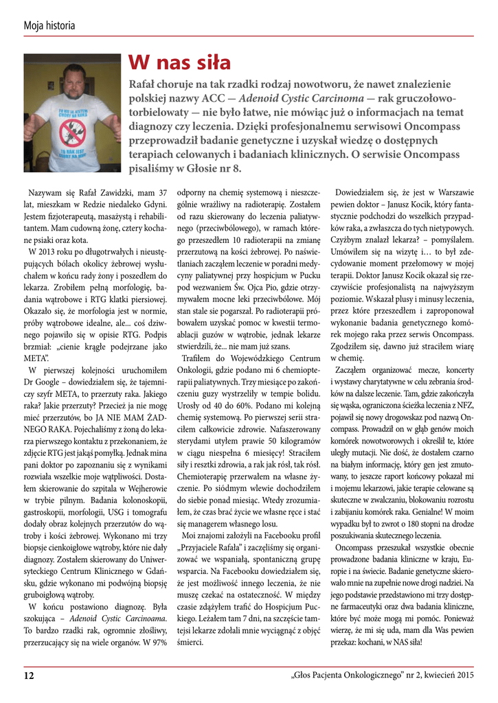 Moja historia w nas siła Rafał choruje na tak rzadki rodzaj nowotworu, że nawet znalezienie polskiej nazwy ACC — Adenoid Cystic Carcinoma — rak gruczołowotorbielowaty — nie było łatwe, nie mówiąc już o informacjach na temat diagnozy czy leczenia. Dzięki profesjonalnemu serwisowi Oncompass przeprowadził badanie genetyczne i uzyskał wiedzę o dostępnych terapiach celowanych i badaniach klinicznych. O serwisie Oncompass pisaliśmy w Głosie nr 8. Nazywam się Rafał Zawidzki, mam 37 lat, mieszkam w Redzie niedaleko Gdyni. Jestem fizjoterapeutą, masażystą i rehabilitantem. Mam cudowną żonę, cztery kochane psiaki oraz kota. W 2013 roku po długotrwałych i nieustępujących bólach okolicy żebrowej wysłuchałem w końcu rady żony i poszedłem do lekarza. Zrobiłem pełną morfologię, badania wątrobowe i RTG klatki piersiowej. Okazało się, że morfologia jest w normie, próby wątrobowe idealne, ale... coś dziwnego pojawiło się w opisie RTG. Podpis brzmiał: „cienie krągłe podejrzane jako META”. W pierwszej kolejności uruchomiłem Dr Google – dowiedziałem się, że tajemniczy szyfr META, to przerzuty raka. Jakiego raka? Jakie przerzuty? Przecież ja nie mogę mieć przerzutów, bo JA NIE MAM ŻADNEGO RAKA. Pojechaliśmy z żoną do lekarza pierwszego kontaktu z przekonaniem, że zdjęcie RTG jest jakąś pomyłką. Jednak mina pani doktor po zapoznaniu się z wynikami rozwiała wszelkie moje wątpliwości. Dostałem skierowanie do szpitala w Wejherowie w trybie pilnym. Badania kolonoskopii, gastroskopii, morfologii, USG i tomografu dodały obraz kolejnych przerzutów do wątroby i kości żebrowej. Wykonano mi trzy biopsje cienkoigłowe wątroby, które nie dały diagnozy. Zostałem skierowany do Uniwersyteckiego Centrum Klinicznego w Gdańsku, gdzie wykonano mi podwójną biopsję gruboigłową wątroby. W końcu postawiono diagnozę. Była szokująca – Adenoid Cystic Carcinoama. To bardzo rzadki rak, ogromnie złośliwy, przerzucający się na wiele organów. W 97% 12 odporny na chemię systemową i nieszczególnie wrażliwy na radioterapię. Zostałem od razu skierowany do leczenia paliatywnego (przeciwbólowego), w ramach którego przeszedłem 10 radioterapii na zmianę przerzutową na kości żebrowej. Po naświetlaniach zacząłem leczenie w poradni medycyny paliatywnej przy hospicjum w Pucku pod wezwaniem Św. Ojca Pio, gdzie otrzymywałem mocne leki przeciwbólowe. Mój stan stale sie pogarszał. Po radioterapii próbowałem uzyskać pomoc w kwestii termoablacji guzów w wątrobie, jednak lekarze stwierdzili, że... nie mam już szans. Trafiłem do Wojewódzkiego Centrum Onkologii, gdzie podano mi 6 chemiopterapii paliatywnych. Trzy miesiące po zakończeniu guzy wystrzeliły w tempie bolidu. Urosły od 40 do 60%. Podano mi kolejną chemię systemową. Po pierwszej serii straciłem całkowicie zdrowie. Nafaszerowany sterydami utyłem prawie 50 kilogramów w ciągu niespełna 6 miesięcy! Straciłem siły i resztki zdrowia, a rak jak rósł, tak rósł. Chemioterapię przerwałem na własne życzenie. Po siódmym wlewie dochodziłem do siebie ponad miesiąc. Wtedy zrozumiałem, że czas brać życie we własne ręce i stać się managerem własnego losu. Moi znajomi założyli na Facebooku profil „Przyjaciele Rafała” i zaczęliśmy się organizować we wspaniałą, spontaniczną grupę wsparcia. Na Facebooku dowiedziałem się, że jest możliwość innego leczenia, że nie muszę czekać na ostateczność. W między czasie zdążyłem trafić do Hospicjum Puckiego. Leżałem tam 7 dni, na szczęście tamtejsi lekarze zdołali mnie wyciągnąć z objęć śmierci. Dowiedziałem się, że jest w Warszawie pewien doktor – Janusz Kocik, który fantastycznie podchodzi do wszelkich przypadków raka, a zwłaszcza do tych nietypowych. Czyżbym znalazł lekarza? – pomyślałem. Umówiłem się na wizytę i… to był zdecydowanie moment przełomowy w mojej terapii. Doktor Janusz Kocik okazał się rzeczywiście profesjonalistą na najwyższym poziomie. Wskazał plusy i minusy leczenia, przez które przeszedłem i zaproponował wykonanie badania genetycznego komórek mojego raka przez serwis Oncompass. Zgodziłem się, dawno już straciłem wiarę w chemię. Zacząłem organizować mecze, koncerty i wystawy charytatywne w celu zebrania środków na dalsze leczenie. Tam, gdzie zakończyła się wąska, ograniczona ścieżka leczenia z NFZ, pojawił się nowy drogowskaz pod nazwą Oncompass. Prowadził on w głąb genów moich komórek nowotworowych i określił te, które uległy mutacji. Nie dość, że dostałem czarno na białym informację, który gen jest zmutowany, to jeszcze raport końcowy pokazał mi i mojemu lekarzowi, jakie terapie celowane są skuteczne w zwalczaniu, blokowaniu rozrostu i zabijaniu komórek raka. Genialne! W moim wypadku był to zwrot o 180 stopni na drodze poszukiwania skutecznego leczenia. Oncompass przeszukał wszystkie obecnie prowadzone badania kliniczne w kraju, Europie i na świecie. Badanie genetyczne skierowało mnie na zupełnie nowe drogi nadziei. Na jego podstawie przedstawiono mi trzy dostępne farmaceutyki oraz dwa badania kliniczne, które być może mogą mi pomóc. Ponieważ wierzę, że mi się uda, mam dla Was pewien przekaz: kochani, w NAS siła! „Głos Pacjenta Onkologicznego” nr 2, kwiecień 2015