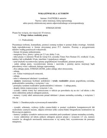 WSKAZÓWKI DLA AUTORÓW Imiona i NAZWISKA autorów Nazwa i adres instytucji, którą reprezentują adres poczty elektronicznej autora odpowiedzialnego za korespondencję STRESZCZENIE Pisane bez wcięcia, nie więcej niż 10 wierszy. 1. Wstęp i dalsze rozdziały pracy 1.1. Podrozdziały Prezentacje (referaty, komunikaty, postery) zostaną wydane w postaci druku zwartego. Artykuły będą reprodukowane w formie otrzymanej przez P.T. Autorów. Prosimy o przygotowanie tekstów według poniższych wskazówek: - format A4 pisany jednostronnie, - marginesy lewy, prawy i górny po 2,5 cm; dolny 3 cm, - tekst pisany w edytorze Word do wersji 6.0, czcionka Times New Roman CE, wielkość 12 pts, indeksy lub wykładniki 10 pts, interlinia 1 (pojedynczy odstęp), - tytuł artykułu wycentrowany (pisany pogrubionymi wersalikami, pismem prostym), - jeden odstęp pusty, wycentrowane imiona i nazwiska i poniżej nazwa instytucji bądź pracodawcy wraz z adresem, którego reprezentują, - dwa odstępy puste, STRESZCZENIE, jeden odstęp, tekst streszczenia, - odstęp, - ew. wykaz ważniejszych oznaczeń, - odstęp, - tekst z włamanymi tabelami i rysunkami, - numery (numeracja liczbami arabskimi) i tytuły rozdziałów pisane pogrubioną czcionką, podrozdziałów normalną, z wcięciem 1 cm, - pomiędzy tytułami rozdziałów (podrozdziałów) i tekstem – 1 odstęp pusty, - akapity tekstu rozpoczynane z wcięciem 1 cm, - rysunki i tabele winny być umieszczone w tekście po powołaniu się na nie i od tekstu z obu stron oddzielone jednym odstępem pustym, - numery i tytuły tabel umieszczone ponad tabelami i pisane normalną czcionką, z wcięciem 1 cm, np.: Tabela 1. Charakterystyka wytworzonych materiałów - rysunki, schematy, wykresy (tylko czarno-białe) w postaci wydruków komputerowych lub wykreślone czarnym tuszem, zdjęcia (również tylko czarno-białe) fotograficzne kontrastowe na błyszczącym papierze, - numery i podpisy rysunków umieszczone centralnie pod rysunkami i pisane normalną czcionką, - wzory oddzielone od tekstu jednym odstępem pustym pisane z wcięciem 2,5 cm, numery wzorów (w okrągłych nawiasach) umieszczone w tej samej linii, wycentrowane do prawego marginesu, - odnośniki literaturowe umieszczone w tekście według kolejności pojawiania się w nim, znaczone liczbami arabskimi w nawiasach kwadratowych, np. [1], [2–4], - wykaz cytowanych źródeł umieszczony na końcu w punkcie Literatura, wg kolejności cytowań w następujący sposób: Literatura 1. Kowalski J.K.: Termodynamika techniczna. WNT, Warszawa 1990 (autor, autorzy: tytuł książki. Wydawnictwo, miejsce i rok wydania) 2. McDow S.R.: Effect of composition and state of organic components on PAHs decay in atmospheric aerosol. Environ. Sci. Technol., 1994, Vol. 28, 2147–2153 (autor, autorzy: Tytuł artykułu. Skrót tytułu czasopisma, rok, wolumin, numery stron) - strony prosimy ponumerować miękkim ołówkiem, w stopce po lewej jej stronie, - maksymalna objętość tekstu (wraz z tabelami i rysunkami) – 10 stron referaty i 8 stron komunikaty i postery; prosimy o zachowanie parzystej liczby stron, - obowiązuje stosowanie jednostek wg układu SI oraz terminologii przyjętej w Polsce. Materiały opracowane według powyższych zaleceń proszę przesłać do 11 kwietnia br. na adres poczty elektronicznej: [email protected] oraz jeden egzemplarz wydruku na adres: Mgr inż. Elżbieta Szmigielska Politechnika Wrocławska, Instytut Inżynierii Ochrony Środowiska Wybrzeże S. Wyspiańskiego 27 50-370 WROCŁAW