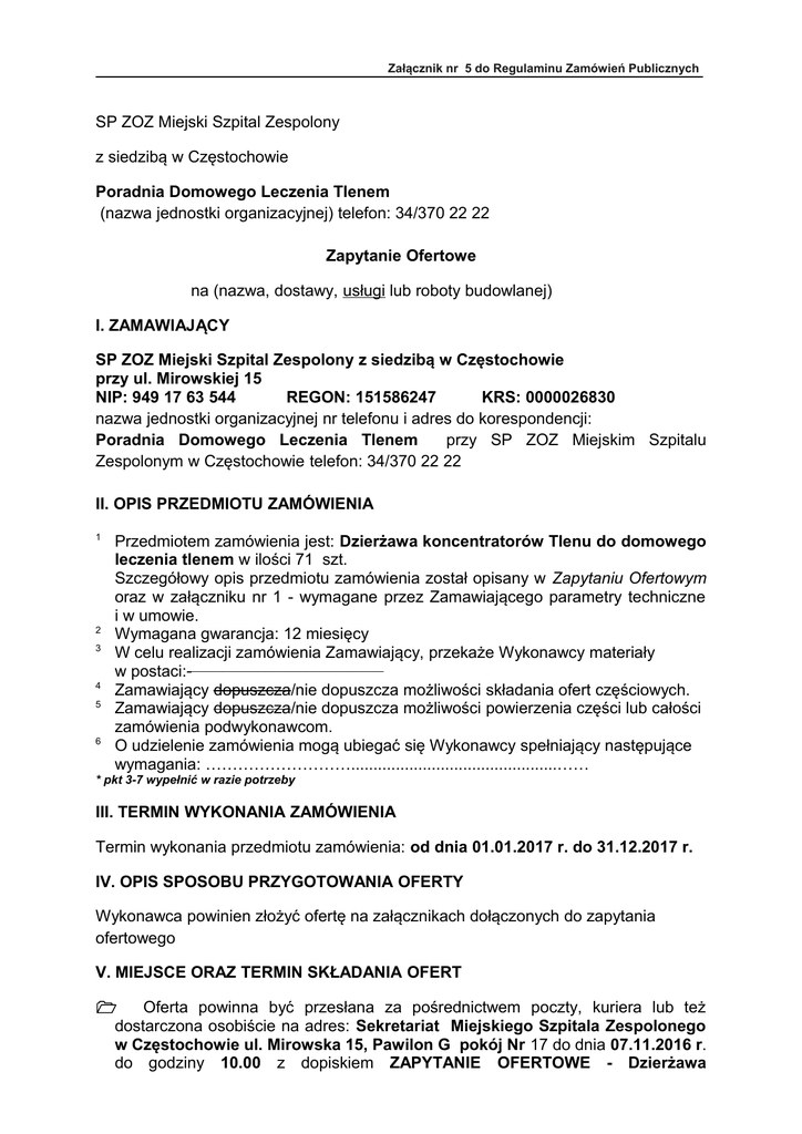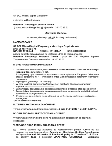 Załącznik nr 5 do Regulaminu Zamówień Publicznych SP ZOZ Miejski Szpital Zespolony z siedzibą w Częstochowie Poradnia Domowego Leczenia Tlenem (nazwa jednostki organizacyjnej) telefon: 34/370 22 22 Zapytanie Ofertowe na (nazwa, dostawy, usługi lub roboty budowlanej) I. ZAMAWIAJĄCY SP ZOZ Miejski Szpital Zespolony z siedzibą w Częstochowie przy ul. Mirowskiej 15 NIP: 949 17 63 544 REGON: 151586247 KRS: 0000026830 nazwa jednostki organizacyjnej nr telefonu i adres do korespondencji: Poradnia Domowego Leczenia Tlenem przy SP ZOZ Miejskim Szpitalu Zespolonym w Częstochowie telefon: 34/370 22 22 II. OPIS PRZEDMIOTU ZAMÓWIENIA 1 2 3 4 5 6 Przedmiotem zamówienia jest: Dzierżawa koncentratorów Tlenu do domowego leczenia tlenem w ilości 71 szt. Szczegółowy opis przedmiotu zamówienia został opisany w Zapytaniu Ofertowym oraz w załączniku nr 1 - wymagane przez Zamawiającego parametry techniczne i w umowie. Wymagana gwarancja: 12 miesięcy W celu realizacji zamówienia Zamawiający, przekaże Wykonawcy materiały w postaci: _____________________________________ Zamawiający dopuszcza/nie dopuszcza możliwości składania ofert częściowych. Zamawiający dopuszcza/nie dopuszcza możliwości powierzenia części lub całości zamówienia podwykonawcom. O udzielenie zamówienia mogą ubiegać się Wykonawcy spełniający następujące wymagania: ………………………..............................................…… * pkt 3-7 wypełnić w razie potrzeby III. TERMIN WYKONANIA ZAMÓWIENIA Termin wykonania przedmiotu zamówienia: od dnia 01.01.2017 r. do 31.12.2017 r. IV. OPIS SPOSOBU PRZYGOTOWANIA OFERTY Wykonawca powinien złożyć ofertę na załącznikach dołączonych do zapytania ofertowego V. MIEJSCE ORAZ TERMIN SKŁADANIA OFERT 1 Oferta powinna być przesłana za pośrednictwem poczty, kuriera lub też dostarczona osobiście na adres: Sekretariat Miejskiego Szpitala Zespolonego w Częstochowie ul. Mirowska 15, Pawilon G pokój Nr 17 do dnia 07.11.2016 r. do godziny 10.00 z dopiskiem ZAPYTANIE OFERTOWE - Dzierżawa koncentratorów tlenu do domowego leczenia tlenem przy SP ZOZ Miejskim Szpitalu Zespolonym z siedzibą w Częstochowie. 2 Oferty złożone po terminie nie będą rozpatrywane. 3 Wykonawca może przed upływem terminu składania ofert zmienić lub wycofać swoją ofertę. 4 W toku badania i oceny ofert Zamawiający może żądać od Wykonawców wyjaśnień dotyczących treści złożonych ofert. 5 Zapytanie ofertowe zamieszczono na stronie: www.zsm.czest.pl w dniu 24.10.2016 r. VI. OCENA OFERT Zamawiający dokona oceny ważnych ofert na podstawie następujących kryteriów: -cena -100% VII. INFORMACJE DOTYCZĄCE WYBORU NAJKORZYSTNIEJSZEJ OFERTY O wyborze najkorzystniejszej oferty Zamawiający zawiadomi Wykonawców za pośrednictwem strony internetowej znajdującej się pod adresem: zsm.czest.pl zakładka zapytania ofertowe VIII. DODATKOWE INFORMACJE Dodatkowych informacji udziela Kierownik Ośrodka Domowego Leczenia Tlenem w Częstochowie - Grzegorz Bzdon pod numerem telefonu 34/370 22 63 IX. ZAŁĄCZNIKI - Zapytanie ofertowe - Zestawienie parametrów technicznych koncentratorów. - Projekt umowy. ZATWIEDZAM: Dyrektor Wojciech Konieczny ZAPYTANIE OFERTOWE DOTYCZY ZAMÓWIENIA PUBLICZNEGO O WARTOŚCI PONIŻEJ 30.000 € (zgodnie z art. 4 pkt 8 ustawy z dnia 29 stycznia 2004 r. – Prawo zamówień publicznych (tekst jednolity: Dz. U. z 2015 r., poz. 2164 z póżn. zm.), Dyrekcja SP ZOZ Miejskiego Szpitala Zespolonego z siedzibą w Częstochowie przy ul. Mirowskiej 15, zwraca się z prośbą o przygotowanie oferty cenowej dla Ośrodka Domowego Leczenia Tlenem na: Dzierżawę koncentratorów tlenu do domowego leczenia tlenem I. PRZEDMIOT ZAMÓWIENIA 1. Przedmiotem zamówienia jest: dzierżawa koncentratorów tlenu do domowego leczenia tlenem w ilości 71 szt. 2. Szczegółowy opis przedmiotu zamówienia wraz z podaniem wymaganych przez Zamawiającego parametrów technicznych określony został w załączniku nr 1 do Zapytania ofertowego. 3. Wykonawca ma obowiązek do zaoferowanego sprzętu dołączyć wykaz autoryzowanych serwisów na terenie województwa śląskiego 4. Oferowane urządzenia mają posiadać wymagane prawem certyfikaty i atesty. 5. Wykonawca zobowiązany jest się dołączyć do składanej oferty pełne materiały informacyjne z parametrami technicznymi oferowanych urządzeń, z których to jasno będzie wynikało, że oferowane urządzenia są zgodne z wymaganiami Zamawiającego określonymi w załączniku nr 1. 6. Oferowane wyroby medyczne muszą spełniać wymagania określone w ustawie z dnia 20 maja 2010 r. o wyrobach medycznych (Dz. U. z 2015 r., 876). 7. Miejsce realizacji zamówienia: Ośrodek Domowego Leczenia Tlenem przy SP ZOZ Miejskim Szpitalu Zespolonym z siedzibą w Częstochowie przy ul. Mirowskiej 15 8. Zamawiający nie dopuszcza składnia ofert częściowych. Oferta musi obejmować całość zamówienia. 9. Nie dopuszcza się składania ofert wariantowych. II. TERMIN REALIZACJI Termin realizacji od dnia 01.01.2017 r. do dnia 31.12.2017 r. 1. III. WARUNKI UDZIAŁU W POSTEPOWANIU O wykonanie zamówienia mogą ubiegać się Wykonawcy potwierdzający spełnienie warunków: 1) Nie podlegają wykluczeniu; 2) Spełniają warunki udziału w postępowaniu dotyczące; a) Kompetencji lub uprawnień do prowadzenia określonej działalności zawodowej, o ile wynika to z odrębnych przepisów. b) Sytuacji ekonomicznej lub finansowej. c) Zdolności technicznej lub zawodowej IV. WYKAZ OŚWIADCZEŃ I DOKUMENTÓW, JAKIE MAJĄ DOSTARCZYĆ WYKONAWCY W CELU POTWIERDZENIA SPEŁANIANIA WARUNKÓW UDZIAŁU W POSTĘPOWANIU. Zamawiający wymaga od Wykonawcy składającego ofertę następujących dokumentów: 1) 2) 3) 4) podpisane zestawienie parametrów technicznych koncentratorów załącznik nr 1 wypełniony i podpisany druk oferty załącznik nr 2 wypełnione i podpisane oświadczenie wykonawcy załącznik nr 3 Odpisu z właściwego rejestru lub z cent