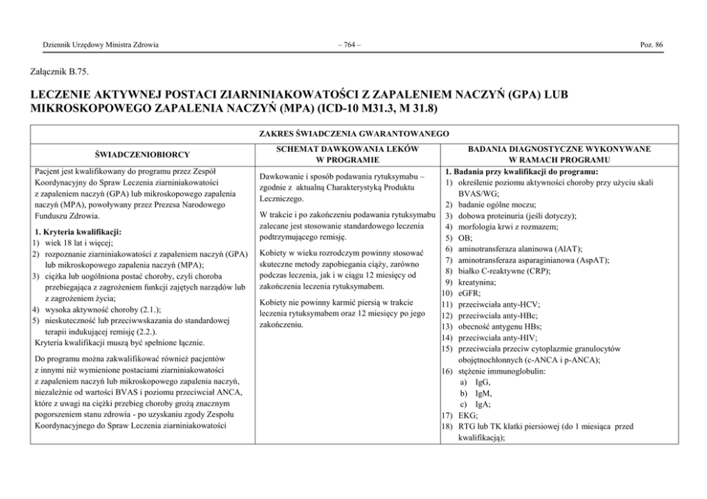 Dziennik Urzędowy Ministra Zdrowia – 764 – Poz. 86 Załącznik B.75. LECZENIE AKTYWNEJ POSTACI ZIARNINIAKOWATOŚCI Z ZAPALENIEM NACZYŃ (GPA) LUB MIKROSKOPOWEGO ZAPALENIA NACZYŃ (MPA) (ICD-10 M31.3, M 31.8) ZAKRES ŚWIADCZENIA GWARANTOWANEGO ŚWIADCZENIOBIORCY Pacjent jest kwalifikowany do programu przez Zespół Koordynacyjny do Spraw Leczenia ziarniniakowatości z zapaleniem naczyń (GPA) lub mikroskopowego zapalenia naczyń (MPA), powoływany przez Prezesa Narodowego Funduszu Zdrowia. 1. Kryteria kwalifikacji: 1) wiek 18 lat i więcej; 2) rozpoznanie ziarniniakowatości z zapaleniem naczyń (GPA) lub mikroskopowego zapalenia naczyń (MPA); 3) ciężka lub uogólniona postać choroby, czyli choroba przebiegająca z zagrożeniem funkcji zajętych narządów lub z zagrożeniem życia; 4) wysoka aktywność choroby (2.1.); 5) nieskuteczność lub przeciwwskazania do standardowej terapii indukującej remisję (2.2.). Kryteria kwalifikacji muszą być spełnione łącznie. Do programu można zakwalifikować również pacjentów z innymi niż wymienione postaciami ziarniniakowatości z zapaleniem naczyń lub mikroskopowego zapalenia naczyń, niezależnie od wartości BVAS i poziomu przeciwciał ANCA, które z uwagi na ciężki przebieg choroby grożą znacznym pogorszeniem stanu zdrowia - po uzyskaniu zgody Zespołu Koordynacyjnego do Spraw Leczenia ziarniniakowatości SCHEMAT DAWKOWANIA LEKÓW W PROGRAMIE BADANIA DIAGNOSTYCZNE WYKONYWANE W RAMACH PROGRAMU 1. Badania przy kwalifikacji do programu: Dawkowanie i sposób podawania rytuksymabu – 1) określenie poziomu aktywności choroby przy użyciu skali zgodnie z aktualną Charakterystyką Produktu BVAS/WG; Leczniczego. 2) badanie ogólne moczu; W trakcie i po zakończeniu podawania rytuksymabu 3) dobowa proteinuria (jeśli dotyczy); zalecane jest stosowanie standardowego leczenia 4) morfologia krwi z rozmazem; podtrzymującego remisję. 5) OB; 6) aminotransferaza alaninowa (AlAT); Kobiety w wieku rozrodczym powinny stosować 7) aminotransferaza asparaginianowa (AspAT); skuteczne metody zapobiegania ciąży, zarówno 8) białko C-reaktywne (CRP); podczas leczenia, jak i w ciągu 12 miesięcy od 9) kreatynina; zakończenia leczenia rytuksymabem. 10) eGFR; Kobiety nie powinny karmić piersią w trakcie 11) przeciwciała anty-HCV; leczenia rytuksymabem oraz 12 miesięcy po jego 12) przeciwciała anty-HBc; zakończeniu. 13) obecność antygenu HBs; 14) przeciwciała anty-HIV; 15) przeciwciała przeciw cytoplazmie granulocytów obojętnochłonnych (c-ANCA i p-ANCA); 16) stężenie immunoglobulin: a) IgG, b) IgM, c) IgA; 17) EKG; 18) RTG lub TK klatki piersiowej (do 1 miesiąca przed kwalifikacją); Dziennik Urzędowy Ministra Zdrowia z zapaleniem naczyń (GPA) lub mikroskopowego zapalenia naczyń (MPA). 2. Definicje: 2.1. Wysoka aktywność choroby to: 1) co najmniej 3 punkty w skali BVAS/WG, w tym występowanie co najmniej 1 objawu dużego aktywnej choroby oraz obecność przeciwciał ANCA (c-ANCA lub p-ANCA) w surowicy lub 2) co najmniej 3 punkty w skali BVAS/WG, obecność przeciwciał ANCA (c-ANCA lub p-ANCA) w surowicy, ciężki stan ogólny chorego w ocenie lekarza oraz konieczność długotrwałego stosowania glikokortykosteroidów (min. 6 miesięcy) w dawce większej jak 10 mg na dobę w przeliczeniu na prednizon, która niesie ze sobą duże ryzyko działań niepożądanych. 2.2. Nieskuteczność terapii standardowej to: 1) brak poprawy definiowanej jako zmniejszenie aktywności choroby w skali BVAS/WG o co najmniej 50% po 3 miesiącach standardowego leczenia indukcyjnego albo 2) utrzymywanie się aktywnej choroby definiowanej jako obecność co najmniej 1 dużego lub 3 małych objawów aktywnej choroby w skali BVAS/WG po 6 miesiącach standardowego leczenia indukcyjnego, albo 3) wczesny nawrót choroby definiowany jako nawrót dotychczasowych objawów lub wystąpienie nowych potwierdzony wzrostem aktywności choroby w skali BVAS/WG ≥ 3 w trakcie pierwszych 6 miesięcy standardowego leczenia podtrzymującego remisję, albo – 765 – Poz. 86 19) Quantiferon w kierunku zakażenia prątkiem gruźlicy. 2. Monitorowanie leczenia rytuksymabem. 2.1. Pacjenta poddaje się ocenie bezpieczeństwa i skuteczności terapii po 90 i 180 dniach (+/- 14 dni) od rozpoczęcia leczenia rytuksymabem wykonując następujące badania: 1) badanie ogólne moczu; 2) morfologia krwi z rozmazem; 3) aminotransferaza alaninowa (AlAT); 4) aminotransferaza asparaginianowa (AspAT); 5) eGFR; 6) kreatynina. 2.2. Oprócz badań wymienionych w pkt 2.1 po 180 dniach (+/14 dni) od rozpoczęcia leczenia rytuksymabem należy wykonać następujące badania: 1) określenie poziomu aktywności choroby przy użyciu skali BVAS/WG; 2) dobowa proteinuria (jeśli dotyczy); 3) OB; 4) białko C-reaktywne (CRP); 5) przeciwciała przeciw cytoplazmie granulocytów obojętnochłonnych (c-ANCA i p-ANCA); 6) stężenie immunoglobulin: a) IgG, b) IgM, c) IgA; 7) EKG; 8) RTG klatki piersiowej lub TK klatki piersiowej (do decyzji lekarza). 3. Badania przy wznowieniu leczenia rytuksymabem: 1) określenie poziomu aktywności choroby przy użyciu skali BVAS/WG; 2) badanie ogólne moczu; 3) dobowa proteinuria (jeśli dotyczy); Dziennik Urzędowy Ministra Zdrowia 4) częste nawroty choroby definiowane jako przynajmniej jedno zaostrzenie w czasie ostatnich 12 miesięcy standardowego leczenia podtrzymującego, którego nie daje się opanować zwiększeniem dawek leków stosowanych w terapii podtrzymującej do rekomendowanych. 2.3. Standardowe leczenie indukujące remisję to: 1) cyklofosfamid podawany doustnie w dawce 2 mg/kg/dobę (max. 200 mg/dobę) przez 3-6 miesięcy lub 2) cyklofosfamid podawany dożylnie w pulsach po 0,75 g/m2 powierzchni ciała co 4 tygodnie przez 6 miesięcy, lub 3) cyklofosfamid podawany dożylnie w pulsach 15 mg/kg masy ciała (max. 1,2 g; 3 pulsy co 2 tygodnie, następnie 36 pulsów co 3 tygodnie) - w skojarzeniu z odpowiednimi dawkami glikokortykosteroidów. Dawki