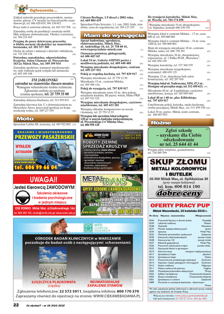 Ogłoszenia... Zakład stolarski poszukuje pracowników, montażystów, pilarzy. CV wysyłać na biuro@meble-stani(81) slawow.pl, tel. 606 820 019, 506 150 012 Praca stała w sortowni odzieży, tel. 665 915 508 (82) Zatrudnię osobę do produkcji i montażu mebli. Mile widziane doświadczenie. Okolice Latowicza, (84) tel. 504 233 443 Przyjmę do pracy dziewczynę pracowitą w klubie nocnym (dyskoteka) na stanowisko (85) barmanka, tel. 503 337 300 Osoba do zabaw i animacji z dziećmi i młodzieżą, (86) tel. 733 250 158 Potrzebna samodzielna, odpowiedzialna fryzjerka. Salon Glamour ul. Warszawska (87) 163/2a Mińsk Maz., tel. 509 399 934 Zatrudnię spedytora, transport międzynarodowy, mile widziany język rosyjski lub niemiecki, tel. 692 109 108 (88) (91) ZM JABŁONSKI zatrudni na stanowisko ślusarz-monter. Wymagane wykształcenie średnie techniczne. Zgłoszenia osobiste po ustaleniu terminu spotkania, tel. 25 759 35 00 Zatrudnię dekarza-blacharza, tel. 511 959 815 Zatrudnię kierowcę kat. C z doświadczeniem na Mercedesa Ateco, praca pod spedycją na kraju, weekendy wolne, tel. 509 127 359 (92) (90) Moto Sprzedam Lublin III, izoterma, tel. 695 922 083 (55) Citroen Berlingo, 1.9 diesel z 2002 roku, (63) tel. 669 804 439 Sprzedam Fiata Seicento, 1.1, van, 2003, biały, stan (64) dobry, cena do uzgodnienia, tel. 509 127 359 Mam do wynajęcia Sprzęt budowlany, ogrodniczy, elektronarzędzia, Mińsk Maz., ul. Andriollego 16, tel. 25 758 60 41, (1) www.wypozyczalnia–minsk.com Osuszacze powietrza, glebogryzarki, (2) tel. 606 445 143 Lokal 54 m2, Galeria AMINIS parter z (66) możliwością podziału, tel. 609 440 488 Wynajmę mieszkanie dwupokojowe, centrum (67) tel. 699 257 952 Pokój ze wspólną kuchnią, tel. 797 839 917 (68) Wynajmę mieszkanie, tel. 25 759 12 50 (71) Mieszkanie 52 m2 , centrum Mińska, (73) tel. 505 998 116, Pokój do wynajęcia, tel. 797 839 917 (75) Wynajmę mieszkanie nowe 42 m2, dwa pokoje, urządzona kuchnia, III piętro, winda, blisko PKP, (76) tel. 697 915 525 Wynajmę mieszkanie dwupokojowe, częściowo (81) umeblowane, tel. 605 653 201 Wynajmę chłodnie komputerowe na wesele (84) i komunię, tel. 25 759 13 55 Wynajmę lub sprzedam lokal usługowy 128 m2 w nowym budynku wielorodzinnym, ul. Wyszyńskiego 2 w Mińsku Maz., (86) tel. 606 958 128 Do wynajęcia kawalerka, Mińsk Maz, ul. Wesoła, tel. 784 174 698 Wynajmę mieszkanie 54 m2 dwupokojowe, ul. Szpitalna, kontakt 600 250 533 (89) Wynajmę lokal w centrum Mińska – 34 m2, cena 1200 zł, tel. 509 000 002 (90) Mam do wynajęcia mieszkanie 18 m2, centrum Mińska, tanio, tel. 606 738 301 (92) Wynajmę mieszkanie 38 m2, dwupokojowe, wyposażone, ul. 1 Pułku PLM „Warszawa”, tel. 601 850 149 (93) Wynajmę kawalerkę, tel. 537 360 559 (94) Wynajmę mieszkanie trzypokojowe, centrumtel. 608 659 125 (95) Wynajmę 12 m2, dotychczas były salon kosmetyczny, tel. 502 287 956 (96) Wynajmę lokal ul. Nadrzeczna, MM, 47,3 m2. Dostępny od początku maja, tel. 512 450 613, (97) Mieszkanie 60 m2, ul. Łupińskiego, częściowo umeblowane, kaucja, tel. 505 044 668 (98) Lokal 40 m2 i 60 m2, plac Kilińskiego, tel. 797 839 917 (99) Umeblowany pokój, łazienka, aneks kuchenny, osobie pracującej, Mińsk Maz., tel. 511 499 530 (100) Lokal 38 m2, parter, Mińsk, ścisłe centrum, tel. 609 807 033 (103) Różne Zgłoś szkodę – uzyskamy dla Ciebie odszkodowanie nr tel. 25 644 41 44 PRZEWOZY PASAŻERSKIE AUTOKARÓW (91) Wynajmę lokal w centrum Mińska – 17 m2, cena 600 zł, tel. 509 000 002 KRA JOWE I MIĘDZYNARODOWE WYNAJEM (87) Przyjmę płyty winylowe, gramofonowe, tel. 730 489 399 (44) (54) [email protected] www.rondo.edu.pl tel. 606 99 66 04 OFERTY PRACY PUP Mińsk Mazowiecki, 15 kwietnia 2015 r. Nr oferty 0544 0539 0538 0537 0534 0532 0530 0528 0527 0526 0525 0519 0517 0516 0515 0514 0512 0511 0504 0503 0502 0501 0489 Nazwa stanowiska Miejscowość Pracownik fizyczny w fermie drobiu Posiadały Lakiernik meblowy Mistów Hydraulik Warszawa Monter instalacji elektrycznych Janów Spawacz Mińsk Maz. Mechanik samochodów osobowych Sulejówek Kierownik robót budowlanych powiat miński Kierowca kat. CE powiat miński Robotnik gospodarczy Mińsk Maz. Pracownik wykańczania wnętrz powiat miński, Nauczyciel historii w gimnazjum Kierowca busa transport międzynarodowy Sprzedawca/ kasjer Jakubów Sprzedawca/ kasjer Dobre Duchnów Pracownik przy produkcji garmażeryjnej Operator maszyn pakujących i formujących Duchnów Stolarz meblowy Wążyczyn Piekarz stołowy lub piecowy Cegłów Montażysta przewodów elastycznych Mrozy Szlifierz narzędziowy Choszczówka Stojecka Ślusarz narzędziowy Choszczówka Stojecka Sprzedawca w cukierni Sulejówek Pomocnik w warsztacie blacharsko - lakierniczym Mrozy W celu uzyskania pełnej informacji o ofertach pracy należy zgłosić się osobiście do Urzędu Pracy. Więcej na stronie: www.praca.powiatminski.pl lub pod numerem 25 759 27 13 w. 401 do 406. 22 Co słychać? – nr 16 (914) 2015
