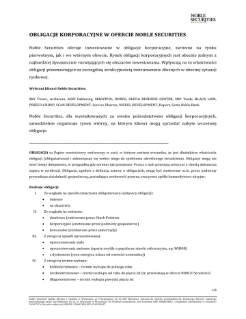 OBLIGACJE KORPORACYJNE W OFERCIE NOBLE SECURITIES Noble Securities oferuje inwestowanie w obligacje korporacyjne, zarówno na rynku pierwotnym, jak i we wtórnym obrocie. Rynek obligacji korporacyjnych jest obecnie jednym z najbardziej dynamicznie rozwijających się obszarów inwestowania. Wpływają na to właściwości obligacji przemawiające za szczególną atrakcyjnością instrumentów dłużnych w obecnej sytuacji rynkowej. Wybrani klienci Noble Securities: SKY Tower, Archicom, AOW Faktoring, MARVIPOL, ROBYG, OLIVIA BUSINESS CENTRE, MW Trade, BLACK LION, PRESCO GROUP, SCAN DEVELOPMENT, Service Pharma, NICKEL DEVELOPMENT, Raport, Getin Noble Bank. Noble Securities, dla wyemitowanych za swoim pośrednictwem obligacji korporacyjnych, samodzielnie organizuje rynek wtórny, na którym klienci mogą sprzedać nabyte wcześniej obligacje. _____________________________________________________________________________________________________ OBLIGACJA to Papier wartościowy emitowany w serii, w którym emitent stwierdza, że jest dłużnikiem właściciela obligacji (obligatariusza) i zobowiązuje się wobec niego do spełnienia określonego świadczenia. Obligacje mogą nie mieć formy dokumentu, w przypadku gdy emitent tak postanowi. Prawa z nich powstają wówczas z chwilą dokonania zapisu w ewidencji. Obligacje, zgodnie z definicją ustawy o obligacjach, mogą być emitowane m.in. przez podmioty prowadzące działalność gospodarczą, posiadające osobowość prawną oraz przez spółki komandytowo-akcyjne. Rodzaje obligacji: I. Ze względu na sposób oznaczenia obligatariusza (nabywcy obligacji): imienne na okaziciela II. Ze względu na emitenta: skarbowe (emitowane przez Skarb Państwa korporacyjne (emitowane przez podmioty gospodarcze) komunalne (emitowane przez samorządy) III. Z uwagi na sposób oprocentowania: oprocentowanie stałe oprocentowanie zmienne (oparte zwykle o popularne stawki referencyjne, np. WIBOR) z dyskontem (cena emisyjna niższa od wartości nominalnej) IV. Z uwagi na termin wykupu: krótkoterminowe – termin wykupu do jednego roku średnioterminowe – termin wykupu od roku do pięciu lat (te przeważają w ofercie NOBLE Securities) długoterminowe – termin wykupu powyżej pięciu lat 1/2 Noble Securities Spółka Akcyjna z siedzibą w Warszawie, ul. Przyokopowa 33, 01-208 Warszawa, wpisana do rejestru przedsiębiorców Krajowego Rejestru Sądowego prowadzonego przez Sąd Rejonowy dla m. st. Warszawy w Warszawie, XII Wydział Gospodarczy, pod numerem KRS: 0000018651, z kapitałem zakładowym w wysokości 3.494.747 zł (w pełni wpłacony), REGON: 350647408, NIP: 6760108427 V. Z uwagi na sposób zabezpieczenia: niezabezpieczone częściowo zabezpieczone całkowicie zabezpieczone Zgodnie z art. 8 ust.1 ustawy o obligacjach, emitent odpowiada całym swoim majątkiem za zobowiązania z obligacji, jednakże dodatkowo może zostać ustanowione zabezpieczenie, które ma dać obligatariuszom dodatkową gwarancję, że ich wierzytelności zostaną zaspokojone. VI. Ze względu na sposób emisji: oferta prywatna – kierowana do grupy inwestorów w liczbie nie większej niż 99 osób oferta publiczna – kierowana do co najmniej 100 osób lub do nieoznaczonego adresata Alternatywny System Obrotu na Rynku Catalyst został uruchomiony 30 września 2009 roku. Rynek ten prowadzony jest na platformach transakcyjnych Giełdy Papierów Wartościowych w Warszawie i BondSpot (dawniej: MTS CeTO). Emitent obligacji podejmuje decyzję czy wyemitowane obligacje zostaną wprowadzone do Alternatywnego Systemu Obrotu na Rynek Catalyst. Zalety obligacji korporacyjnych jako narzędzia lokowania kapitału: umożliwiają zdywersyfikowanie portfela inwestycyjnego mają wysokie oprocentowanie można sprzedać na rynku wtórnym Oferta obligacji skierowana jest do osób, które: są zainteresowane akumulacją kapitału i stałym wzrostem poziomu oszczędności preferują inwestycje o zmniejszonym poziomie ryzyka preferują inwestycje długo- i średnioterminowe, oferujące systematyczny wzrost wartości portfela Obligacje są papierami wartościowymi i nie pełnią funkcji depozytu bankowego czy też lokaty bankowej, a zobowiązania emitenta obligacji wynikające z emitowanych obligacji nie są objęte ochroną w ramach Bankowego Funduszu Gwarancyjnego. Inwestowanie w instrumenty finansowe, w tym w obligacje, wiąże się z różnego rodzaju ryzykami. Szczegółowe informacje w zakresie ryzyk jakie są związane z inwestowaniem w instrumenty finansowe są zamieszczone na stronie internetowej www.noblesecurities.pl oraz www.noblemarkets.pl. Ogłoszenie ma na celu reklamę i promocję usług Noble Securities SA - informacje o Punktach Obsługi Klientów Noble Securities SA, usługach i ofercie znajdują się na stronach: www.noblesecurities.pl oraz www.noblemarkets.pl. 2/2 Noble Securities Spółka Akcyjna z siedzibą w Warszawie, ul. Przyokopowa 33, 01-208 Warszawa, wpisana do rejestru przedsiębiorców Krajowego Rejestru Sądowego prowadzonego przez Sąd Rejonowy dla m. st. Warszawy w Warszawie, XII Wydział Gospodarczy, pod numerem KRS: 0000018651, z kapitałem zakładowym w wysokości 3.494.747 zł (w pełni wpłacony), REGON: 350647408, NIP: 6760108427