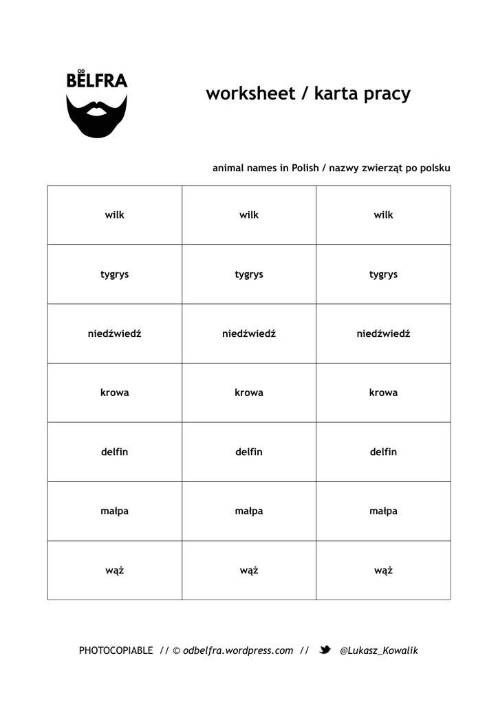 worksheet / karta pracy animal names in Polish / nazwy zwierząt po polsku wilk wilk wilk tygrys tygrys tygrys niedźwiedź niedźwiedź niedźwiedź krowa krowa krowa delfin delfin delfin małpa małpa małpa wąż wąż wąż PHOTOCOPIABLE // © odbelfra.wordpress.com // @Lukasz_Kowalik animal names in English / nazwy zwierząt po angielsku wolf wolf wolf tiger tiger tiger bear bear bear cow cow cow dolphin dolphin dolphin monkey monkey monkey snake snake snake PHOTOCOPIABLE // © odbelfra.wordpress.com // @Lukasz_Kowalik