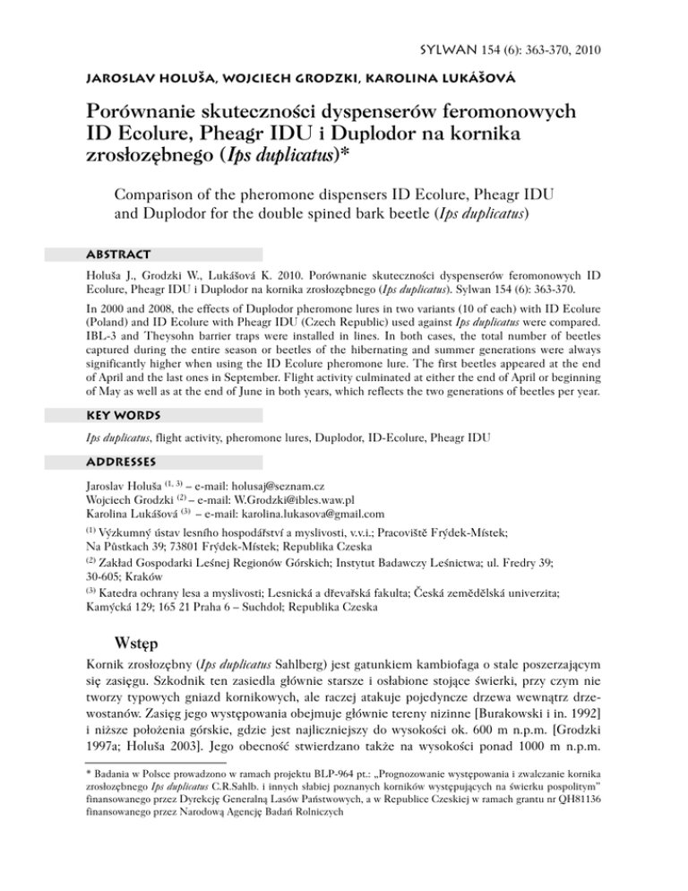 sylwan 154 (6): 363−370, 2010 › › Jaroslav HoluSa, Wojciech Grodzki, Karolina LukáSová Porównanie skuteczności dyspenserów feromonowych ID Ecolure, Pheagr IDU i Duplodor na kornika zrosłozębnego (Ips duplicatus)* Comparison of the pheromone dispensers ID Ecolure, Pheagr IDU and Duplodor for the double spined bark beetle (Ips duplicatus) ABSTRACT Holuša J., Grodzki W., Lukášová K. 2010. Porównanie skuteczności dyspenserów feromonowych ID Ecolure, Pheagr IDU i Duplodor na kornika zrosłozębnego (Ips duplicatus). Sylwan 154 (6): 363−370. In 2000 and 2008, the effects of Duplodor pheromone lures in two variants (10 of each) with ID Ecolure (Poland) and ID Ecolure with Pheagr IDU (Czech Republic) used against Ips duplicatus were compared. IBL−3 and Theysohn barrier traps were installed in lines. In both cases, the total number of beetles captured during the entire season or beetles of the hibernating and summer generations were always significantly higher when using the ID Ecolure pheromone lure. The first beetles appeared at the end of April and the last ones in September. Flight activity culminated at either the end of April or beginning of May as well as at the end of June in both years, which reflects the two generations of beetles per year. KEY WORDS Ips duplicatus, flight activity, pheromone lures, Duplodor, ID−Ecolure, Pheagr IDU Addresses Jaroslav Holuša (1, 3) – e−mail: [email protected] Wojciech Grodzki (2) – e−mail: [email protected] Karolina Lukášová (3) – e−mail: [email protected] (1) Výzkumný ústav lesního hospodářství a myslivosti, v.v.i.; Pracoviště Frýdek−Místek; Na Půstkach 39; 73801 Frýdek−Místek; Republika Czeska (2) Zakład Gospodarki Leśnej Regionów Górskich; Instytut Badawczy Leśnictwa; ul. Fredry 39; 30−605; Kraków (3) Katedra ochrany lesa a myslivosti; Lesnická a dřevařská fakulta; Česká zemědělská univerzita; Kamýcká 129; 165 21 Praha 6 – Suchdol; Republika Czeska Wstęp Kornik zrosłozębny (Ips duplicatus Sahlberg) jest gatunkiem kambiofaga o stale poszerzającym się zasięgu. Szkodnik ten zasiedla głównie starsze i osłabione stojące świerki, przy czym nie tworzy typowych gniazd kornikowych, ale raczej atakuje pojedyncze drzewa wewnątrz drze− wostanów. Zasięg jego występowania obejmuje głównie tereny nizinne [Burakowski i in. 1992] i niższe położenia górskie, gdzie jest najliczniejszy do wysokości ok. 600 m n.p.m. [Grodzki 1997a; Holuša 2003]. Jego obecność stwierdzano także na wysokości ponad 1000 m n.p.m. * Badania w Polsce prowadzono w ramach projektu BLP−964 pt.: „Prognozowanie występowania i zwalczanie kornika zrosłozębnego Ips duplicatus C.R.Sahlb. i innych słabiej poznanych korników występujących na świerku pospolitym” finansowanego przez Dyrekcję Generalną Lasów Państwowych, a w Republice Czeskiej w ramach grantu nr QH81136 finansowanego przez Narodową Agencję Badań Rolniczych 364 Jaroslav Holuša, Wojciech Grodzki, Karolina Lukášová [Turčani i in. 2001; Grodzki 2003]. W ostatnich latach wzmożone występowanie tego szkodnika dotyczy przede wszystkim obszaru północnych i środkowych Moraw, gdzie jego udział w wy− dzielaniu świerków jest istotny, oceniany na około 50−60% [Holuša 2008]. Z regionalnego punktu widzenia najpoważniejsza sytuacja panuje w Republice Czeskiej w rejonie Moraw−Śląska, gdzie gradacyjne występowanie I. duplicatus ściśle wiąże się z wielkoobszarowym osłabieniem świer− czyn przez suszę i epifitozę Armillaria ostoyae [Holuša, Liška 2002]. Miąższość posuszu wydzie− lonego przez kornika zrosłozębnego w roku 2007 wyniosła 200 tys. m3 i była dwukrotnie wyższa niż rok wcześniej [Knížek 2008]. Ochrona lasu przed kornikiem zrosłozębnym jest trudna, ponieważ gatunek ten nie zasiedla leżących drzew pułapkowych, a stojące – bardzo słabo [Grodzki 1997b]. Z uwagi na odmienny skład feromonu gatunek ten tylko w niewielkich ilościach odławiany jest do pułapek feromo− nowych na kornika drukarza (Ips typographus L.), zawierających np. Pheroprax [Zahradník i in. 1997, Grodzki 1998]. W Europie wykorzystywane są dwa podstawowe komponenty tworzące synergiczne składniki feromonu agregacyjnego I. duplicatus: ipsdienol i E−myrcenol [Byers i in. 1990]. Europejskie i azjatyckie populacje tego gatunku różnicują się w zakresie odmiennej pro− dukcji feromonu i reakcji na niego [Schlyter i in. 2001], bowiem u populacji azjatyckiej opisano trzeci składnik – amitinol [Zhang i in. 2007]. Różnice między populacjami z Europy i Azji znaj− dują potwierdzenie także na poziomie genetycznym [Lakatos i in. 2007]. Obecnie w Republice Czeskiej do wabienia kornika zrosłozębnego używane są dwa typy dyspenserów feromonowych (ID Ecolure i Pheagr IDU). Oba są umieszczone w zestawie środków dopuszczonych do stosowania w ochronie roślin w Republice Czeskiej [Minář 2008]. W Polsce używany jest dys− penser Duplodor [Grodzki 2003], który dopuszczony jest do stosowania w polskich lasach [Głowacka 2009]. Dla zapewnienia efektywności aktywnej ochrony lasu oraz monitoringu kornika zrosłozęb− nego konieczne jest określenie najskuteczniej działającego feromonu. W niniejszej pracy porów− nano wielkość odłowów I. duplicatus do pułapek feromonowych zawierających wszystkie trzy wyżej wymienione typy dyspenserów, wykorzystując wyniki uzyskane w warunkach niskiej liczebności populacji w Polsce w roku 2000 oraz przy wysokiej liczebności w Republice Czeskiej w roku 2008. Materiał i metody FEROMONY. Dyspenser ID Ecolure jako główną substancję czynną zawiera ipsdienol 1,6%, tj. (4S)−2−methyl−6−methylene−2,7−octadien−4−ol. Składniki synergiczne stanowią myrcenol, żywica świerkowa i etanol. Typ Pheagr IDU zawiera syntetyczną mieszaninę 2−metyl−3−buten−2−olu, ipsdienolu (31,30 g/kg) i E−myrcenolu (3,13 g/kg) stabilizowaną 