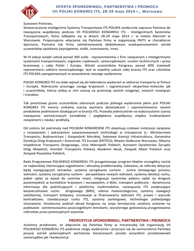 OFERTA SPONSORINGU, PARTNERSTWA I PROMOCJI VII POLSKI KONGRES ITS, 28-29 maja 2014 r., Warszawa Szanowni Paostwo, Stowarzyszenie Inteligentne Systemy Transportowe ITS POLSKA serdecznie zaprasza Paostwa do nawiązania współpracy podczas VII POLSKIEGO KONGRESU ITS - Inteligentnych Systemów Transportowych, który odbędzie się w dniach 28-29 maja 2014 r. w hotelu Marriott w Warszawie. Proponujemy włączenie się Paostwa firmy w organizację PKITS w charakterze Sponsora, Partnera lub firmy zainteresowanej dodatkowym wyeksponowaniem wśród uczestników spotkania (wystąpienie, stolik, inserowanie, inne). W VI edycji wzięło udział ponad 300 osób - reprezentantów z firm związanych z inteligentnymi systemami transportowymi, organów rządowych, samorządowych, uczelni technicznych i prasy branżowej z całej Polski i Europy. Wśród uczestników Kongresu ponad 40% stanowili reprezentanci sektora samorządowego. Jest to wspólny sukces całej branży ITS oraz członków ITS POLSKA zaangażowanych w powodzenie naszego wydarzenia. POLSKI KONGRES ITS na stałe wpisał się do kalendarza wydarzeo w sektorze transportu w Polsce i Europie. Rokrocznie przyciąga uwagę krajowych i zagranicznych ekspertów-mówców jak i uczestników, którzy widzą w nim szansę na promocję swoich osiągnięd, nowych rozwiązao i trendów. Tak prestiżowe grono uczestników zebranych podczas jednego wydarzenia jakim jest POLSKI KONGRES ITS tworzy unikalną szansę wymiany doświadczeo i zaprezentowania swoich produktów podmiotom działającym w branży ITS. Pozwala jednocześnie na wykorzystanie szansy nawiązania wartościowych kontaktów i pogłębienia współpracy między środowiskami związanymi z nauką i praktyką. Od sześciu lat patronaty nad POLSKIM KONGRESEM ITS obejmują czołowe instytucje związane z rozwijaniem i wdrażaniem zaawansowanych technologii w transporcie tj.: Ministerstwo Transportu, Budownictwa i Gospodarki Morskiej, Sejmowa Komisji Infrastruktury, Generalna Dyrekcja Dróg Krajowych i Autostrad, ITS Europe (ERTICO), Miasto Stołeczne Warszawy, Główny Inspektorat Transportu Drogowego, Unia Metropolii Polskich, Konwent Dyrektorów Zarządu Dróg Miejskich, Komitet Transportu Polskiej Akademii Nauk, Związek Miast Polskich oraz Związek Powiatów Polskich. Rada Programowa POLSKIEGO KONGRESU ITS przygotowując program kładzie szczególny nacisk na najbardziej interesujące zagadnienia i aktualną problematykę. Założono, że referaty dotyczyd będą następujących tematów: systemy zarządzania ruchem - ocena istniejącego procesu wdrożeo, systemy zarządzania ruchem - perspektywa nowych wdrożeo, systemy detekcji ruchu, pobór opłat za wjazd do centrów miast, integracja systemów poboru opłat na drogach pozamiejskich w kontekście krajowym i europejskim, e-Bilet, transport publiczny - dynamiczna informacja dla podróżujących i platformy multimodalne, rozwiązania ITS zwiększające bezpieczeostwo ruchu drogowego (BRD), osłona meteorologiczna, systemy nawigacji satelitarnej, transport kolejowy, innowacje w finansowaniu wdrożeo ITS, prawo i warunki kontraktowe, standaryzacja rynku ITS, systemy parkingowe, technologie podwójnego stosowania. Ostateczny podział obrad Kongresu na sesje tematyczne ustalony zostanie na podstawie zainteresowania poszczególnymi tematami, wyrażonego gotowością przygotowania referatów przez potencjalnych autorów. PROPOZYCJA SPONSORINGU, PARTNERSTWA i PROMOCJI Jesteśmy przekonani, że włączenie się Paostwa firmy w merytorykę lub organizację VII POLSKIEGO KONGRESU ITS podniesie rangę wydarzenia i przyczyni się do wzmocnienia Paostwa pozycji wśród potencjalnych partnerów biznesowych przede wszystkim przedstawicieli samorządów jak i konkurencji. OFERTA SPONSORINGU, PARTNERSTWA I PROMOCJI VII POLSKI KONGRES ITS, 28-29 maja 2014 r., Warszawa ŚWIADCZENIA W RAMACH UMOWY SPONSORSKIEJ Najwyższą gwarancją prestiżu oraz zapewnienia maksymalnego wyeksponowanie firmy jest rozważenie przyjęcie statusie „Sponsora” w ramach następujących limitowanych i precyzyjne dopasowanych do Paostwa potrzeb świadczeo uwzględnionych poniżej: Sponsor Sponsoring Świadczenia w ramach umowy sponsorskiej Platynowy Diamentowy Złoty Srebrny Sesji Gospodarz (wybrany dzieo) Uroczyste przyjęcie Lunch Serwis kawowy - 1 blok tematyczny 2 wystąpienia 1 wystąpienie 1 wystąpienie 1 wystąpienie do uzgodnienia Uczestnictwo bezpłatne reprezentantów Firmy w kongresie 5 osoby 4 osoby 3 osoby 2 osoby do uzgodnienia Dodatkowe uczestnictwo reprezentantów Firmy w kongresie z 50% zniżką 5 osób 4 osoby 3 osoby 2 osoby do uzgodnienia Odczytanie nazwy Firmy na rozpoczęciu kongresu Tak Tak Tak Tak Tak Możliwośd zaproszenia / krótka przemowa *na świadczenie przez Sponsora (*dot. uroczystego przyjęcia) Tak Tak Tak - - Dołączenie materiału reklamowego Firmy do pakietów uczestników kongresu Tak Tak Tak - Tak 3 szt. 2 szt. 1 szt. 1 szt. Tak Tak Tak - - Tak - - Tak Tak - Umieszczenie logo Firmy na głównej stronie stronie internetowej www.pkits.pl Tak Tak Tak Tak Tak Zamieszczenie logo Firmy w drukowanych materiałach kongresowych Tak Tak Tak Tak Tak Zamieszczenie logo Firmy na ekranach promocyjnych (banner, slajd kongresowy, tablice informacyjne) Tak Tak Tak Tak Tak Zamieszczenie logo Firmy w wybranych reklamach prasowych promujących kongres Tak Tak - - Tak Powierzchnia pod stolik / stand promocyjny (zabudowa lub ścianka wymaga odrębnych uzgodnieo z biurem organizacyjnym) Tak Tak Tak - Tak Maksymalna liczba w poszczególnych pakietach 1 firma 2 firmy 4 firmy - 1 organizacja /instytucja Koszt netto (należy doliczyd 23% VAT) 26.000 zł 20.000 zł 14.000 zł 8.000 zł 25.000 zł Wystąpienie (15 min) po wcześniejszym zgłoszeniu abstraktu do Rady Programowej Umieszczenie bannerów reklamowych Firmy w miejscu organizacji kongresu Osadzenie prezentacji Firmy na specjalnie utworzonej podstronie na www.pkits.pl (tekst, logo, pliki graficzne, plik vide