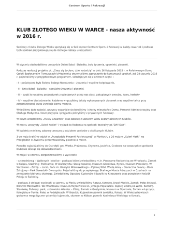 Centrum Sportu i Rekreacji KLUB ZŁOTEGO WIEKU W WARCE - nasza aktywność w 2016 r. Seniorzy z klubu Złotego Wieku spotykają się w Sali imprez Centrum Sportu i Rekreacji w każdy czwartek i podczas tych spotkań przygotowują się do różnego rodzaju uroczystości. W styczniu obchodziliśmy uroczyście Dzień Babci i Dziadka, były życzenia, upominki, piosenki. Podczas realizacji projektu pt. „Ciesz się życiem, dziel radością” w dniu 26 listopada 2015 r. w Państwowym Domu Opieki Społecznej w Tomczycach k/Mogielnicy otrzymaliśmy zaproszenie do kontynuacji spotkań. Już 28 stycznia 2016 r. pojechaliśmy z przygotowanym programem, składającym się z czterech części : - I – poświęcona była Świętu Bożego Narodzenia – życzenia i wspólne kolędowanie, - II – Dniu Babci i Dziadka – specjalne życzenia i piosenki, - III – część to wspólny poczęstunek z upieczonych przez nas ciast, zakupionych owoców, kawy, herbaty - IV – wspólne biesiadowanie, każdemu wręczyliśmy teksty wykonywanych piosenek oraz wspólne tańce przy zorganizowanej przez Dyrekcję Domu muzyce. Wnieśliśmy dużo radości, wszyscy wspaniale się bawiliśmy i chorzy mieszkańcy Domu, Personel Administracyjny oraz Obsługa Medyczna. Koszt przyjęcia i przyjazdu pokryliśmy z prywatnych funduszy. W lutym urządziliśmy „Tłusty Czwartek” oraz zabawę z udziałem wielu zaprzyjaźnionych Klubów. W marcu uroczysty „Dzień Kobiet” i wyjazd do Radomia na spektakl teatralny pt.”DAY DAY”. W kwietniu mieliśmy zabawę taneczną z udziałem seniorów z okolicznych Klubów. 3-go maja braliśmy udział w „Przeglądzie Piosenki Patriotycznej” w Pionkach, a 26 maja w „Dzień Matki” na Przeglądzie w Zwoleniu prezentowaliśmy piosenki o matce. Ponadto wyjeżdżaliśmy do Ostrołęki gm. Warka, Prażmowa, Chynowa, Jasieńca, Grabowa na towarzyskie spotkania Klubowie dzieląc się doświadczeniami. W maju i w czerwcu zorganizowaliśmy 2 wycieczki: - czterodniową – Wałbrzych i okolice – podczas której zwiedzaliśmy m.in. Panoramę Racławicką we Wrocławiu, Zamek w Książu, Stadninę i Palmiarnię. W Wałbrzychu: Starą Kopalnię, Muzeum Górnictwa, Rynek, Muzeum Porcelany. W Szczawnie – Zdroju – corso, Park im. Henryka Wieniawskiego – Pijalnię Wód, Wieżę Anny – Słoneczna Polanę – Dom Zdrojowy – Park Szwedzki- Dworzysko. Pojechaliśmy do przepięknego Skalnego Miasta Adrszpach w Czechach na zwiedzanie labiryntu skalnego. Zwiedziliśmy Opactwo Cystersów i Bazyliki w Krzeszowie oraz przepiękny Kościół Pokoju w Świdnicy. - podczas 3-dniowej wycieczki w czerwcu w Płocku zwiedziliśmy Ratusz, Katedrę, Drzwi Płockie, Zamek, Pałac Biskupi, Klasztor Mariawitów. We Włocławku: Muzeum Męczeństwa ks. Jerzego Popiełuszki, zaporę wodną na Wiśle, Katedrę, Starówkę, Bulwary, park, uzdrowisko Wieniec – Zdrój, Zamek w Gostyninie, Muzeum w Oporowie, Zamek w Łęczycy, Kolegiatę w Tumie, Pałac w Poddębicach. W Brześciu Kujawskim pomnik Łokietka, Ratusz. W Wietrzychowicach grobowce megalityczne- piramidy kujawskie, skansen w Kłóbce, pomnik Kazimierza Wielkiego w Kowalu. 1 Centrum Sportu i Rekreacji Po obydwu wojażach choć bardzo zmęczeni wróciliśmy szczęśliwi i pełni wrażeń. Wyrażamy wdzięczność i podziękowanie przewodniczącej Klubu Janeczce Jakubowskiej za zaangażowanie i ogromny wkład pracy na rzecz Klubu Złotego Wieku. Seniorzy z KZW 2
