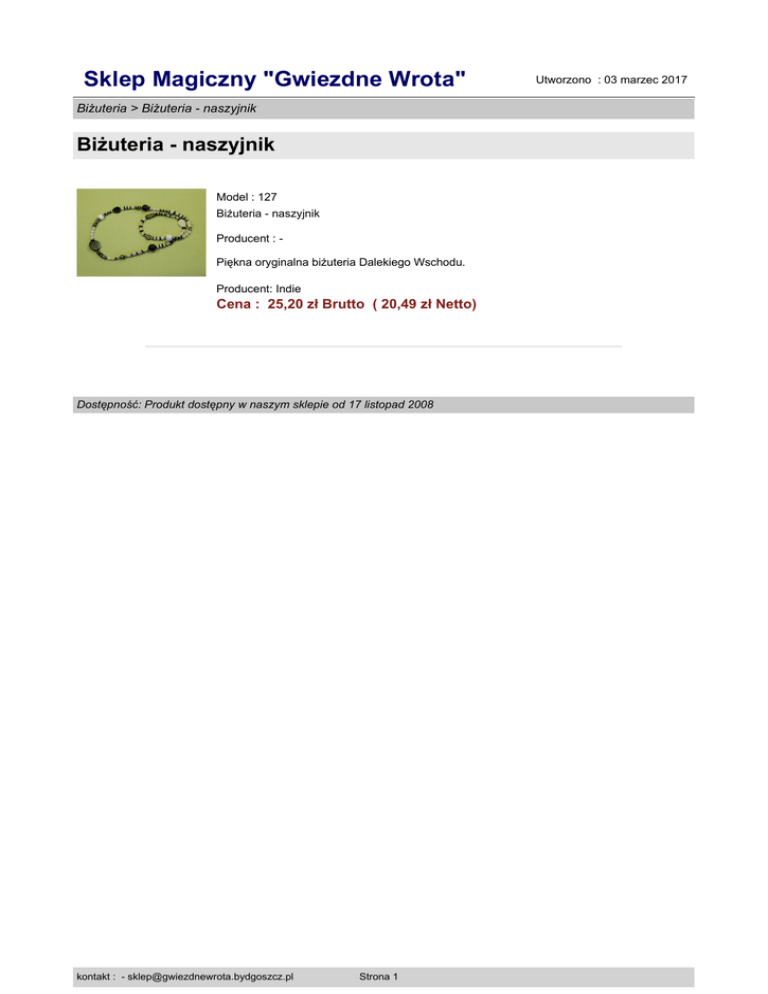 Sklep Magiczny "Gwiezdne Wrota" Biżuteria > Biżuteria - naszyjnik Biżuteria - naszyjnik Model : 127 Biżuteria - naszyjnik Producent : Piękna oryginalna biżuteria Dalekiego Wschodu. Producent: Indie Cena : 25,20 zł Brutto ( 20,49 zł Netto) Dostępność: Produkt dostępny w naszym sklepie od 17 listopad 2008 kontakt : - [email protected] Strona 1 Utworzono : 03 marzec 2017