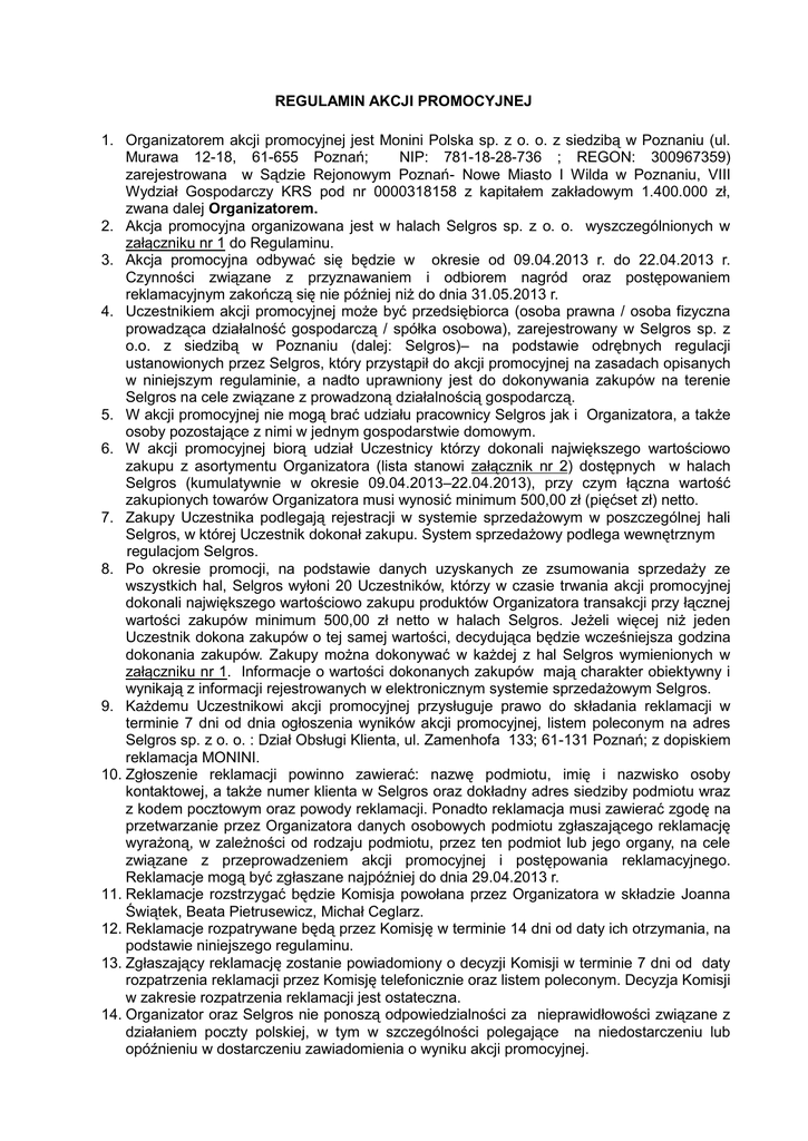 REGULAMIN AKCJI PROMOCYJNEJ 1. Organizatorem akcji promocyjnej jest Monini Polska sp. z o. o. z siedzibą w Poznaniu (ul. Murawa 12-18, 61-655 Poznań; NIP: 781-18-28-736 ; REGON: 300967359) zarejestrowana w Sądzie Rejonowym Poznań- Nowe Miasto I Wilda w Poznaniu, VIII Wydział Gospodarczy KRS pod nr 0000318158 z kapitałem zakładowym 1.400.000 zł, zwana dalej Organizatorem. 2. Akcja promocyjna organizowana jest w halach Selgros sp. z o. o. wyszczególnionych w załączniku nr 1 do Regulaminu. 3. Akcja promocyjna odbywać się będzie w okresie od 09.04.2013 r. do 22.04.2013 r. Czynności związane z przyznawaniem i odbiorem nagród oraz postępowaniem reklamacyjnym zakończą się nie później niż do dnia 31.05.2013 r. 4. Uczestnikiem akcji promocyjnej może być przedsiębiorca (osoba prawna / osoba fizyczna prowadząca działalność gospodarczą / spółka osobowa), zarejestrowany w Selgros sp. z o.o. z siedzibą w Poznaniu (dalej: Selgros)– na podstawie odrębnych regulacji ustanowionych przez Selgros, który przystąpił do akcji promocyjnej na zasadach opisanych w niniejszym regulaminie, a nadto uprawniony jest do dokonywania zakupów na terenie Selgros na cele związane z prowadzoną działalnością gospodarczą. 5. W akcji promocyjnej nie mogą brać udziału pracownicy Selgros jak i Organizatora, a także osoby pozostające z nimi w jednym gospodarstwie domowym. 6. W akcji promocyjnej biorą udział Uczestnicy którzy dokonali największego wartościowo zakupu z asortymentu Organizatora (lista stanowi załącznik nr 2) dostępnych w halach Selgros (kumulatywnie w okresie 09.04.2013–22.04.2013), przy czym łączna wartość zakupionych towarów Organizatora musi wynosić minimum 500,00 zł (pięćset zł) netto. 7. Zakupy Uczestnika podlegają rejestracji w systemie sprzedażowym w poszczególnej hali Selgros, w której Uczestnik dokonał zakupu. System sprzedażowy podlega wewnętrznym regulacjom Selgros. 8. Po okresie promocji, na podstawie danych uzyskanych ze zsumowania sprzedaży ze wszystkich hal, Selgros wyłoni 20 Uczestników, którzy w czasie trwania akcji promocyjnej dokonali największego wartościowo zakupu produktów Organizatora transakcji przy łącznej wartości zakupów minimum 500,00 zł netto w halach Selgros. Jeżeli więcej niż jeden Uczestnik dokona zakupów o tej samej wartości, decydująca będzie wcześniejsza godzina dokonania zakupów. Zakupy można dokonywać w każdej z hal Selgros wymienionych w załączniku nr 1. Informacje o wartości dokonanych zakupów mają charakter obiektywny i wynikają z informacji rejestrowanych w elektronicznym systemie sprzedażowym Selgros. 9. Każdemu Uczestnikowi akcji promocyjnej przysługuje prawo do składania reklamacji w terminie 7 dni od dnia ogłoszenia wyników akcji promocyjnej, listem poleconym na adres Selgros sp. z o. o. : Dział Obsługi Klienta, ul. Zamenhofa 133; 61-131 Poznań; z dopiskiem reklamacja MONINI. 10. Zgłoszenie reklamacji powinno zawierać: nazwę podmiotu, imię i nazwisko osoby kontaktowej, a także numer klienta w Selgros oraz dokładny adres siedziby podmiotu wraz z kodem pocztowym oraz powody reklamacji. Ponadto reklamacja musi zawierać zgodę na przetwarzanie przez Organizatora danych osobowych podmiotu zgłaszającego reklamację wyrażoną, w zależności od rodzaju podmiotu, przez ten podmiot lub jego organy, na cele związane z przeprowadzeniem akcji promocyjnej i postępowania reklamacyjnego. Reklamacje mogą być zgłaszane najpóźniej do dnia 29.04.2013 r. 11. Reklamacje rozstrzygać będzie Komisja powołana przez Organizatora w składzie Joanna Świątek, Beata Pietrusewicz, Michał Ceglarz. 12. Reklamacje rozpatrywane będą przez Komisję w terminie 14 dni od daty ich otrzymania, na podstawie niniejszego regulaminu. 13. Zgłaszający reklamację zostanie powiadomiony o decyzji Komisji w terminie 7 dni od daty rozpatrzenia reklamacji przez Komisję telefonicznie oraz listem poleconym. Decyzja Komisji w zakresie rozpatrzenia reklamacji jest ostateczna. 14. Organizator oraz Selgros nie ponoszą odpowiedzialności za nieprawidłowości związane z działaniem poczty polskiej, w tym w szczególności polegające na niedostarczeniu lub opóźnieniu w dostarczeniu zawiadomienia o wyniku akcji promocyjnej. 15. Ogłoszenie wyników nastąpi poprzez zawiadomienie Uczestników – laureatów akcji promocyjnej telefonicznie oraz listem poleconym w terminie jednego tygodnia od chwili rozstrzygnięcia akcji promocyjnej. 16. Nagrody dla poszczególnych laureatów zostaną wydane w hali Selgros, w której dany uczestnik dokonał ostatniego zakupu produktów Organizatora w trakcie trwania akcji promocyjnej, przez pracowników Selgros. Selgros powiadomi uprzednio Organizatora, do których hal Selgros Organizator będzie zobowiązany dostarczyć nagrody. 17. Nagroda zostanie wydana Uczestnikowi - laureatowi lub osobie upoważnionej pisemnie do jej odbioru za pisemnym potwierdzeniem odbioru nagrody. Uczestnik – laureat akcji promocyjnej ma 14 dni na odebranie nagrody, licząc od dnia powiadomienia zgodnie z pkt 15. Nagrody nie wydane w akcji promocyjnej pozostają w dyspozycji Organizatora. 18. Nagrodami w akcji promocyjnej są: a) dla pięciu Uczestników – laureatów, którzy dokonają kolejno pięciu, łącznie największych wartościowo zakupów towarów Organizatora, zgodnie z postanowieniami regulaminu: po 1 sztuce nawigacji samochodowej TomTom Start 20 & Start 25 + po jednym egzemplarzu książki Kulinarne Wyprawy Jamiego, autora Jamie Oliver oraz 2 płyt DVD z filmem Wielka, Włoska wyprawa Jamiego + 4 butelki oliwy DOP i IGP o pojemności 500 ml każda i po 1 sztuce pędzelka silikonowego do oliwy z grawerką Organizatora. Wartość pojedynczej nagrody obejmującej zestaw nawigacji, książkę i 2 filmy, 4 butelki oliwy oraz pędzelek wynosi 724,00 zł. b) dla pozostałych piętnastu Uczestników - laureatów: po jednym egzemplarzu książki Kulinarne Wyprawy Jami