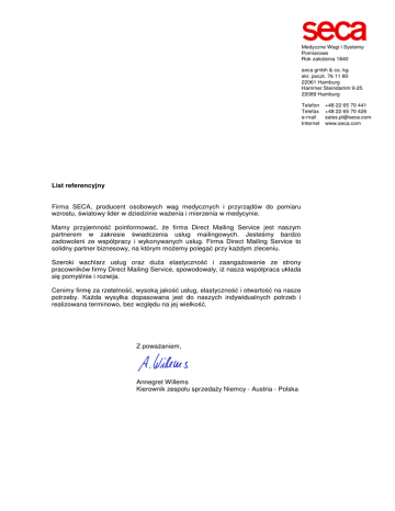 Medyczne Wagi i Systemy Pomiarowe Rok załoŜenia 1840 seca gmbh & co. kg. skr. poczt. 76 11 80 22061 Hamburg Hammer Steindamm 9-25 22089 Hamburg Telefon Telefax e-mail Internet List referencyjny Firma SECA, producent osobowych wag medycznych i przyrządów do pomiaru wzrostu, światowy lider w dziedzinie waŜenia i mierzenia w medycynie. Mamy przyjemność poinformować, Ŝe firma Direct Mailing Service jest naszym partnerem w zakresie świadczenia usług mailingowych. Jesteśmy bardzo zadowoleni ze współpracy i wykonywanych usług. Firma Direct Mailing Service to solidny partner biznesowy, na którym moŜemy polegać przy kaŜdym zleceniu. Szeroki wachlarz usług oraz duŜa elastyczność i zaangaŜowanie ze strony pracowników firmy Direct Mailing Service, spowodowały, iŜ nasza współpraca układa się pomyślnie i rozwija. Cenimy firmę za rzetelność, wysoką jakość usług, elastyczność i otwartość na nasze potrzeby. KaŜda wysyłka dopasowana jest do naszych indywidualnych potrzeb i realizowana terminowo, bez względu na jej wielkość. Z powaŜaniem, Annegret Willems Kierownik zespołu sprzedaŜy Niemcy - Austria - Polska +48 22 65 70 441 +48 22 65 70 426 [email protected] www.seca.com