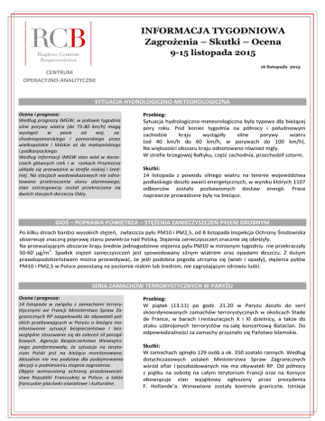 INFORMACJA TYGODNIOWA Zagrożenia – Skutki – Ocena 9-15 listopada 2015 16 listopada 2015 CENTRUM OPERACYJNO-ANALITYCZNE SYTUACJA HYDROLOGICZNO-METEOROLOGICZNA Ocena i prognoza: Według prognozy IMGW, w połowie tygodnia silne porywy wiatru (do 75-80 km/h) mogą wystąpić w pasie od woj. zachodniopomorskiego i pomorskiego przez wielkopolskie i łódzkie aż do małopolskiego i podkarpackiego. Według informacji IMGW stan wód w dorzeczach głównych rzek i w rzekach Przymorza układa się przeważnie w strefie niskiej i średniej. Na stacjach wodowskazowych nie odnotowano przekroczenia stanu alarmowego, stan ostrzegawczy został przekroczony na dwóch stacjach dorzeczu Odry. Przebieg: Sytuacja hydrologiczno-meteorologiczna była typowa dla bieżącej pory roku. Pod koniec tygodnia na północy i południowym zachodzie kraju wystąpiły silne porywy wiatru (od 40 km/h do 60 km/h, w porywach do 100 km/h). Na większości obszaru kraju odnotowano również mgły. W strefie brzegowej Bałtyku, część zachodnia, przechodził sztorm. Skutki: 14 listopada z powodu silnego wiatru na terenie województwa podlaskiego doszło awarii energetycznych, w wyniku których 1107 odbiorców zostało pozbawionych dostaw energii. Prace naprawcze prowadzone były na bieżąco. GIOŚ – POPRAWA POWIETRZA – STĘŻENIA ZANIECZYSZCZEŃ PYŁEM DROBNYM Po kilku dniach bardzo wysokich stężeń, zwłaszcza pyłu PM10 i PM2,5, od 8 listopada Inspekcja Ochrony Środowiska obserwuje znaczną poprawę stanu powietrza nad Polską. Stężenia zanieczyszczeń znacznie się obniżyły. Na przeważającym obszarze kraju średnie jednogodzinne stężenia pyłu PM10 w minionym tygodniu nie przekraczały 50-60 µg/m3. Spadek stężeń zanieczyszczeń jest spowodowany silnym wiatrem oraz opadami deszczu. Z dużym prawdopodobieństwem można przewidywać, że jeśli podobna pogoda utrzyma się (wiatr i opady), stężenia pyłów PM10 i PM2,5 w Polsce pozostaną na poziomie niskim lub średnim, nie zagrażającym zdrowiu ludzi. SERIA ZAMACHÓW TERRORYSTYCZNYCH W PARYŻU Ocena i prognoza: 14 listopada w związku z zamachami terrorystycznymi we Francji Ministerstwo Spraw Zagranicznych RP zaapelowało do obywateli polskich przebywających w Paryżu o bieżące monitorowanie sytuacji bezpieczeństwa i bezwzględne stosowanie się do zaleceń sił porządkowych. Agencja Bezpieczeństwa Wewnętrznego poinformowała, że sytuacja na terytorium Polski jest na bieżąco monitorowana. Aktualnie nie ma podstaw dla podejmowania decyzji o podniesieniu stopnia zagrożenia. Objęto wzmocnioną ochroną przedstawicielstwa Republiki Francuskiej w Polsce, a także francuskie placówki oświatowe i kulturalne. Przebieg: W piątek (13.11) po godz. 21.20 w Paryżu doszło do serii skoordynowanych zamachów terrorystycznych w okolicach Stade de France, w barach i restauracjach X i XI dzielnicy, a także do ataku uzbrojonych terrorystów na salę koncertową Bataclan. Do odpowiedzialności za zamachy przyznało się Państwo Islamskie. Skutki: W zamachach zginęło 129 osób a ok. 350 zostało rannych. Według dotychczasowych ustaleń Ministerstwa Spraw Zagranicznych wśród ofiar i poszkodowanych nie ma obywateli RP. Od północy z piątku na sobotę na całym terytorium Francji oraz na Korsyce obowiązuje stan wyjątkowy ogłoszony przez prezydenta F. Hollande’a. Wznowione zostały kontrole graniczne. Istnieje INFORMACJA TYGODNIOWA 9.11.2015 – 15.11. 2015 możliwość, że na wniosek prezydenta parlament przedłuży stan wyjątkowy na 3 miesiące. Do tej pory we Francji aresztowano 6 osób podejrzanych o związek z zamachami, kolejne 7 zostało aresztowanych w Belgii. W Wielkiej Brytanii oraz w Niemczech wprowadzono wzmocnione środki bezpieczeństwa. Dodatkowe środki ochrony wprowadzone zostały na lotniskach w Rosji. Na wniosek Francji w najbliższy piątek odbędzie się spotkanie ministrów spraw wewnętrznych i sprawiedliwości państw członkowskich UE. ZGROMADZENIA PUBLICZNE Z OKAZJI ŚWIĘTA NIEPODLEGŁOŚCI Ocena: Łącznie na terenie kraju w zabezpieczeniu obchodów Święta Niepodległości brało udział 26 346 funkcjonariuszy Policji. Zadysponowano ponad 8700 pojazdów służbowych. W ocenie Ministra Spraw Wewnętrznych oraz służb zaangażowanych w zabezpieczenie porządku tegoroczne zgromadzenia publiczne z okazji Święta Niepodległości miały najspokojniejszy przebieg od 5 lat. Przebieg: 11 listopada w całym kraju odbyły się uroczystości i marsze z okazji Narodowego Święta Niepodległości. Zorganizowano około 50 zgromadzeń publicznych, w których udział wzięło 110 tys. osób. Warszawa – w Marszu Niepodległości środowisk prawicowych na trasie: Rondo Dmowskiego – Rondo Waszyngtona – Wybrzeże Szczecińskie – błonia Stadionu Narodowego wzięło udział około 70 tys. osób. Hasło przewodnie marszu: „Polska dla Polaków – Polacy dla Polski”. Uczestnicy stosowali w dużej ilości środki pirotechniczne. Wrocław – około 7 tys. osób zorganizowało „VI Marsz Patriotów”. Uczestnicy stosowali znaczne ilości środków pirotechnicznych oraz spalili flagę Unii Europejskiej. Kraków – około 3 tys. narodowców zorganizowało marsz. Skutki: Nie odnotowano istotnych incydentów i zakłóceń porządku publicznego. STRAJK OSTRZEGAWCZY PERSONELU POKŁADOWEGO PLL LOT Ocena i prognoza: Wszystkie związki zawodowe działające w PLL LOT SA są w sporze zbiorowym z Zarządem spółki od 19 listopada 2013 r., gdy obniżone zostały wynagrodzenia personelu pokładowego i pilotów. Ostatnie dwie rundy negocjacji płacowych nie doprowadziły do porozumienia. Personel pokładowy stanowi najliczniejszą, ponad 600 osobową, grupę zawodową w PLL LOT SA. Przebieg: 19 listopada (czwartek) zostanie przeprowadzony strajk ostrzegawczy personelu pokładowego PLL LOT zorganizowany przez Związek Zawodowy Personelu Pokładowego i Lotniczego. Skutki: Możliwe utrudnienia dla pasażerów linii lotniczych. NOWEL