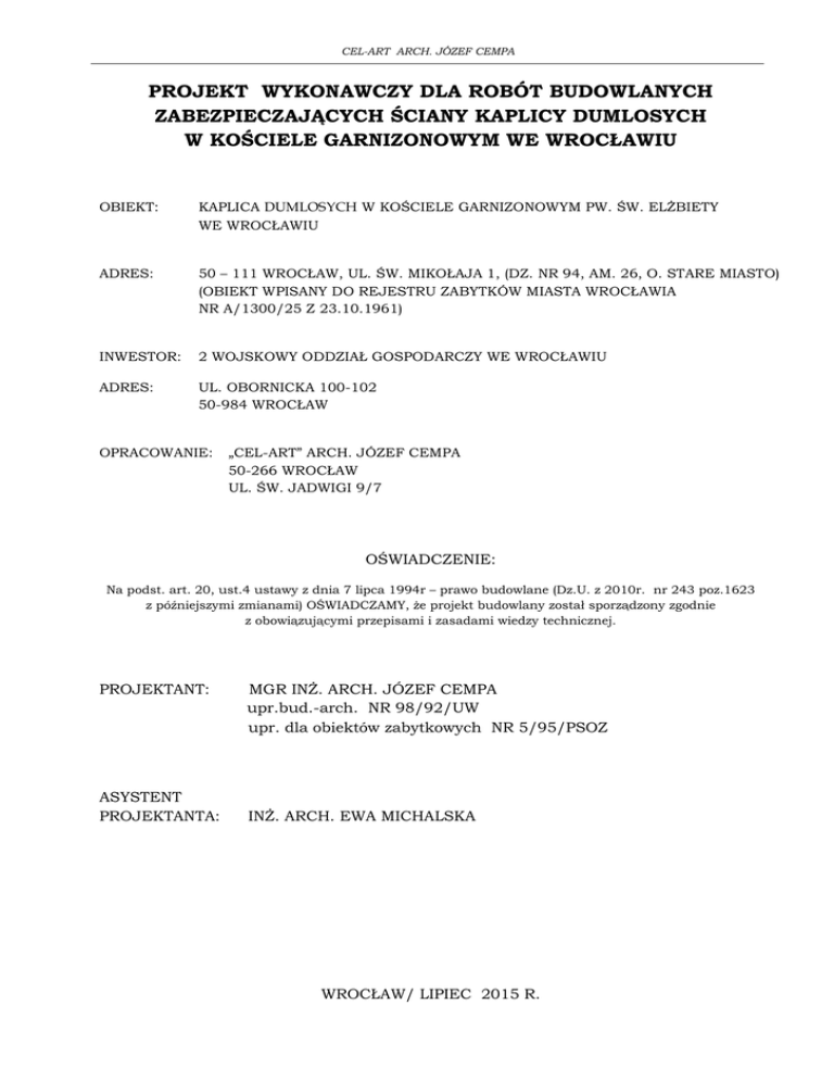 CEL-ART ARCH. JÓZEF CEMPA PROJEKT WYKONAWCZY DLA ROBÓT BUDOWLANYCH ZABEZPIECZAJĄCYCH ŚCIANY KAPLICY DUMLOSYCH W KOŚCIELE GARNIZONOWYM WE WROCŁAWIU OBIEKT: KAPLICA DUMLOSYCH W KOŚCIELE GARNIZONOWYM PW. ŚW. ELŻBIETY WE WROCŁAWIU ADRES: 50 – 111 WROCŁAW, UL. ŚW. MIKOŁAJA 1, (DZ. NR 94, AM. 26, O. STARE MIASTO) (OBIEKT WPISANY DO REJESTRU ZABYTKÓW MIASTA WROCŁAWIA NR A/1300/25 Z 23.10.1961) INWESTOR: 2 WOJSKOWY ODDZIAŁ GOSPODARCZY WE WROCŁAWIU ADRES: UL. OBORNICKA 100-102 50-984 WROCŁAW OPRACOWANIE: „CEL-ART” ARCH. JÓZEF CEMPA 50-266 WROCŁAW UL. ŚW. JADWIGI 9/7 OŚWIADCZENIE: Na podst. art. 20, ust.4 ustawy z dnia 7 lipca 1994r – prawo budowlane (Dz.U. z 2010r. nr 243 poz.1623 z późniejszymi zmianami) OŚWIADCZAMY, że projekt budowlany został sporządzony zgodnie z obowiązującymi przepisami i zasadami wiedzy technicznej. PROJEKTANT: ASYSTENT PROJEKTANTA: MGR INŻ. ARCH. JÓZEF CEMPA upr.bud.-arch. NR 98/92/UW upr. dla obiektów zabytkowych NR 5/95/PSOZ INŻ. ARCH. EWA MICHALSKA WROCŁAW/ LIPIEC 2015 R. SPIS TREŚCI: STRONA TYTUŁOWA ........................................................................................................................1 SPIS TREŚCI ....................................................................................................................................2 CZ. I – CZĘŚĆ OPISOWA 1. PODSTAWA OPRACOWANIA .......................................................................................................3 2. CHARAKTERYSTYKA PRZEDMIOTU OPRACOWANIA ..................................................................3 3. CEL, ZAKRES I GRANICE OPRACOWANIA ..................................................................................4 4. OCENA STANU ZACHOWANIA ELEMENTÓW ARCHITEKTURY KAPLICY.....................................5 5. ZAKRES PROJEKTOWANYCH ROBÓT REMONTOWYCH.............................................................7 A. PRACE REMONTOWE ELEWACJI KAPLICY ........................................................................7 B. PRACE REMONTOWE WE WNĘTRZU KAPLICY DUMLOSYCH ...........................................8 6. SERWIS FOTOGRAFICZNY .........................................................................................................9 7. UWAGI I OŚWIADCZENIA PROJEKTANTA ................................................................................10 CZ. II – CZĘŚĆ RYSUNKOWA / UZUPEŁNIENIE PROJEKTU BUDOWLANEGO RYS. 1. KAPLICA DUMLOSYCH – RYNNA DACHU GŁÓWNEGO ........................................ 1:50 / 1:5 RYS. 2. SCHEMAT ELEMENTÓW CEGLANYCH DO REMONTU ŻEBER NAŚCIENNYCH W KAPLICY DUMLOSYCH CZ. III – SERWIS FOTOGRAFICZNY A. ELEWACJE KAPLICY Z DETALAMI ................................... 10 stron B. WNĘTRZE KAPLICY ............................................................ 6 stron 2 1. PODSTAWA OPRACOWANIA Podstawę opracowania stanowią: 2. zlecenie Inwestora, „Projekt robót budowlanych zabezpieczających (…) z grudnia 2013 roku, zatwierdzony przez MKZ / Wrocław, szczegółowe rozpoznanie stanu technicznego (obszaru zniszczeń oraz ich przyczyn) dot.: elementów kamieniarki, ceglanego lica elewacji, elementów dekarskich oraz stanu tynków i ceglanych żeber wewnątrz kaplicy, określenie warunków dla docelowej funkcji przedmiotowej kaplicy i ekspozycji zabytkowego epitafia Goetza (wewnątrz i na zewnątrz). CHARAKTERYSTYKA PRZEDMIOTU OPRACOWANIA Przedmiotem opracowania są zniszczone struktury ścian zewnętrznych i wewnętrznych kaplicy Dumlosych, zlokalizowanej przy południowej nawie bocznej kościoła Garnizonowego we Wrocławiu (obiekt zabytkowy wpisany do rejestru zabytków miasta Wrocławia NR A/1300/25.10.1961 rok). Kaplica o formach gotyckich wzniesiona została pod koniec XIV wieku, pomiędzy przyporami konstrukcyjnymi nawy bocznej kościoła, na osi pseudotranseptu na planie wieloboku. Od zewnątrz kaplica zamknięta jest wysuniętymi poza pierwotne przypory kościoła ścianami, wspartymi na ich załamaniach ceglanymi, wielostopniowymi przyporami. Trzy zewnętrzne „frontowe” ściany wypełnione są ostrołucznymi oknami z piaskowcowymi laskami zwieńczonymi maswerkami. Obecnie okna zabezpieczone są szkleniem białym, bezpiecznym z taflami mocowanymi na stalowych wiatrownicach. Piaskowcowe parapety okien oparte są na piaskowcowym gzymsie obiegającym ściany kaplicy wraz z przyporami, posiadającym pełny gotycki profil ze skosem górnym i wklęsłym nadwieszeniem z kapinosem. Podobnie zewnętrzny obrys kaplicy obiega piaskowcowy gzyms nakrywający niski obecnie cokół ceglany (z dwóch – trzech warstw cegieł) o prostym skośnym i pionowym profilowaniu. Po obu bokach skarp, na dolnych (2-3) warstwach ceglanych cokołu widoczne są ślady zatarcia otworów odwiertów po wykonywanej przed kilku laty przeponie izolacyjnej w systemie iniekcji. Ściany boczne zostały poddane temu zabiegowi od wewnątrz i zarówno otwory jak i wymienione tynki zatarte zostały gruboziarnistą zaprawą. Ceglane narożne przypory kaplicy swoim zwieńczeniem sięgają poziomu ostrołuków okien zachowując na całej wysokości jednakową szerokość. Nieznaczne cofanie ich występów (12÷25 cm) widoczne jest na poziomach piaskowcowych gzymsów. Zwieńczone są skośną nakrywą piaskowcową, od frontu uformowaną w trójkątny szczyt z rzeźbionym wodorzygami w narożach przyokapowych. Pod okapem dachu elewacja kaplicy zwieńczona jest fryzem jednowarstwowo i przekątniowo ułożonych cegieł oraz tuż pod okapem wklęsło wyprofilowanym ceglanym gzymsem (cegły o układzie na rąb). 3 W pasie parteru pomiędzy skarpami rozmieszczone są rozbudowane w formie epitafia (ściana południowo-zachodnia) oraz piaskowcowy portal (ściana południowa) pierwotnego wejścia do kaplicy, sięgające parapetów okien. Od zachodu kaplica posiada parterową dobudówkę (wzniesioną wraz z kaplicą) zawierającą wewnętrzną klatkę schodową, zajmującą przestrzeń pomiędzy 