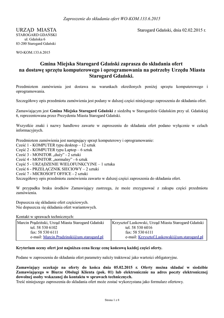 Zaproszenie do składania ofert WO-KOM.133.6.2015 URZĄD MIASTA Starogard Gdański, dnia 02.02.2015 r. STAROGARD GDAŃSKI ul. Gdańska 6 83-200 Starogard Gdański WO-KOM.133.6.2015 Gmina Miejska Starogard Gdański zaprasza do składania ofert na dostawę sprzętu komputerowego i oprogramowania na potrzeby Urzędu Miasta Starogard Gdański. Przedmiotem zamówienia jest dostawa na warunkach określonych poniżej sprzętu komputerowego i oprogramowania. Szczegółowy opis przedmiotu zamówienia jest podany w dalszej części niniejszego zaproszenia do składania ofert. Zamawiającym jest Gmina Miejska Starogard Gdański z siedzibą w Starogardzie Gdańskim przy ul. Gdańskiej 6, reprezentowana przez Prezydenta Miasta Starogard Gdański. Wszystkie znaki i nazwy handlowe zawarte w zaproszeniu do składania ofert podano wyłącznie w celach informacyjnych. Przedmiotem zamówienia jest następujący sprzęt komputerowy i oprogramowanie: Cześć 1 - KOMPUTER typu desktop – 12 sztuk Część 2 - KOMPUTER typu Laptop – 6 sztuk Cześć 3 - MONITOR „duży” - 2 sztuki Cześć 4 - MONITOR „normalny” - 6 sztuk Część 5 - URZĄDZENIE WIELOFUNKCYJNE – 1 sztuka Cześć 6 - PRZEŁĄCZNIK SIECIOWY – 2 sztuki Cześć 7 - MICROSOFT OFFICE - 2 sztuki Szczegółowy opis przedmiotu zamówienia zawarto w dalszej części zaproszenia do składania ofert. W przypadku braku środków Zamawiający zastrzega, że może zrezygnować z zakupu części przedmiotu zamówienia. Dopuszcza się składanie ofert częściowych. Nie dopuszcza się składania ofert wariantowych. Kontakt w sprawach technicznych: Marcin Prądziński, Urząd Miasta Starogard Gdański tel. 58 530 6102 fax: 58 530 6111 e-mail: [email protected] Krzysztof Laskowski, Urząd Miasta Starogard Gdański tel. 58 530 6016 fax: 58 530 6111 e-mail: [email protected] Kryterium oceny ofert jest najniższa cena licząc cenę końcową każdej części oferty. Podane w zaproszeniu do składania ofert parametry należy traktować jako wartości obligatoryjne. Zamawiający oczekuje na oferty do końca dnia 05.02.2015 r. Oferty można składać w siedzibie Zamawiającego w Biurze Obsługi Klienta (pok. 01) lub elektronicznie na adres poczty elektronicznej dowolnej osoby wskazanej do kontaktu w sprawach technicznych. Treść niniejszego zaproszenia do składania ofert może zostać wykorzystana jako formularz ofertowy. Strona 1 z 8 Zaproszenie do składania ofert WO-KOM.133.6.2015 Wybór ofert nastąpi do dnia 09.02.2015 r. Rozliczenie za wykonanie przedmiotu zamówienia nastąpi na podstawie faktury VAT, na zasadach określonych we wzorze umowy zawartym w Załączniku nr 1 do niniejszego zaproszenia. Niniejsze postępowanie nie podlega przepisom Prawa Zamówień Publicznych ze względu na kwotę zamówienia poniżej 30.000 €. Szczegółowy opis przedmiotu zamówienia zawarto w poniżej: Cześć 1 KOMPUTER typu desktop – 12 sztuk Procesor Intel Core i5 4440 3.10 GHz Płyta główna min. 6x USB (w tym min. 4x port USB 2.0/1.1, min. 2x porty USB 3.0/2.0), 1 port klawiatury PS2, 1 port myszy PS/2, audio, min. 1x port RJ-45, min. 4x SATA, 1x głośniki, 1x słuchawki, min. 1x PCI-E x16, Pamięć RAM 4 GB DDR3 PC-1600 (min. 1 slot pamięci pozostawiony wolny do rozbudowy w przyszłości) Dysk twardy min. 128GB SSD Prędkość odczytu min 500MB/s, prędkość zapisu min. 400MB/s Grafika 1x VGA, 1x DVI Dźwięk min. stereo Karta sieciowa 10/100/1000 Gigabit Ethernet Napęd optyczny DVD-RW wraz z oprogramowaniem do nagrywania/kopiowania płyt CD/DVD Obudowa Middle Tower ATX Zasilacz min. 400W Klawiatura Przewodowa Logitech K120 Myszka Optyczna przewodowa Logitech M90 System operacyjny Windows 8.1 Professional PL Gwarancja 3 lata D2D (3 lata gwarancja typu door-to-door) Inne sprzęt fabrycznie nowy w oryginalnym opakowaniu nie noszący śladów użytkowania; dołączony oryginalny nośnik instalacyjny systemu operacyjnego; dołączone oryginalne nośniki instalacyjne sterowników do zamontowanych podzespołów; cicha praca zestawu <45dB Część 2 KOMPUTER typu Laptop – 6 sztuk Model System operacyjny Podzespoły Procesor Lenovo Essential G710 i5-4210 4GB 1TB GF820 W8.1 Windows 8.1 PL Intel® Core™ i5 4gen 4210M 2,6 - 3,2 GHz Strona 2 z 8 Zaproszenie do składania ofert WO-KOM.133.6.2015 Liczba rdzeni Pamięć podręczna CACHE Ekran Pamięć RAM Możliwość rozszerzenia RAM do Dysk twardy Grafika Pamięć karty graficznej Napęd, kamera Rodzaj napędu Wbudowana kamera Dźwięk Karta dźwiękowa Wbudowane głośniki Wbudowany mikrofon Komunikacja Karta sieciowa Karta bezprzewodowa Wi-Fi Bluetooth Czytnik kart pamięci Wyjścia / wejścia Złącze USB 2.0 Złącze USB 3.0 Wyjście HDMI Wyjście VGA Złącze Combo jack (wejście/wyjście audio) Parametry fizyczne Urządzenie wskazujące Waga (kg) Wyposażenie Gwarancja Gwarancja Typ gwarancji Gwarancja baterii Inne 2 3 MB 17,3'', WXGA++ 1600 x 900 pikseli (16:9) 4 GB, DDR3 8 GB 1000 GB, SATA 5400 obr/min nVidia® GeForce 820M + Intel HD Graphics 4600 2048 MB Super Multi DVD+/-RW/RAM tak 1 mln pikseli zintegrowana 2 tak 10/100 Mbps Ethernet 802.11 b/g/n tak 2 w 1 (SD, MMC) 2 1 tak tak tak TouchPad 2,9 kg instrukcja obsługi, karta gwarancyjna, zasilacz, bateria 24 miesiące door to door 6 miesięcy sprzęt fabrycznie nowy w oryginalnym opakowaniu nie noszący śladów użytkowania; Cześć 3 MONITOR „duży” - 2 sztuki Dane podstawowe Model Ekran Ekran obrotowy (pivot) Obraz Rozdzielczość Kontrast statyczny / dynamiczny Jasność ekranu Czas reakcji matrycy iiyama ProLite B2480HS-B1 lub równoważny o poniższych cechach 23,6 cala TN LED, 16:9 tak 1920 x 1080 brak danych / 5000000 :1 250 cd/m2 2 ms Strona 3 z 8 Zaproszenie do składania ofert WO-KOM.133.6.2015 Wielkość plamki Kąt widzenia w pionie / w poziomie Liczba wyświetlanych kolorów Wejścia / wyjścia Wejście D-Sub (VGA) Wejście DVI Cyfrowe wejście HDMI Wejście liniowe audio Informacje użytkowe Głośniki Możliwość zawieszenia na