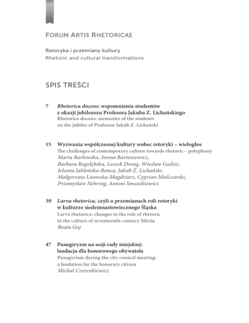 Retoryka i przemiany kultury Rhetoric and cultural transformations SPIS TREŚCI 7 Rhetorica docens: wspomnienia studentów z okazji jubileuszu Profesora Jakuba Z. Lichańskiego Rhetorica docens: memories of the students on the jubilee of Professor Jakub Z. Lichański 15 Wyzwania współczesnej kultury wobec retoryki – wielogłos The challenges of contemporary culture towards rhetoric – polyphony Maria Barłowska, Iwona Bartoszewicz, Barbara Bogołębska, Leszek Drong, Wiesław Godzic, Jolanta Jabłońska-Bonca, Jakub Z. Lichański, Małgorzata Lisowska-Magdziarz, Cyprian Mielczarski, Przemysław Nehring, Antoni Smuszkiewicz 39 Larva rhetorica, czyli o przemianach roli retoryki w kulturze siedemnastowiecznego Śląska Larva rhetorica: changes in the role of rhetoric in the culture of seventeenth-century Silesia Beata Gaj 47 Panegiryzm na sesji rady miejskiej: laudacja dla honorowego obywatela Panegyrism during the city council meeting: a laudation for the honorary citizen Michał Czerenkiewicz 61 Przeszłość jako konstrukt kulturowy. Obrazy rewolucji i komunizmu w służbie perswazji The past as a cultural construct. Images of a revolution and communism in the service of persuasion Oliwia Tarasewicz-Gryt 79 Powrót do przeszłości – chwyty retoryczne w retrokryminałach Marcina Wrońskiego Return to the past – rhetorical devices in Marcin Wroński`s retro crime novels Elżbieta Pawlak-Hejno 99 Wykorzystanie tradycyjnej symboliki we współczesnej kulturze arabskiej Contemporary use of traditional symbolism in Arab culture Marcin Styszyński 113 Monstrum horrendum, informe, ingens, cui lumen ademptum…? Retoryka jako wyzwanie rzucone literaturoznawstwu. Szkic warsztatowy Monstrum horrendum, informe, ingens, cui lumen ademptum… ? Rhetoric as a challenge for literary studies Bartłomiej Starnawski 137 Debaty konkursowe i telewizyjne debaty przedwyborcze – problemy dispositio w dwóch realizacjach gatunkowych Competition debates and pre-election TV debates – dispositio problems in two forms of a debate genre Agnieszka Budzyńska-Daca 155 RECENZJA: Mirosław Korolko, Podręcznik retoryki kaznodziejskiej. Oprac. Ks. G. Jaśkiewicz. WAM. Kraków 2010. REVIEW: Mirosław Korolko, Podręcznik retoryki kaznodziejskiej. Oprac. Ks. G. Jaśkiewicz. WAM. Kraków 2010. Barbara Bogołębska RETORYKA I PRZEMIANY KULTURY Rozważania na temat wzajemnych relacji między retoryką a przemianami kultury rozpoczyna seria uwag i prognoz formułowanych przez przedstawicieli różnych środowisk naukowych: filologicznych, literaturoznawczych, prawniczych, medioznawczych. Maria Barłowska, Iwona Bartoszewicz, Barbara Bogołębska, Leszek Drong, Wiesław Godzic, Jolanta Jabłońska-Bonca, Jakub Z. Lichański, Małgorzata Lisowska-Magdziarz, Cyprian Mielczarski, Piotr Nehring i Antoni Smuszkiewicz odpowiadają na pytanie, jakie wyzwania stawia przed retoryką kultura współczesna. Nowe przestrzenie i formy działań retorycznych, wzrost znaczenia kultury popularnej, dominacja tekstów zapośredniczonych medialnie, wpływ nowych mediów na określenie etosu nadawcy, problem retorycznej kompetencji odbiorców, aktualność wzorca aksjologicznego oferowanego przez klasyczną retorykę – to tylko kilka z poruszonych kwestii. Dalsze artykuły koncentrują się na analizie zjawisk, które są przywołaniem bądź kontynuacją postaw czy rozwiązań funkcjonujących w epokach wcześniejszych. Dawne motywy i style pojawiają się w kulturze współczesnej zarówno jako historyczny kostium służący uatrakcyjnieniu przekazu, jak i kod odwołujący się do wspólnej tożsamości i pozwalający formułować perswazyjne komunikaty kierowane do określonej grupy. W studium „Larva rhetorica, czyli o przemianach roli retoryki w kulturze siedemnastowiecznego Śląska” Beata Gaj pokazuje, jak bardzo świadomi przemian w retoryce byli śląscy autorzy XVII wieku, zwracający uwagę, że dotychczasowa spuścizna retoryczna stwarza możliwość innowacji, retoryka jest bowiem narzędziem, pozwalającym wykrywać i ujawniać nowe zjawiska zmieniającego się świata. Zmiany kulturowe prowadzą nieuchronnie do przekształceń w obrębie poszczególnych gatunków. Temu zagadnieniu poświęcony jest artykuł Michała Czerenkiewicza „Panegiryzm na sesji rady miejskiej: laudacja dla honorowego obywatela”. Autor na wybranym przykładzie pokazuje, czym współczesna mowa pochwalna różni się od podobnych wypowiedzi w epokach wcześniejszych. O sposobach wykorzystania i reinterpretacji motywów historycznych w przekazie reklamowym pisze Oliwia Tarasewicz-Gryt w artykule „Przeszłość jako konstrukt kulturowy. Obrazy rewolucji i komunizmu w służbie perswazji”. Metaforyczne obrazy rewolucji pozwalające na dużą dowolność skojarzeń są rekwizytem, po który chętnie sięgają autorzy reklam. Nieco inny cel instrumentalnego wykorzystania przeszłości we współczesnej kulturze popularnej pokazuje Elżbieta Pawlak-Hejno w tekście „Kryminalny powrót do przeszłości – zabiegi retoryczne w retroopowieściach Marcina Wrońskiego”. Opis dwudziestolecia międzywojennego okazuje się z jednej strony atrakcyjnym dla czytelników tłem literackim, z drugiej strony zaś jest narzędziem służącym autorowi do budowania swojej wiarygodności. Marcin Styszyński w szkicu „Współczesne wykorzystanie tradycyjnej symboliki w kulturze arabskiej” opisuje wybrane przykłady symboli wyrosłych w kulturze arabskiej, pokazując ich żywotność w takich sytuacjach retorycznych jak polemika polityczna czy oferta handlowa. W artykule “Monstrum horrendum, informe, ingens, cui lumen ademptum…? Retoryka jako wyzwanie rzucone literaturoznawstwu. Szkic warsztatowy” Bartłomiej Starnawski podejmuje namysł nad wzajemnymi relacjami miedzy retoryką a rozwojem literatury, dowodząc, że u podstaw tworzenia tekstów literackich znajduje się akt retoryczny. Jedną z form wypowiedzi retorycznych budzących dziś wiele 