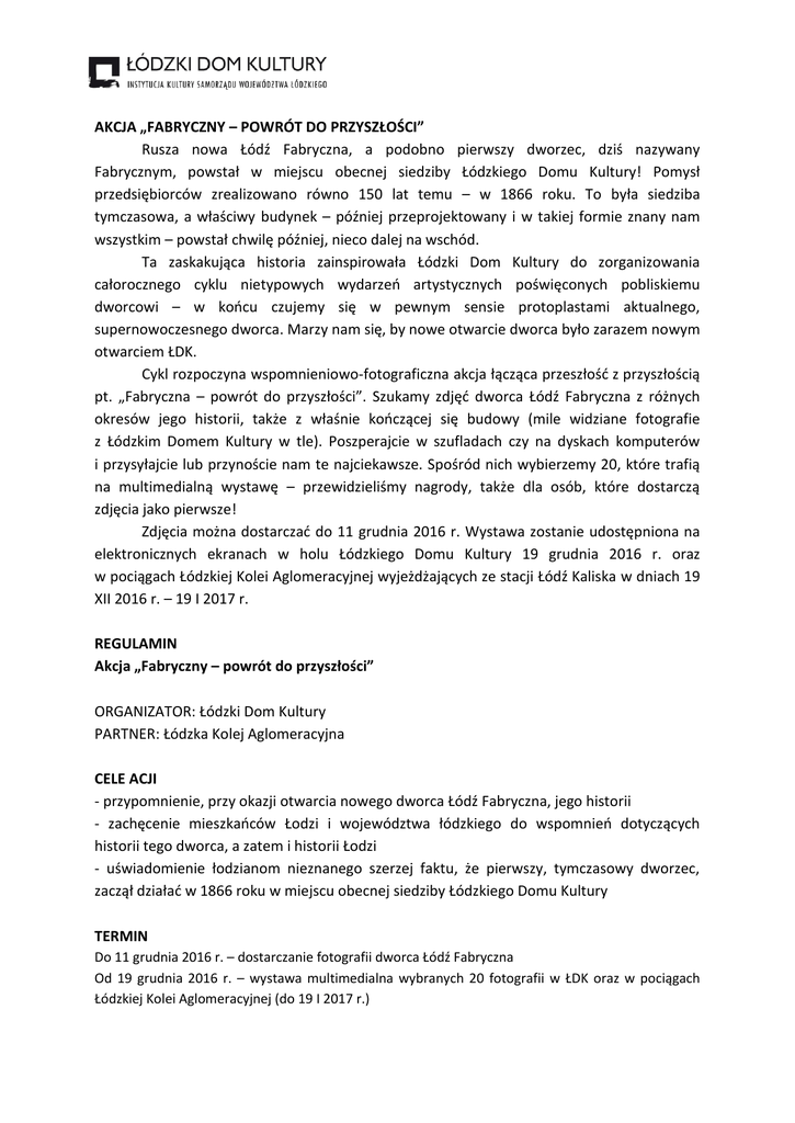AKCJA „FABRYCZNY – POWRÓT DO PRZYSZŁOŚCI” Rusza nowa Łódź Fabryczna, a podobno pierwszy dworzec, dziś nazywany Fabrycznym, powstał w miejscu obecnej siedziby Łódzkiego Domu Kultury! Pomysł przedsiębiorców zrealizowano równo 150 lat temu – w 1866 roku. To była siedziba tymczasowa, a właściwy budynek – później przeprojektowany i w takiej formie znany nam wszystkim – powstał chwilę później, nieco dalej na wschód. Ta zaskakująca historia zainspirowała Łódzki Dom Kultury do zorganizowania całorocznego cyklu nietypowych wydarzeń artystycznych poświęconych pobliskiemu dworcowi – w końcu czujemy się w pewnym sensie protoplastami aktualnego, supernowoczesnego dworca. Marzy nam się, by nowe otwarcie dworca było zarazem nowym otwarciem ŁDK. Cykl rozpoczyna wspomnieniowo-fotograficzna akcja łącząca przeszłość z przyszłością pt. „Fabryczna – powrót do przyszłości”. Szukamy zdjęć dworca Łódź Fabryczna z różnych okresów jego historii, także z właśnie kończącej się budowy (mile widziane fotografie z Łódzkim Domem Kultury w tle). Poszperajcie w szufladach czy na dyskach komputerów i przysyłajcie lub przynoście nam te najciekawsze. Spośród nich wybierzemy 20, które trafią na multimedialną wystawę – przewidzieliśmy nagrody, także dla osób, które dostarczą zdjęcia jako pierwsze! Zdjęcia można dostarczać do 11 grudnia 2016 r. Wystawa zostanie udostępniona na elektronicznych ekranach w holu Łódzkiego Domu Kultury 19 grudnia 2016 r. oraz w pociągach Łódzkiej Kolei Aglomeracyjnej wyjeżdżających ze stacji Łódź Kaliska w dniach 19 XII 2016 r. – 19 I 2017 r. REGULAMIN Akcja „Fabryczny – powrót do przyszłości” ORGANIZATOR: Łódzki Dom Kultury PARTNER: Łódzka Kolej Aglomeracyjna CELE ACJI - przypomnienie, przy okazji otwarcia nowego dworca Łódź Fabryczna, jego historii - zachęcenie mieszkańców Łodzi i województwa łódzkiego do wspomnień dotyczących historii tego dworca, a zatem i historii Łodzi - uświadomienie łodzianom nieznanego szerzej faktu, że pierwszy, tymczasowy dworzec, zaczął działać w 1866 roku w miejscu obecnej siedziby Łódzkiego Domu Kultury TERMIN Do 11 grudnia 2016 r. – dostarczanie fotografii dworca Łódź Fabryczna Od 19 grudnia 2016 r. – wystawa multimedialna wybranych 20 fotografii w ŁDK oraz w pociągach Łódzkiej Kolei Aglomeracyjnej (do 19 I 2017 r.) MIEJSCE Łódzki Dom Kultury, Łódź, ul. Traugutta 18 Pociągi Łódzkiej Kolei Aglomeracyjnej WARUNKI UCZESTNICTWA 1. Akcja „Fabryczny – powrót do przyszłości” to konkurs przeznaczony dla osób w każdym wieku. Polega na dostarczeniu fotografii z różnych okresów historii dworca Łódź Fabryczna – spośród nich zostanie wybranych 20 najciekawszych, które trafią na multimedialną wystawę. W akcji mogą wziąć udział profesjonalni fotografowie, amatorzy albo osoby dysponujące zdjęciami wykonanymi przez innych autorów, pod warunkiem, że posiadają prawa autorskie do tych zdjęć lub pisemną zgodę autora na wykorzystanie zdjęć w tej akcji. 2. Komisja konkursowa powołana przez organizatora przyzna nagrody: pierwsze pięć osób, które dostarczy zdjęcia do organizatora zgodnie z warunkami akcji, otrzyma atrakcyjne nagrody rzeczowe, a 20 osób, których zdjęcia zostaną wybrane przez komisję na multimedialną wystawę, otrzyma po 100 zł netto (osoba, która dostarczy zdjęcie jako jedna z pięciu pierwszych, a zarazem jej propozycja trafi na wystawę, otrzyma obie nagrody). 3. Jedna osoba może dostarczyć nie więcej niż pięć zdjęć – w jakości, która pozwoli na ich wykorzystanie na multimedialnej wystawie (pliki cyfrowe i skany – z rozszerzeniem JPG – powinny mieć rozdzielczość 300 dpi). 4. Warunkiem wzięcia udziału w konkursie jest przesłanie do dnia 11 grudnia 2016 r. wraz ze zgłoszonym zdjęciem konkursowym (opisanym imieniem i nazwiskiem autora oraz datą wykonania – choćby przybliżoną) czytelnie wypełnionej i własnoręcznie podpisanej imieniem i nazwiskiem karty zgłoszenia na adresy e-mailowe: [email protected] lub [email protected] (z tematem „Fabryczny”; w przypadku przysłania zgłoszenia e-mailem należy podłączyć skan podpisanej karty zgłoszenia), pocztą na adres: Łódzki Dom Kultury, Łódź, ul. Traugutta 18, 90-113 z dopiskiem „Fabryczny” lub osobiście na jedną z dwóch recepcji Łódzkiego Domu Kultury w kopercie z dopiskiem „Fabryczny”. 5. Każdy uczestnik poniżej 18 roku życia ma obowiązek dostarczyć dodatkowo oświadczenie rodziców lub opiekunów prawnych o zgodzie na udział w akcji. 6. Organizator zastrzega sobie prawo do ewentualnych zmian terminów. 7. W przypadku dostarczenia analogowych odbitek, zostaną one zwrócone właścicielowi po zakończeniu akcji, w umówionym przez strony terminie. 8. Organizator nie pokrywa kosztów dostarczenia fotografii do Łódzkiego Domu Kultury. 9. Udział w akcji jest bezpłatny, dobrowolny i oznacza akceptację regulaminu. 10. Udział w akcji jest równoznaczny z wyrażeniem zgody na przetwarzanie przez organizatora danych osobowych na potrzeby przeglądu. 11. Karta zgłoszenia i regulamin znajdują się na stronach www.ldk.lodz.pl i www.e-kalejdoskop.pl. KONTAKT Łódzki Dom Kultury ul. Traugutta 18, 90-113 Łódź e-mail: [email protected], [email protected] tel.: 797 326 217, 797 326 194