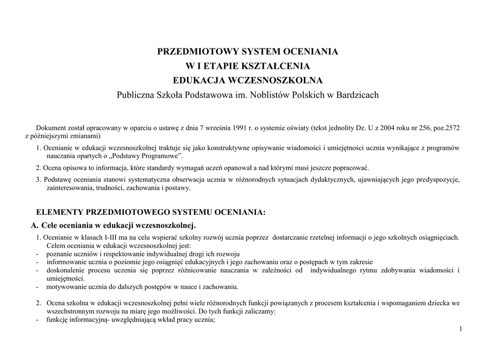 PRZEDMIOTOWY SYSTEM OCENIANIA W I ETAPIE KSZTAŁCENIA EDUKACJA WCZESNOSZKOLNA Publiczna Szkoła Podstawowa im. Noblistów Polskich w Bardzicach Dokument został opracowany w oparciu o ustawę z dnia 7 września 1991 r. o systemie oświaty (tekst jednolity Dz. U z 2004 roku nr 256, poz.2572 z późniejszymi zmianami) 1. Ocenianie w edukacji wczesnoszkolnej traktuje się jako konstruktywne opisywanie wiadomości i umiejętności ucznia wynikające z programów nauczania opartych o „Podstawy Programowe”. 2. Ocena opisowa to informacja, które standardy wymagań uczeń opanował a nad którymi musi jeszcze popracować. 3. Podstawę oceniania stanowi systematyczna obserwacja ucznia w różnorodnych sytuacjach dydaktycznych, ujawniających jego predyspozycje, zainteresowania, trudności, zachowania i postawy. ELEMENTY PRZEDMIOTOWEGO SYSTEMU OCENIANIA: A. Cele oceniania w edukacji wczesnoszkolnej. 1. Ocenianie w klasach I-III ma na celu wspierać szkolny rozwój ucznia poprzez dostarczanie rzetelnej informacji o jego szkolnych osiągnięciach. Celem oceniania w edukacji wczesnoszkolnej jest: - poznanie uczniów i respektowanie indywidualnej drogi ich rozwoju - informowanie ucznia o poziomie jego osiągnięć edukacyjnych i jego zachowaniu oraz o postępach w tym zakresie - doskonalenie procesu uczenia się poprzez różnicowanie nauczania w zależności od indywidualnego rytmu zdobywania wiadomości i umiejętności. - motywowanie ucznia do dalszych postępów w nauce i zachowaniu. 2. Ocena szkolna w edukacji wczesnoszkolnej pełni wiele różnorodnych funkcji powiązanych z procesem kształcenia i wspomaganiem dziecka we wszechstronnym rozwoju na miarę jego możliwości. Do tych funkcji zaliczamy: - funkcję informacyjną- uwzględniającą wkład pracy ucznia; 1 - funkcję korekcyjną- uwzględniającą efekt, jaki osiąga uczeń; funkcję motywacyjną- uwzględniającą możliwości ucznia. B. Zakres i przedmiot oceny opisowej ucznia. 1. Ocena opisowa uwzględnia efekty dydaktyczne i wychowawcze ucznia. 2. Ocena opisowa obejmuje opis osiągnięć dydaktycznych ucznia w zakresie: - edukacji polonistycznej: czytanie, pisanie, mówienie, słuchanie, wypowiadanie się /ustne i pisemne/, gramatykę i ortografię. - edukacji matematycznej: pojęcie liczby naturalnej i jej zapis cyfrowy, opanowanie podstawowych działań arytmetycznych /dodawanie, odejmowanie, mnożenie, dzielenie/, umiejętność rozwiązywania zadań tekstowych, wiadomości z geometrii i umiejętności praktycznych z tego zakresu - edukacji społeczno - przyrodniczej: wiedza o otaczającym środowisku przyrodniczym i środowisku społecznym, umiejętność dokonywania obserwacji - edukacji plastyczno – technicznej: kultura pracy, poznawanie architektury, malarstwa i rzeźby, działalność plastyczno - techniczna, - edukacji muzycznej: odtwarzanie i słuchanie muzyki, percepcja muzyki - wychowanie fizyczne.: sprawność fizyczno - ruchową, elementy higieny osobistej, gry i zabawy ruchowe - edukacji językowej /j. angielski/: rozpoznawanie zwrotów stosowanych na co dzień oraz krótkich tekstów, czytanie wyrazów i prostych zdań, przepisywanie wyrazów i zdań, wypowiadanie się - zajęć komputerowych: znajomość elementarnych podstaw obsługi komputera, posługiwanie się wybranymi programami, wyszukiwanie i korzystanie z informacji W procesie oceniania uwzględniane są następujące obszary: Indywidualne predyspozycje i możliwości dziecka w opanowaniu materiału edukacyjnego Stopień zaangażowania ucznia i wkład pracy w procesie zdobywania wiadomości i umiejętności, Umiejętność rozwiązywania problemów. Postępy dziecka w rozwoju społeczno – emocjonalnym 3. Szczegółowe kryteria osiągnięć edukacyjnych zawarte są w zał.1,2,3, dla poszczególnych poziomów klas I-III. 2 4. Ocena opisowa z zachowania określająca osiągnięcia wychowawcze ucznia jest formułowana zgodnie Rozp. MEN dotyczącego oceniania 5. Oceniając zachowanie ucznia nauczyciel bierze pod uwagę wymagania zawarte w rozporządzeniu MEN dotyczące oceniania: Wywiązywanie się z obowiązków ucznia Postępowanie zgodnie z dobrem społeczności szkolnej Dbałość o honor i tradycje szkoły Dbałość o piękno mowy ojczystej Dbałość o bezpieczeństwo i zdrowie własne oraz innych osób Godne i kulturalne zachowanie się w szkole i poza nią Okazywanie szacunku innym osobom OCENIANIE ZACHOWANIA UCZNIÓW w klasach I-III 1. Roczna ocena zachowania w klasach I-III ma charakter opisowy. 2. Ocenę ustala nauczyciel - wychowawca uwzględniając : - opinię innych nauczycieli uczących ucznia, - opinię niedydaktycznych pracowników szkoły, - opinię kolegów i koleżanek, - samoocenę ucznia. 3. Przy formułowaniu oceny zachowania nauczyciel bierze pod uwagę postawę ucznia podczas zajęć edukacyjnych w klasie, jak i poza nią. 4. Ocena zachowania nie może mieć wpływu na : - oceny z zajęć edukacyjnych, - promocje do klasy programowo wyższej. 5. Roczna i półroczna ocena klasyfikacyjna zachowania uwzględnia w szczególności: a) wywiązywanie się z obowiązków ucznia; b) postępowanie zgodne z dobrem społeczności szkolnej; c) dbałość o honor i tradycje szkoły; d) dbałość o piękno mowy ojczystej; e) dbałość o bezpieczeństwo i zdrowie własne oraz innych osób; 3 f) godne, kulturalne zachowanie się w szkole o poza nią; g) okazywanie szacunku innym osobom, h) udział w pracach na rzecz szkoły i środowiska 6. Ustala się następującą skalę bieżącego oceniania zachowania: 6 - uczeń reprezentuje postawę wzorową 5 – uczeń reprezentuje postawę bardzo dobrą 4 – uczeń reprezentuje postawę dobrą 3 – uczeń reprezentuje postawę niewłaściwą W klasach młodszych zachęcamy uczniów do jak najlepszego zachowania , dlatego nie stosujemy oceny poniżej 3. 7. Kryteria oceny bieżącej zachowania: 6 – Uczeń bardzo sumiennie przygotowuje się do zajęć, często podejmuje zadania dodatkowe. Nie opus