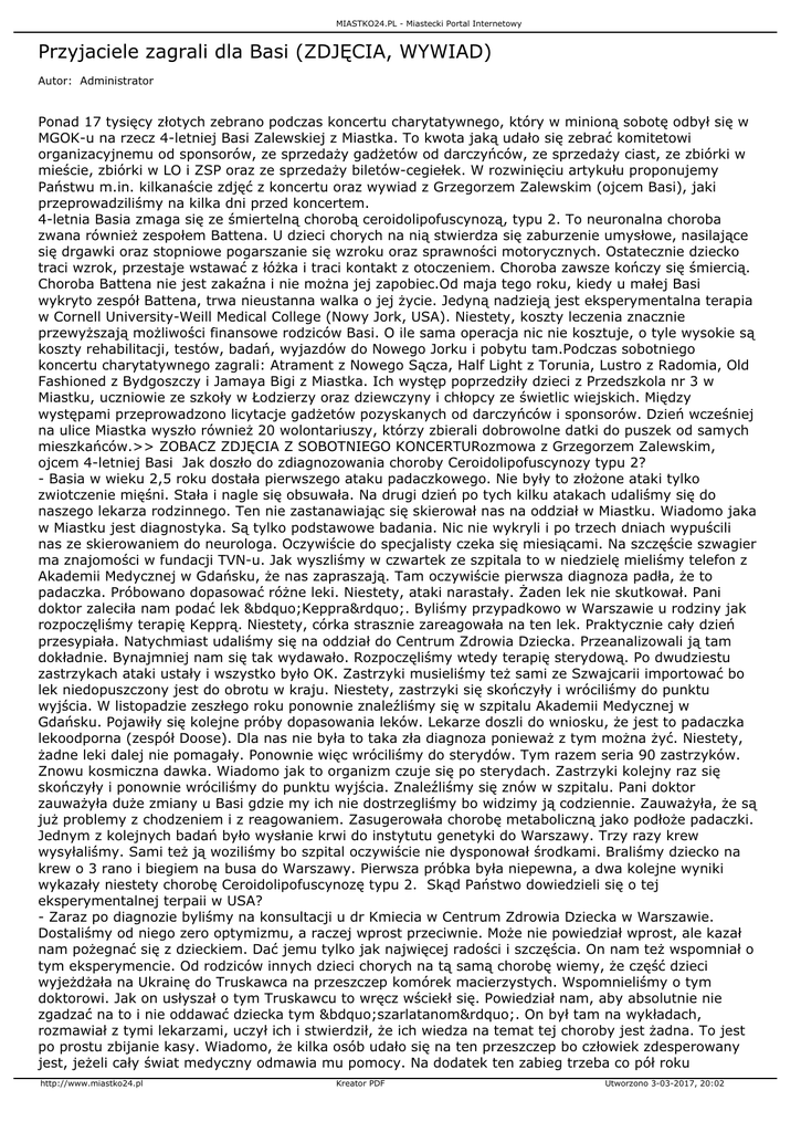 MIASTKO24.PL - Miastecki Portal Internetowy Przyjaciele zagrali dla Basi (ZDJĘCIA, WYWIAD) Autor: Administrator Ponad 17 tysięcy złotych zebrano podczas koncertu charytatywnego, który w minioną sobotę odbył się w MGOK-u na rzecz 4-letniej Basi Zalewskiej z Miastka. To kwota jaką udało się zebrać komitetowi organizacyjnemu od sponsorów, ze sprzedaży gadżetów od darczyńców, ze sprzedaży ciast, ze zbiórki w mieście, zbiórki w LO i ZSP oraz ze sprzedaży biletów-cegiełek. W rozwinięciu artykułu proponujemy Państwu m.in. kilkanaście zdjęć z koncertu oraz wywiad z Grzegorzem Zalewskim (ojcem Basi), jaki przeprowadziliśmy na kilka dni przed koncertem. 4-letnia Basia zmaga się ze śmiertelną chorobą ceroidolipofuscynozą, typu 2. To neuronalna choroba zwana również zespołem Battena. U dzieci chorych na nią stwierdza się zaburzenie umysłowe, nasilające się drgawki oraz stopniowe pogarszanie się wzroku oraz sprawności motorycznych. Ostatecznie dziecko traci wzrok, przestaje wstawać z łóżka i traci kontakt z otoczeniem. Choroba zawsze kończy się śmiercią. Choroba Battena nie jest zakaźna i nie można jej zapobiec.Od maja tego roku, kiedy u małej Basi wykryto zespół Battena, trwa nieustanna walka o jej życie. Jedyną nadzieją jest eksperymentalna terapia w Cornell University-Weill Medical College (Nowy Jork, USA). Niestety, koszty leczenia znacznie przewyższają możliwości finansowe rodziców Basi. O ile sama operacja nic nie kosztuje, o tyle wysokie są koszty rehabilitacji, testów, badań, wyjazdów do Nowego Jorku i pobytu tam.Podczas sobotniego koncertu charytatywnego zagrali: Atrament z Nowego Sącza, Half Light z Torunia, Lustro z Radomia, Old Fashioned z Bydgoszczy i Jamaya Bigi z Miastka. Ich występ poprzedziły dzieci z Przedszkola nr 3 w Miastku, uczniowie ze szkoły w Łodzierzy oraz dziewczyny i chłopcy ze świetlic wiejskich. Między występami przeprowadzono licytacje gadżetów pozyskanych od darczyńców i sponsorów. Dzień wcześniej na ulice Miastka wyszło również 20 wolontariuszy, którzy zbierali dobrowolne datki do puszek od samych mieszkańców.>> ZOBACZ ZDJĘCIA Z SOBOTNIEGO KONCERTURozmowa z Grzegorzem Zalewskim, ojcem 4-letniej Basi Jak doszło do zdiagnozowania choroby Ceroidolipofuscynozy typu 2? - Basia w wieku 2,5 roku dostała pierwszego ataku padaczkowego. Nie były to złożone ataki tylko zwiotczenie mięśni. Stała i nagle się obsuwała. Na drugi dzień po tych kilku atakach udaliśmy się do naszego lekarza rodzinnego. Ten nie zastanawiając się skierował nas na oddział w Miastku. Wiadomo jaka w Miastku jest diagnostyka. Są tylko podstawowe badania. Nic nie wykryli i po trzech dniach wypuścili nas ze skierowaniem do neurologa. Oczywiście do specjalisty czeka się miesiącami. Na szczęście szwagier ma znajomości w fundacji TVN-u. Jak wyszliśmy w czwartek ze szpitala to w niedzielę mieliśmy telefon z Akademii Medycznej w Gdańsku, że nas zapraszają. Tam oczywiście pierwsza diagnoza padła, że to padaczka. Próbowano dopasować różne leki. Niestety, ataki narastały. Żaden lek nie skutkował. Pani doktor zaleciła nam podać lek „Keppra”. Byliśmy przypadkowo w Warszawie u rodziny jak rozpoczęliśmy terapię Kepprą. Niestety, córka strasznie zareagowała na ten lek. Praktycznie cały dzień przesypiała. Natychmiast udaliśmy się na oddział do Centrum Zdrowia Dziecka. Przeanalizowali ją tam dokładnie. Bynajmniej nam się tak wydawało. Rozpoczęliśmy wtedy terapię sterydową. Po dwudziestu zastrzykach ataki ustały i wszystko było OK. Zastrzyki musieliśmy też sami ze Szwajcarii importować bo lek niedopuszczony jest do obrotu w kraju. Niestety, zastrzyki się skończyły i wróciliśmy do punktu wyjścia. W listopadzie zeszłego roku ponownie znaleźliśmy się w szpitalu Akademii Medycznej w Gdańsku. Pojawiły się kolejne próby dopasowania leków. Lekarze doszli do wniosku, że jest to padaczka lekoodporna (zespół Doose). Dla nas nie była to taka zła diagnoza ponieważ z tym można żyć. Niestety, żadne leki dalej nie pomagały. Ponownie więc wróciliśmy do sterydów. Tym razem seria 90 zastrzyków. Znowu kosmiczna dawka. Wiadomo jak to organizm czuje się po sterydach. Zastrzyki kolejny raz się skończyły i ponownie wróciliśmy do punktu wyjścia. Znaleźliśmy się znów w szpitalu. Pani doktor zauważyła duże zmiany u Basi gdzie my ich nie dostrzegliśmy bo widzimy ją codziennie. Zauważyła, że są już problemy z chodzeniem i z reagowaniem. Zasugerowała chorobę metaboliczną jako podłoże padaczki. Jednym z kolejnych badań było wysłanie krwi do instytutu genetyki do Warszawy. Trzy razy krew wysyłaliśmy. Sami też ją woziliśmy bo szpital oczywiście nie dysponował środkami. Braliśmy dziecko na krew o 3 rano i biegiem na busa do Warszawy. Pierwsza próbka była niepewna, a dwa kolejne wyniki wykazały niestety chorobę Ceroidolipofuscynozę typu 2. Skąd Państwo dowiedzieli się o tej eksperymentalnej terpaii w USA? - Zaraz po diagnozie byliśmy na konsultacji u dr Kmiecia w Centrum Zdrowia Dziecka w Warszawie. Dostaliśmy od niego zero optymizmu, a raczej wprost przeciwnie. Może nie powiedział wprost, ale kazał nam pożegnać się z dzieckiem. Dać jemu tylko jak najwięcej radości i szczęścia. On nam też wspomniał o tym eksperymencie. Od rodziców innych dzieci chorych na tą samą chorobę wiemy, że część dzieci wyjeżdżała na Ukrainę do Truskawca na przeszczep komórek macierzystych. Wspomnieliśmy o tym doktorowi. Jak on usłyszał o tym Truskawcu to wręcz wściekł się. Powiedział nam, aby absolutnie nie zgadzać na to i nie oddawać dziecka tym „szarlatanom”. On był tam na wykładach, rozmawiał z tymi lekarzami, uczył ich i stwierdził, że ich wiedza na temat tej choroby jest żadna. To jest po prostu zbijanie kasy. Wiadomo, że kilka osób udało się na ten przeszczep bo człowiek zdesperowany j