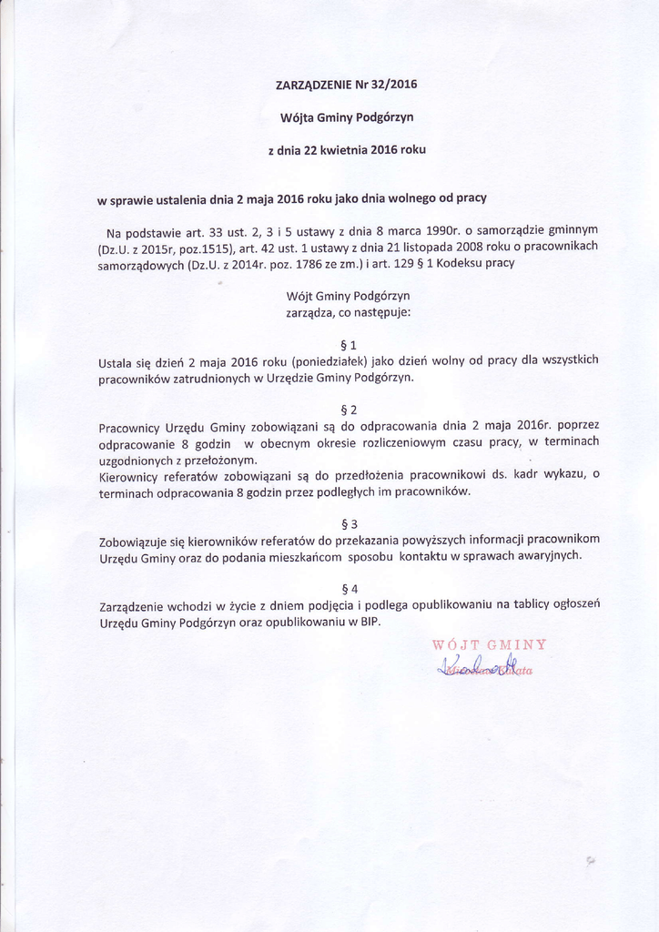 zARzĄDzEN|ENt 32120]!6 Wójta GminyPodgórzyn z dnia 22 kwietnia2016 roku w sprawieustaleniadnia2 maja2016rokujako dniawolnegood pracy gminnym Na podstawieart' 33 ust. 2,3 i 5 ustawyz dnia 8 marca1990r.o samorzqdzie (Dz.U.z 2OL5r,poz.1515), art.42 ust.l ustawyz dnia2I listopada2008rokuo pracownikach (Dz.|J, z 2ol4r. poz.L786ze zm.)i art.129s 1Kodeksupracy samorzqdowych Wójt GminyPodgórzyn zarzqdza,co następuje: S1 jakodzieńwo|nyod pracydla wszystkich (poniedziatek) roku 2016 2 maja dzień Usta|a się pracownikówzatrudnionychw UrzędzieGminy Podgórzyn. 52 dnia2 maja 2016r.poprzez sq do odpracowania UrzęduGminyzobowiązani Pracownicy czasupracy,w terminach 8 godzin w obecnymokresierozliczeniowym odpracowanie z przełożonym. uzgodnionych pracownikowids. kadr wykazu,o Kierownicvreferatówzobowiqzanisq do przedtożenia im pracowników' 8 godzinprzezpod|egłych terminachodpracowania 93 powyższych przekazania informacjipracownikom się kierownikówreferatówdo Zobowiązuje awaryjnych. w sprawach sposobukontaktu UrzęduGminyorazdo podaniamieszkańcom $4 na tab|icyogtoszeń podjęcia ipod|egaopub|ikowaniu z dniem W życie wchodzi Zarządzenie W B|P. orazopub|ikowaniu UrzęduGminyPodgórzyn WOJ'I GT'TNY