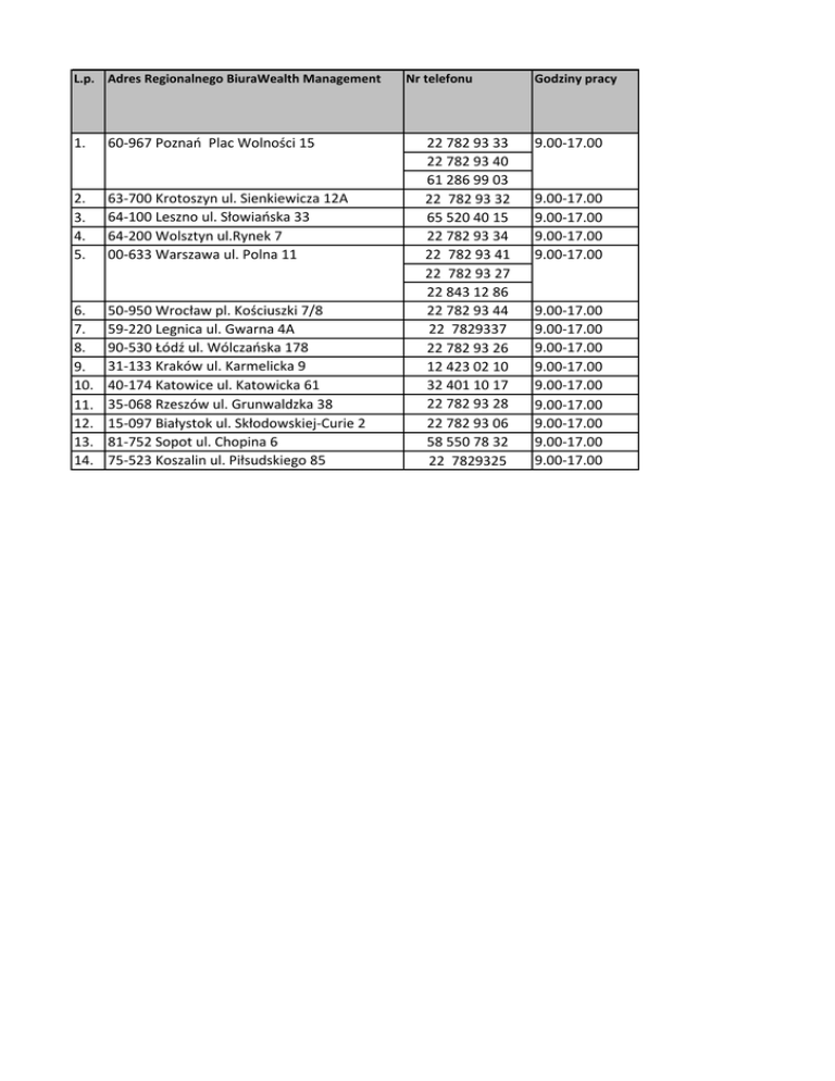 L.p. Adres Regionalnego BiuraWealth Management 1. 60-967 Poznań Plac Wolności 15 2. 3. 4. 5. 63-700 Krotoszyn ul. Sienkiewicza 12A 64-100 Leszno ul. Słowiańska 33 64-200 Wolsztyn ul.Rynek 7 00-633 Warszawa ul. Polna 11 6. 7. 8. 9. 10. 11. 12. 13. 14. 50-950 Wrocław pl. Kościuszki 7/8 59-220 Legnica ul. Gwarna 4A 90-530 Łódź ul. Wólczańska 178 31-133 Kraków ul. Karmelicka 9 40-174 Katowice ul. Katowicka 61 35-068 Rzeszów ul. Grunwaldzka 38 15-097 Białystok ul. Skłodowskiej-Curie 2 81-752 Sopot ul. Chopina 6 75-523 Koszalin ul. Piłsudskiego 85 Nr telefonu 22 782 93 33 22 782 93 40 61 286 99 03 22 782 93 32 65 520 40 15 22 782 93 34 22 782 93 41 22 782 93 27 22 843 12 86 22 782 93 44 22 7829337 22 782 93 26 12 423 02 10 32 401 10 17 22 782 93 28 22 782 93 06 58 550 78 32 22 7829325 Godziny pracy 9.00-17.00 9.00-17.00 9.00-17.00 9.00-17.00 9.00-17.00 9.00-17.00 9.00-17.00 9.00-17.00 9.00-17.00 9.00-17.00 9.00-17.00 9.00-17.00 9.00-17.00 9.00-17.00