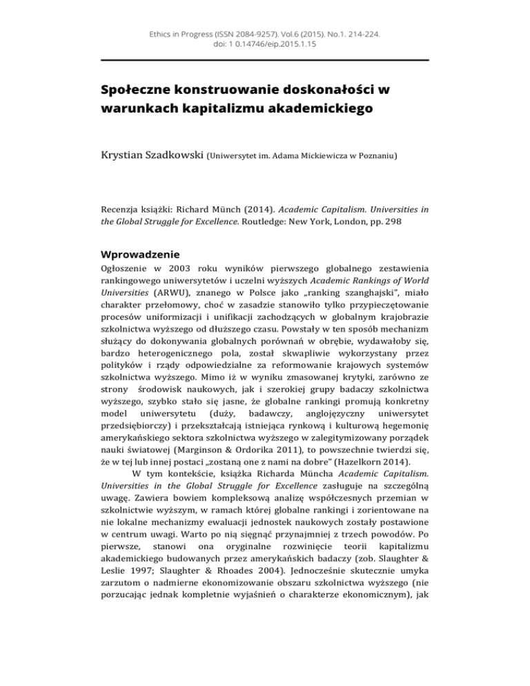 Ethics in Progress (ISSN 2084-9257). Vol.6 (2015). No.1. 214-224. doi: 1 0.14746/eip.2015.1.15 Społeczne konstruowanie doskonałości w warunkach kapitalizmu akademickiego Krystian Szadkowski (Uniwersytet im. Adama Mickiewicza w Poznaniu) Recenzja książki: Richard Münch (2014). Academic Capitalism. Universities in the Global Struggle for Excellence. Routledge: New York, London, pp. 298 Wprowadzenie Ogłoszenie w 2003 roku wyników pierwszego globalnego zestawienia rankingowego uniwersytetów i uczelni wyższych Academic Rankings of World Universities (ARWU), znanego w Polsce jako „ranking szanghajski”, miało charakter przełomowy, choć w zasadzie stanowiło tylko przypieczętowanie procesów uniformizacji i unifikacji zachodzących w globalnym krajobrazie szkolnictwa wyższego od dłuższego czasu. Powstały w ten sposób mechanizm służący do dokonywania globalnych porównań w obrębie, wydawałoby się, bardzo heterogenicznego pola, został skwapliwie wykorzystany przez polityków i rządy odpowiedzialne za reformowanie krajowych systemów szkolnictwa wyższego. Mimo iż w wyniku zmasowanej krytyki, zarówno ze strony środowisk naukowych, jak i szerokiej grupy badaczy szkolnictwa wyższego, szybko stało się jasne, że globalne rankingi promują konkretny model uniwersytetu (duży, badawczy, anglojęzyczny uniwersytet przedsiębiorczy) i przekształcają istniejąca rynkową i kulturową hegemonię amerykańskiego sektora szkolnictwa wyższego w zalegitymizowany porządek nauki światowej (Marginson & Ordorika 2011), to powszechnie twierdzi się, że w tej lub innej postaci „zostaną one z nami na dobre” (Hazelkorn 2014). W tym kontekście, książka Richarda Müncha Academic Capitalism. Universities in the Global Struggle for Excellence zasługuje na szczególną uwagę. Zawiera bowiem kompleksową analizę współczesnych przemian w szkolnictwie wyższym, w ramach której globalne rankingi i zorientowane na nie lokalne mechanizmy ewaluacji jednostek naukowych zostały postawione w centrum uwagi. Warto po nią sięgnąć przynajmniej z trzech powodów. Po pierwsze, stanowi ona oryginalne rozwinięcie teorii kapitalizmu akademickiego budowanych przez amerykańskich badaczy (zob. Slaughter & Leslie 1997; Slaughter & Rhoades 2004). Jednocześnie skutecznie umyka zarzutom o nadmierne ekonomizowanie obszaru szkolnictwa wyższego (nie porzucając jednak kompletnie wyjaśnień o charakterze ekonomicznym), jak Krystian Szadkowski również lokalizuje tę teorię w rzeczywistości europejskiego szkolnictwa wyższego. Po drugie, odpowiada na formułowane przez różnych badaczy pytania o możliwość pożytecznego zaaplikowania teorii pól i kapitałów Pierre’a Bourdieu do analiz systemów szkolnictwa wyższego, które zmuszone są stawiać czoła wyzwaniom epoki globalizacji i heteronormizacji pola akademickiego przez siły rynkowe (zob. Naidoo 2004, Marginson 2007). Po trzecie zaś, i być może najważniejsze, książka ta analizując ostatnich 20 lat przemian w niemieckim systemie szkolnictwa wyższego, dostarcza przekonujących i istotnych argumentów w dyskusji o wszelkiej maści mechanizmach ewaluacji, pościgu za „doskonałością” czy reformowaniu nastawionym na podniesienie wydajności pracy naukowej, które to argumenty z ostrożnością, ale i powodzeniem, można zastosować w obecnie toczącej się w Polsce dyskusji. Pokazując wysiłki reformatorskie w szerokim, globalnym kontekście, Münch nie odwraca bowiem uwagi od wszystkich ich negatywnych konsekwencji dla pola nauki i szkolnictwa wyższego. Zanim jednak przejdę do szczegółowego omówienia powyższych trzech powodów, dla których warto sięgnąć po tę książkę, postaram się zwięźle zrekonstruować jej strukturę i podstawowe założenia przyjmowane przez Müncha. 1. Nowe Zarządzanie Publiczne a społeczne konstruowanie doskonałości Książka Müncha składa się z siedmiu rozdziałów oraz wstępu i zakończenia. Pierwsze dwa skupiają się przede wszystkim na nakreśleniu fundamentalnych zmian, jakim poddawane są systemy szkolnictwa wyższego na całym świecie. Chodzi tu przede wszystkim o ich reformowanie zgodnie z założeniami Nowego Zarządzania Publicznego (Ferlie et al. 2008), wytwarzanie quasi-‐ rynków i quasi-‐konkurencji w systemach i wzmacnianie figury uniwersytetu przedsiębiorczego, przejście od rozdzielania środków finansowych zgodnie z logiką równo dystrybuowanych nakładów (input) do rozdzielania ich w oparciu o wyniki (output), jak również funkcjonujący niejako ponad tymi procesami globalny mechanizm rankingów umożliwiający szybkie i skuteczne porównania między instytucjami z całego świata. Wszystkie te procesy odpowiedzialne są za powstanie i upowszechnienie się kapitalizmu akademickiego. Sprzyjają one kolonizacji autonomicznej sfery nauki przez mechanizmy względem niej zewnętrzne i obce, których działanie podkopuje jej pomyślny rozwój. Ekonomia polityczna kapitalizmu akademickiego, którą w oparciu o teorię kapitałów Pierre’a Bourdieu usiłuje zbudować Münch, „musi odkryć dlaczego i w jaki sposób ekonomiczna logika akumulacji kapitału przenika pole nauki, w jaki sposób ta penetracja zmienia walkę o uznanie w polu akademickim, oraz jakie konsekwencje niesie dla wolności akademickiej oraz ewolucji wiedzy naukowej” (2014, 11). Kolejne dwa rozdziały skupiają 215 Społeczne konstruowanie doskonałości w warunkach kapitalizmu akademickiego się na mechanizmach rządzących ustalaniem statusu w polu i konsekwencjach tego procesu. Rozdział trzeci poświęcony jest temu, w jaki sposób i dlaczego scentralizowane (na poziomie globalnym lub krajowym) procedury ewaluacji osiągnięć badawczych jednostek naukowych (szczególnie te promowane w ramach paradygmatu Nowego Zarządzania Publicznego) wykorzystując zarówno opinie eksperckie, jak i dane liczbowe, nie tyle „mierzą”, co tworzą, a następnie konsolidują, pogłę