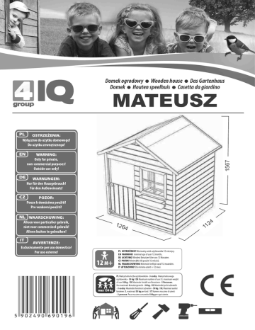 Domek ogrodowy l Wooden house l Das Gartenhaus Domek l Houten speelhuis l Casetta da giardino 1567 MATEUSZ 126 4 24 1 1 Spis elementów / List of parts / Elementeliste / Seznam þásti / Onderdelen lijst / Elenco degli elementi Numer / Number / Anzahl / þíslo / Nummer / Numero 1 2 3 4 5 6 7 8 9 10 11 12 13 14 15 Opis / Description / Beschreibung / Popis / Omschrijving / Descrizione Czċğci / Parts / Element / Konstrukÿní prvky / Onderdeel / Elemento Zmontowana páyta / Assemble board / Teilplatte / Smontovaná þást / Voorgemonteerd paneel / Pannello montato Zmontowana páyta / Assemble board / Teilplatte ĝciana przednia / Front wall / Die Vorderwand / PĜední stČna / Voorwand / / Smontovaná þást / Voorgemonteerd paneel Piastra frontale / Pannello montato Zmontowana páyta / Assemble board / Teilplatte ĝciana tylna / Rear wall / Rückenplatte / Zadní stČna / Achterwand / Pia/ Smontovaná þást / Voorgemonteerd paneel stra posteriore / Pannello montato Zmontowana páyta / Assemble board / Teilplatte ĝciana boczna / Side wall / Seitenplatte / Boþní stČna / Zijwand / Pannel/ Smontovaná þást / Voorgemonteerd paneel lo laterale / Pannello montato Zmontowana páyta / Assemble board / Teilplatte ĝciana szczytowa / Front wall / Giebelwand / Štít / Gevel / Pannello di chiu/ Smontovaná þást / Voorgemonteerd paneel sura / Pannello montato Zmontowana páyta / Assemble board / Teilplatte Drzwi / Doors / Tür / DveĜe / Deur / Porta / Smontovaná þást / Voorgemonteerd paneel / Pannello montato Zmontowana páyta / Assemble board / Teilplatte Páyta dachowa / Roof panel / Dachplatte / StĜešní desky / Dakpaneel / Pan/ Smontovaná þást / Voorgemonteerd paneel nello da tetto / Pannello montato Deska krawĊdziowa / Edge board / Kratenrand / Ukonþovací stĜešní lišty / Listwa 12x47 / Strip 12x47 / Leiste 12x47 / Lista 12x47 / Boeiboord / Trave da bordo Lat 12x47 / Listello 12x47 / Lišta 12x47 Listwa wykoĔczeniowa naroĪna / Corner Þnishing strip / Eckeleiste / UkoListwa 12x47 / Strip 12x47 / Leiste 12x47 / Lista 12x47 / nþovací lišty rohová / Hoek afdeklat / Listello di riÞnitura per angolo Lat 12x47 / Listello 12x47 Listwa drzwiowa / Door strip / Türleiste / DveĜní lišta / Deur lat / Listello da Listwa 12x20 / Strip 12x20 / Leiste 12x20 / Lista 12x20 / porta Lat 12x20 / Listello 12x20 Listwa dachowa / Roof strip / Dachleisten / StĜešní lišta / Dak lat / ListelKątownik 20x35 / Angle 20x35 / Klammer 20x35 / Hoek lo da tetto 20x35 / Angolare 20x35 Zmontowane okno / Window / Fenster montiert / Okno / Raamkozijn / Finestra montata Listwy maskujące / Garnishing strips / Maskenstreifen / Boþní lišty / Afwer18x18 klat / Canaline Oszklenie / Glass / Plexiglas / Plexisklo / Plexiglas / Vetro Plexi 2 mm Rama okna / Window frame / Fensterrahmen / Rámeþek k oknu / Raamko- Zmontowana czĊĞü / Assemble part / montierten Teil / zijn / Telaio per Þnestra Smontovaná þást / Voorgemonteerd / Parte montata Doniczka podokienna (elementy) / Flowerpot (elements) / Pot Fenster / Oknení truhlík / Bloembak / Vaso da Þnestra (elementi) Pokrycie dachowe / Roof cover / Dachdecken / Dachpappe / StĜešní krytina Bituminous / Papa / Dakbedekking / Copertura per tetto Zawias / Hinge / Scharnier / Panty / Scharnier / Cerniera Páyta podáogowa / Floor board / Bodenplatte / Podlaha / Vloerplaat / Pannello per pavimento WkrĊt chromowany / Chrom-plated screw / Chrom Schraube / Vrut / Bichromaat schroef / Bullone WkrĊt chromowany / Chrom-plated screw / Chrom Zestaw montaĪowy / Assemble kit / Montážní sada / Einbausätz / Montage Schraube / Vrut / Bichromaat schroef / Bullone WkrĊt chromowany / Chrom-plated screw / Chrom set / Kit di montaggio Schraube / Vrut / Bichromaat schroef / Bullone WkrĊt chromowany / Chrom-plated screw / Chrom Schraube / Vrut / Bichromaat schroef / Bullone Papniaki / Nails / Dachnagel / HĜebíky / Spijkers / Chiodo Wymiar w mm / Size in mm / Größe in mm / Rozmčr v mm / Maat in mm / Dimensione mm 1100x620 1170x1140 1170x1140 1100x1140 1264x360 460x570 1220x800 L840 L1160 L1040 L1220 415x415 415x415 470x470 1000x1220 3,5x50 3,5x40 3x20 3x25 3x10 PL Instrukcja WSTĉP: Przed rozpoczĊciem montaĪu domku zalecamy uwaĪne zapoznanie siĊ z Instrukcjami montaĪu I sposobem postĊpowania przedstawionym w tej broszurze. UWAGA! Produkt ten jest przeznaczony wyáącznie do uĪytku wáasnego, domowego i zewnĊtrznego. Nie jest przeznaczony do uĪytku publicznego. Dla dzieci w wieku od 1 do 14 lat. Minimalny wiek uĪytkownika 12 miesiĊcy. Maksymalna dopuszczalna waga jednego uĪytkownika 50 kg. Maksymalne obciąĪenie domku 150 kg (maks. 3 uĪytkowników). SPRAWDZENIE ZAWARTOĝCI OPAKOWANIA: Nawet jeĞli nie przewidują PaĔstwo natychmiastowego montaĪu domku, zalecane jest w momencie otrzymania towaru dokáadne sprawdzenie zawartoĞci palety pod kątem kompletnoĞci I prawidáowoĞci pojedynczych elementów konstrukcji na podstawie zaáączonego wykazu czĊĞci. W przypadku stwierdzenia nieprawidáowoĞci, proszĊ skontaktowaü siĊ ze sprzedawcą. W przypadku gdy stwierdzicie PaĔstwo brak poszczególnych elementów lub ich záamanie (zwáaszcza elementów sáuĪących do budowy domku), nie rozpoczynajcie montaĪu domku - zbyt dáuga przerwa w montaĪu moĪe spowodowaü zdeformowanie siĊ niektórych elementów, a to nie jest objĊte gwarancją. NaleĪy zatroszczyü siĊ o to, by drewniane elementy konstrukcji domku byáy uáoĪone na páasko, w miejscu suchym, osáoniĊtym przed sáoĔcem i zapewniü wentylacjĊ pomiĊdzy poszczególnymi czĊĞciami, aby uchroniü je przed deformacją i pleĞnią. WYBÓR ODPOWIEDNIEGO MIEJSCA Domek powinien byü ustawiony na stabilnym podáoĪu. NaleĪy zachowaü bezpieczny, 2 m odstĊp od innych przeszkód takich jak: barierki, garaĪe, budynki, gaáĊzie drzew, sznurki na pranie, kable telefoniczne. Produkt nie moĪe byü ustawiony na podáoĪu twardym typu: beton, asfalt, i temu podobne. PRZYGOTOWANIE PODàO