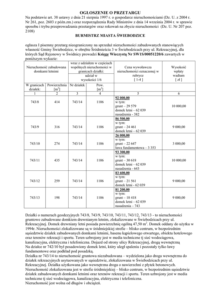 OGŁOSZENIE O PRZETARGU Na podstawie art. 38 ustawy z dnia 21 sierpnia 1997 r. o gospodarce nieruchomościami (Dz. U. z 2004 r. Nr 261, poz. 2603 z późn.zm.) oraz rozporządzenia Rady Ministrów z dnia 14 września 2004 r. w sprawie sposobu i trybu przeprowadzania przetargów oraz rokowań na zbycie nieruchomości (Dz. U. Nr 207 poz. 2108) BURMISTRZ MIASTA ŚWIEBODZICE ogłasza I pisemny przetarg nieograniczony na sprzedaż nieruchomości zabudowanych stanowiących własność Gminy Świebodzice, w obrębie Śródmieścia 3 w Świebodzicach przy ul. Rekreacyjnej, dla których Sąd Rejonowy w Świdnicy prowadzi Księgę Wieczystą Nr SW1S/00051220/6 zawartych w poniższym wykazie: wraz z udziałem w częściach wspólnych nieruchomości w granicach działki: udział w wysokości 1/6 W granicach Powierzchnia Nr działek Pow. [m2] [m2] działek: 1 2 3 4 Nieruchomość zabudowana domkami letnimi 743/8 414 743/14 1106 743/9 316 743/14 1106 743/10 274 743/14 1106 743/11 435 743/14 1106 743/12 259 743/14 1106 743/13 198 743/14 1106 Cena wywoławcza nieruchomości oznaczonej w rubryce [ 1-4 ] 5 92 000,00 w tym: grunt – 29 579 domek letni – 62 039 nasadzenia - 382 86 500,00 w tym: grunt – 24 461 domek letni – 62 039 26 000,00 w tym: grunt – 22 647 ława fundamentowa – 3 353 93 300,00 w tym: grunt – 30 618 domek letni – 62 039 nasadzenia - 643 83 600,00 w tym: grunt – 21 561 domek letni - 62 039 81 200,00 w tym: grunt – 18 418 domek letni – 62 039 nasadzenia – 743 Wysokość wpłaty wadium [ zł ] 6 10 000,00 9 000,00 3 000,00 10 000,00 9 000,00 9 000,00 Działki o numerach geodezyjnych 743/8, 743/9, 743/10, 743/11, 743/12, 743/13 - to nieruchomości gruntowe zabudowane domkiem drewnianym letnim, zlokalizowane w Świebodzicach przy ul. Rekreacyjnej. Domek drewniany letni posiada powierzchnię ogólną 47,50 m2. Domek oddany do użytku w 1994r. Nieruchomości zlokalizowane są w śródmiejskiej strefie – blisko centrum, w bezpośrednim sąsiedztwie działek zabudowanych domkami letnimi, basenu kąpielowego otwartego, obiektu hotelowego oraz terenów rekreacji i sportu. Teren uzbrojony jest w media techniczne tj sieć wodociągowa, kanalizacyjna, elektryczna i telefoniczna. Dojazd od strony ulicy Rekreacyjnej, drogą wewnętrzną Na działce nr 742/10 był posadowiony domek letni, który uległ spaleniu i pozostały tylko ławy fundamentowe oraz podkład pod posadzką. Działka nr 743/14 to nieruchomość gruntowa niezabudowana – wydzielona jako droga wewnętrzna do działek rekreacyjnych usytuowanych w sąsiedztwie, zlokalizowana w Świebodzicach przy ul. Rekreacyjnej. Działka użytkowana jako wewnętrzna droga o nawierzchni z płytek betonowych. Nieruchomość zlokalizowana jest w strefie śródmiejskiej – blisko centrum, w bezpośrednim sąsiedztwie działek zabudowanych domkami letnimi oraz terenów rekreacji i sportu. Teren uzbrojony jest w media techniczne tj sieć wodociągowa, kanalizacyjna, elektryczna i telefoniczna. Nieruchomość jest wolna od długów i obciążeń. Zgodnie z planem zagospodarowania przestrzennego miasta Świebodzice teren przeznaczony: teren usług sportu i rekreacji wraz z hotelem sportowym; rodzaj użytków Bz- tereny rekreacyjne. Burmistrz Miasta Świebodzice zaprasza osoby fizyczne i prawne do składania pisemnych ofert w terminie do 08 października 2010 r. do godz. 15 00 Oferty należy składać w zamkniętych kopertach pod adresem: Urząd Miejski Świebodzice 58-160 Świebodzice ul. Rynek 1 z dopiskiem: „Przetarg na sprzedaż nieruchomości zabudowanych domkami letnimi przy ul. Rekreacyjnej w Świebodzicach”. Oferta pisemna powinna zawierać : 1. imię i nazwisko, nazwę (firmę) oraz adres (siedzibę) oferenta; jeżeli oferentem jest osoba prawna – aktualny wyciąg z rejestru sądowego lub zaświadczenie o wpisie do ewidencji działalności gospodarczej , dokumenty potwierdzające własność firmy, 2. datę sporządzenia oferty, 3. oświadczenie, że Oferent zapoznał się z warunkami przetargu i przyjmuje te warunki bez zastrzeżeń, 4. oferowaną cenę cyfrowo oraz słownie i sposób jej zapłaty, 5. proponowany sposób realizacji dodatkowych warunków przetargu, 6. koncepcję zagospodarowania nieruchomości będącej przedmiotem przetargu wraz z wizualizacją graficzną podejmowanego przedsięwzięcia na tej nieruchomości, 7. dowód wpłaty wadium, które należy wpłacić w kasie Urzędu Miejskiego w Świebodzicach, ul. Stefana Żeromskiego 27 najpóźniej do dnia 08.10.2010 r. do godz. 1500. W przypadku regulowania wadium za pośrednictwem banków lub poczty, liczy się data wpływu na Konto Urzędu Miejskiego w Świebodzicach nr 28 1090 2356 0000 0006 0000 0129 w Banku Zachodnim WBK S.A. 2 Oddz. Świebodzice ul. Aleje Lipowe 5. Część jawna przetargu odbędzie się w siedzibie Urzędu Miejskiego w Świebodzicach, pok. nr 7, dnia 13 października 2010r. o godz. 1100 Oferentowi, który przedłoży dokumenty potwierdzające wybudowanie z własnych środków budynku lub prawa jego własności, a także dokonał własnym staraniem i na własny koszt nasadzeń krzewów i roślin ozdobnych na nieruchomości będącej przedmiotem przetargu, zaliczona zostanie cena budynku domku letniego i cena nasadzeń krzewów i roślin ozdobnych na poczet ceny nabycia całej nieruchomości. Wpłacone wadium przez uczestnika przetargu, który przetarg wygra, podlega zaliczeniu na poczet ceny sprzedaży nieruchomości. Pozostałym uczestnikom przetargu, wadium zostanie zwrócone po zakończeniu przetargu, jednak nie później niż przed upływem 3 dni od dnia zamknięcia przetargu. W razie uchylenia się Nabywcy od zawarcia umowy sprzedaży nieruchomości, wpłacone wadium ulega przepadkowi na rzecz Gminy Świebodzice. Cena nieruchomości ustalona w drodze przetargu powinna być wpłacona w całości nie później niż do dnia zawarcia umowy przenoszącej własność tej nieruchomości w Banku Zachodnim WBK S.A. Oddz. Świebodzice ul. A