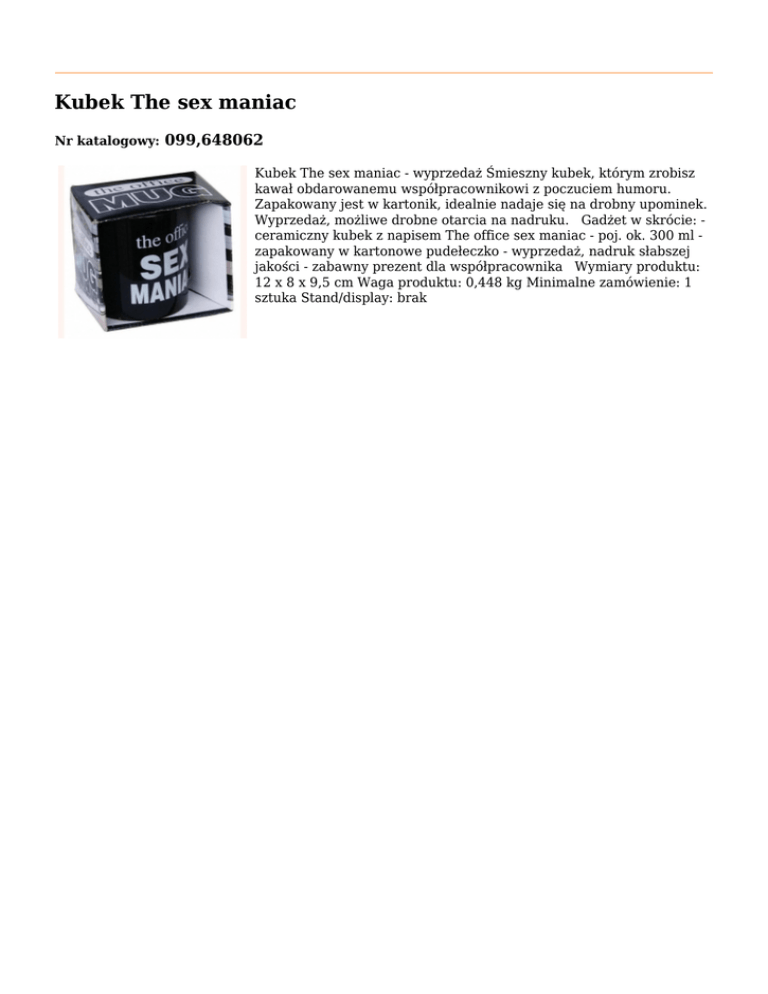 Kubek The sex maniac Nr katalogowy: 099,648062 Kubek The sex maniac - wyprzedaż Śmieszny kubek, którym zrobisz kawał obdarowanemu współpracownikowi z poczuciem humoru. Zapakowany jest w kartonik, idealnie nadaje się na drobny upominek. Wyprzedaż, możliwe drobne otarcia na nadruku. Gadżet w skrócie: ceramiczny kubek z napisem The office sex maniac - poj. ok. 300 ml zapakowany w kartonowe pudełeczko - wyprzedaż, nadruk słabszej jakości - zabawny prezent dla współpracownika Wymiary produktu: 12 x 8 x 9,5 cm Waga produktu: 0,448 kg Minimalne zamówienie: 1 sztuka Stand/display: brak