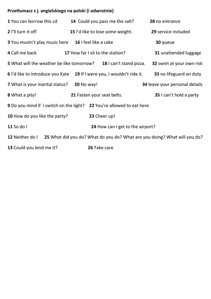 Przetłumacz z j. angielskiego na polski (i odwrotnie) 1 You can borrow this cd 14 Could you pass me the salt? 28 no entrance 2 I’ll turn it off 15 I’d like to lose some weight. 29 service included 3 You mustn’t play music here 4 Call me back 16 I feel like a cake 30 queue 17 How far I sit to the station? 5 What will the weather be like tomorrow? 31 unattended luggage 18 I can’t stand pizza. 6 I’d like to introduce you Kate 19 If I were you, I wouldn’t ride it. 7 What is your marital status? 20 No way! 8 What a pity! 32 swim at your own risk 33 no lifeguard on duty 34 leave your personal details 21 Fasten your seat belts. 35 I can’t hold a party 9 Do you mind if I switch on the light? 22 You’re allowed to eat here 10 How do you like the party? 11 So do I 12 Neither do I 23 Cheer up! 24 How can I get to the airport? 25 What did you do? What do you do? What are you doing? What will you do? 13 Could you lend me it? 26 Take care