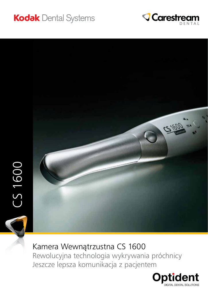 CS 1600 Kamera Wewnątrzustna CS 1600 Rewolucyjna technologia wykrywania próchnicy Jeszcze lepsza komunikacja z pacjentem Najwcześniejsza i najbezpieczniejsza metoda wykrywania próchnicy Ograniczenia dotychczasowych metod Wczesne wykrycie próchnicy podczas regularnych przeglądów stomatologicznych pozwala na zastosowanie małoinwazyjnych i bezbolesnych metod leczenia. Ocena stanu pacjenta za pomocą tradycyjnych metod – wizualnych i dotykowych (zgłębnik) jest często nie tylko mało precyzyjna, ale także może prowadzić do dodatkowych uszkodzeń szkliwa. Z kolei diagnostyka radiologiczna często umożliwia wykrycie próchnicy w bardziej zaawansowanych stadiach. Wynika to z faktu, że obrazowanie rentgenowskie jest pozwala na wykrycie zmian próchniczych nie mniejszych niż 3mm podczas gdy drobne powierzchniowe ogniska mogą zostać przeoczone. Wczesne wykrywanie próchnicy Wczesne rozpoznanie zmian pozwala na zastosowanie najbardziej efektywnych metod leczenia. Próchnica wykryta w początkowym stadium może być wyleczona przez proste zabiegi demineralizacyjne zamiast kosztownego i często bolesnego zabiegu odbudowy. Kamera CS1600 pozwala lekarzowi na wykrycie ognisk choroby w najwcześniejszym stadium. Zastosowana technologia w wiarygodny sposób ocenia stan szkliwa i wykrywa pierwsze przebarwienia powierzchni. Kamera umożliwia detekcję zmian zarówno na powierzchniach zgryzowych jak i na szyjkach. Jeszcze lepsza komunikacja z pacjentem Nowa kamera CS1600 w niespotykany sposób ułatwia komunikację z pacjentem zapewniając uzyskanie szybkiej akceptacji zaproponowanego planu leczenia. Wyraźne zaznaczenie na obrazie wykrytych zmian jest czytelne zarówno dla lekarza jak i dla pacjenta. Proste w użyciu oprogramowanie pozwala na archiwizowanie zdjęć wraz z innymi obrazami medycznymi tworząc tym samym spójną dokumentację medyczną procesu leczenia. Uzyskane zdjęcia pozwalają śledzić cofanie się zmian próchniczych w procesie remineralizacji. Zaawansowana technologicznie głowica kamery: • 6 punktowe oświetlenie LED będące częścią systemu pomiaru fluorescencji • 12 punktowy system LED generujący idealnie białe światło w odpowiedniej polaryzacji Technologia przynosząca korzyści Podwójna funkcjonalność W przeciwieństwie do tradycyjnych kamer wewnątrzustnych urządzenie CS1600 łączy w sobie zalety wysokiej jakości kamery wewnątrzustnej oraz profesjonalnego narzędzia diagnostycznego. Użycie kamery CS1600 zapewnia zatem na wiarygodną i precyzyjną diagnostykę, a także jeszcze lepszą komunikację z pacjentem. Gabinet wyposażony w tak innowacyjne urządzenie jest postrzegany jako nowoczesny i prestiżowy. Najwyższa rozdzielczość i unikalna funkcja auto-focusa (<1 mm) jest idealna dla endodoncji. Pełny zakres obrazowania: cały zgryz, zdjęcia makro i tryb portretowy. Łatwa wizualizacja trudnodostępnych i niewidocznych gołym okiem obszarów (pęknięcia, ubytki, komora zęba). Prosta integracja Wygodne połączenie wykorzystujące złącze USB oraz wykorzystanie standardu TWAIN pozwala na współpracę urządzenia z kilkoma komputerami, a także na integrację z innymi programami dla stomatologii. Wsparcie serwisowe gwarantowane. Jak wszystkie produkty koncernu Carestream Kodak Dental, Kamera CS 1600 i platforma programowa CS Software są intuicyjne i łatwe w użyciu. Ponadto wymagają minimalnego przeszkolenia wstępnego i zapewniają maksymalną efektywność. Co więcej, stając się posiadaczem kamery CS 1600 zyskujesz pełne wsparcie serwisowe doświadczonych inżynierów. Unikalna technologia wykrywania próchnicy Ulepszony system obrazowania W kamerze CS1600 zastosowano innowacyjną technologię likwidacji refleksów odbitego światła od jasnych i gładkich powierzchni. Obraz z tradycyjnych kamer jest często zakłócony poprzez refleksy światła odbitego, które mogą maskować ogniska choroby. System redukcji refleksów pozwala na uzyskanie niezniekształconego obrazu, który ma najwyższą wartość diagnostyczną Unikalna technologia FIRE System wykrywania próchnicy może pracować zarówno w trybie kamery jak i aparatu fotograficznego. Po wykonaniu zdjęcia diagnozowanego obszaru kamera automatycznie uruchamia tryb szczegółowej analizy, który zapewnia najbardziej selektywną detekcję ognisk choroby. W tym trybie uaktywnia się technologia FIRE (Fluorescence Imaging and Reflection Enhancement) która analizuje zarówno obraz w świetle widzialnym jak i fluorescencję wzbudzoną przez promieniowanie ultrafioletowe. Obszary wykrytych ognisk choroby są zaznaczane na obrazie kolorem zależnym od stopnia zaawansowania próchnicy. Łatwość i ergonomia pracy Kamera CS 1600 jest łatwa i intuicyjna w eksploatacji. W przeciwieństwie do tradycyjnych urządzeń, które wymagają kilkukrotnego skanowania diagnozowanego obszaru i interakcji lekarza, system CS1600 wykonuje badanie w pełni automatycznie i natychmiast prezentuje je na ekranie komputera. Lekarz uzyskuje zatem możliwość błyskawicznego wykrywania zmian chorobowych w kolejnych obszarach bez konieczności wyjmowania kamery z jamy ustnej osoby badanej. Obraz ze standardowej kamery wewnątrzustnej Obraz z kamery CS1600 w trybie detekcji Refleksy światła Obecność refleksów światła może maskować ogniska próchnicy. Obraz wideo Usunięcie refleksów świetlnych powoduje uwidocznienie zmian chorobowych. Stop klatka Kamera CS1600 pozwala na detekcję zmian w trybie wideo, a wykonanie stop klatki automatycznie uruchamia pogłębiona analizę obrazu w technologii FIRE Kamera CS1600 może pracować w trzech trybach: • Standardowy • Tryb wykrywania próchnicy • Zdjęcia portretowe Inżynieria sukcesu Ergonomia i Elegancja Eleganckie Akcesoria Kamera CS1600 jest bardzo lekka i została zaprojektowana w ten sposób by zapewnić maksymalny komfort pracy dla każdego lekarza. Dwa przyciski stop klatki umiejscowione z przodu i tyłu urządzenia pozwalają na ich