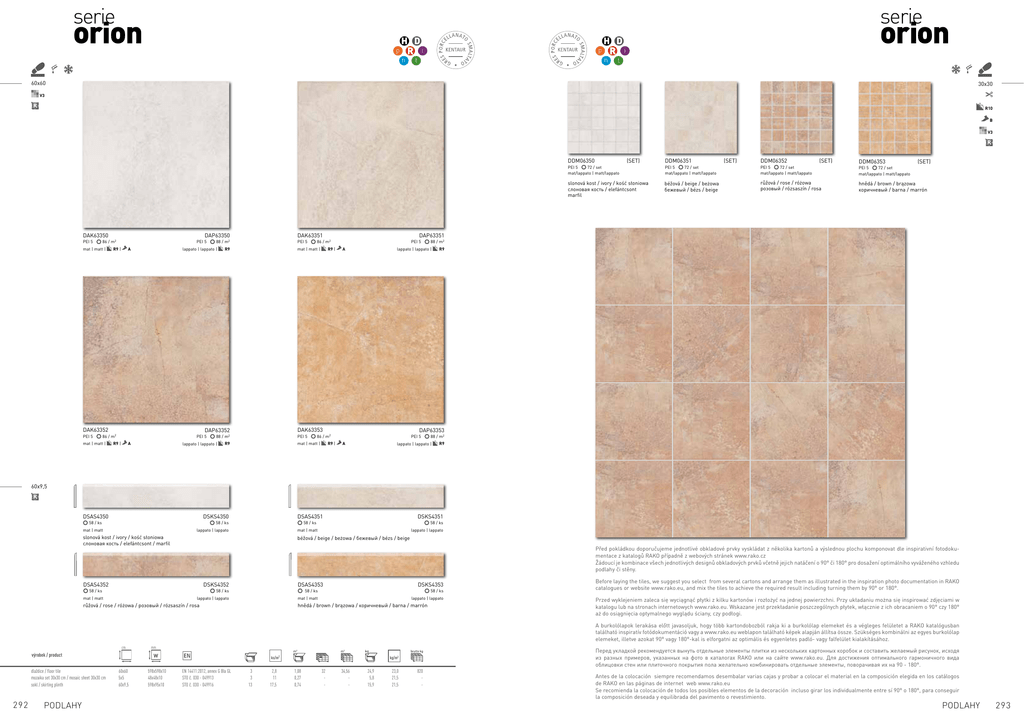 serie serie orion orion 60x60 30x30 V3 R10 B V3 DAK63350 PEI 5 DAP63350 86 / m2 mat | matt | PEI 5 R9 | A DAK63352 PEI 5 PEI 5 R9 PEI 5 R9 | A lappato | lappato | R9 | PEI 5 A PEI 5 R9 PEI 5 72 / set mat/lappato | matt/lappato slonová kost / ivory / kość słoniowa слоновая кость / elefántcsont marfil béžová / beige / beżowa бежевый / bézs / beige růžová / rose / różowa розовый / rózsaszín / rosa DDM06353(SET) PEI 5 72 / set mat/lappato | matt/lappato hnědá / brown / brązowa коричневый / barna / marrón R9 DAP63353 86 / m2 R9 | mat | matt | DDM06352(SET) PEI 5 72 / set mat/lappato | matt/lappato 88 / m2 lappato | lappato | DAK63353 88 / m2 DDM06351(SET) PEI 5 72 / set mat/lappato | matt/lappato DAP63351 86 / m2 mat | matt | DAP63352 86 / m2 mat | matt | DAK63351 88 / m2 lappato | lappato | DDM06350(SET) PEI 5 A 88 / m2 lappato | lappato | R9 60x9,5 DSAS4350 DSKS4350 DSAS4351 DSKS4351 58 / ks 58 / ks 58 / ks 58 / ks mat | matt lappato | lappato mat | matt lappato | lappato slonová kost / ivory / kość słoniowa слоновая кость / elefántcsont / marfil béžová / beige / beżowa / бежевый / bézs / beige Před pokládkou doporučujeme jednotlivé obkladové prvky vyskládat z několika kartonů a výslednou plochu komponovat dle inspirativní fotodokumentace z katalogů RAKO případně z webových stránek www.rako.cz Žádoucí je kombinace všech jednotlivých designů obkladových prvků včetně jejich natáčení o 90° či 180° pro dosažení optimálního vyváženého vzhledu podlahy či stěny. DSAS4352 DSKS4352 DSAS4353 DSKS4353 58 / ks 58 / ks 58 / ks 58 / ks mat | matt lappato | lappato mat | matt lappato | lappato růžová / rose / różowa / розовый / rózsaszín / rosa hnědá / brown / brązowa / коричневый / barna / marrón Before laying the tiles, we suggest you select from several cartons and arrange them as illustrated in the inspiration photo documentation in RAKO catalogues or website www.rako.eu, and mix the tiles to achieve the required result including turning them by 90° or 180°. Przed wyklejeniem zaleca się wyciągnąć płytki z kilku kartonów i rozłożyć na jednej powierzchni. Przy układaniu można się inspirować zdjęciami w katalogu lub na stronach internetowych www.rako.eu. Wskazane jest przekładanie poszczególnych płytek, włącznie z ich obracaniem o 90° czy 180° aż do osiągnięcia optymalnego wyglądu ściany, czy podłogi. A burkolólapok lerakása előtt javasoljuk, hogy több kartondobozból rakja ki a burkolólap elemeket és a végleges felületet a RAKO katalógusban található inspiratív fotódokumentáció vagy a www.rako.eu weblapon található képek alapján állítsa össze. Szükséges kombinálni az egyes burkolólap elemeket, illetve azokat 90° vagy 180°-kal is elforgatni az optimális és egyenletes padló- vagy falfelület kialakításához. cm výrobek / product dlaždice / floor tile mozaika set 30x30 cm / mosaic sheet 30x30 cm sokl / skirting plinth 292 PODLAHY mm W 60x60 5x5 60x9,5 598x598x10 48x48x10 598x95x10 ks/m2 EN 14411:2012, annex G BIa GL STO č. 030 - 049913 STO č. 030 - 049916 3 3 13 2,8 11 17,5 kg/m2 1,08 0,27 0,74 32 - - 34,56 - - 24,9 5,8 15,9 23,0 21,5 21,5 820 - Перед укладкой рекомендуется вынуть отдельные элементы плитки из нескольких картонных коробок и составить желаемый рисунок, исходя из разных примеров, указанных на фото в каталогах RAKO или на сайте www.rako.eu. Для достижения оптимального гармоничного вида облицовки стен или плиточного покрытия пола желательно комбинировать отдельные элементы, поворачивая их на 90 - 180°. Antes de la colocación siempre recomendamos desembalar varias cajas y probar a colocar el material en la composición elegida en los catálogos de RAKO en las páginas de internet web www.rako.eu Se recomienda la colocación de todos los posibles elementos de la decoración incluso girar los individualmente entre sí 90° o 180°, para conseguir la composición deseada y equilibrada del pavimento o revestimiento. PODLAHY 293