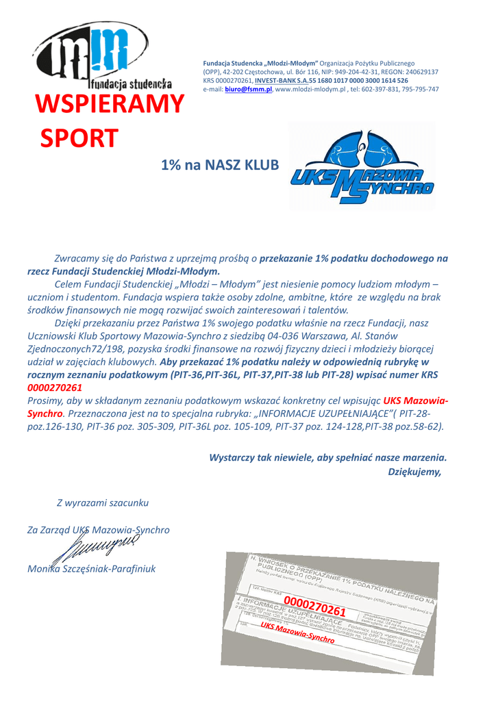 WSPIERAMY SPORT Fundacja Studencka „Młodzi-Młodym” Organizacja Pożytku Publicznego (OPP), 42-202 Częstochowa, ul. Bór 116, NIP: 949-204-42-31, REGON: 240629137 KRS 0000270261, INVEST-BANK S.A.55 1680 1017 0000 3000 1614 526 e-mail: [email protected], www.mlodzi-mlodym.pl , tel: 602-397-831, 795-795-747 1% na NASZ KLUB Zwracamy się do Państwa z uprzejmą prośbą o przekazanie 1% podatku dochodowego na rzecz Fundacji Studenckiej Młodzi-Młodym. Celem Fundacji Studenckiej „Młodzi – Młodym” jest niesienie pomocy ludziom młodym – uczniom i studentom. Fundacja wspiera także osoby zdolne, ambitne, które ze względu na brak środków finansowych nie mogą rozwijać swoich zainteresowań i talentów. Dzięki przekazaniu przez Państwa 1% swojego podatku właśnie na rzecz Fundacji, nasz Uczniowski Klub Sportowy Mazowia-Synchro z siedzibą 04-036 Warszawa, Al. Stanów Zjednoczonych72/198, pozyska środki finansowe na rozwój fizyczny dzieci i młodzieży biorącej udział w zajęciach klubowych. Aby przekazać 1% podatku należy w odpowiednią rubrykę w rocznym zeznaniu podatkowym (PIT-36,PIT-36L, PIT-37,PIT-38 lub PIT-28) wpisać numer KRS 0000270261 Prosimy, aby w składanym zeznaniu podatkowym wskazać konkretny cel wpisując UKS MazowiaSynchro. Przeznaczona jest na to specjalna rubryka: „INFORMACJE UZUPEŁNIAJĄCE”( PIT-28poz.126-130, PIT-36 poz. 305-309, PIT-36L poz. 105-109, PIT-37 poz. 124-128,PIT-38 poz.58-62). Wystarczy tak niewiele, aby spełniać nasze marzenia. Dziękujemy, Z wyrazami szacunku Za Zarząd UKS Mazowia-Synchro Monika Szczęśniak-Parafiniuk