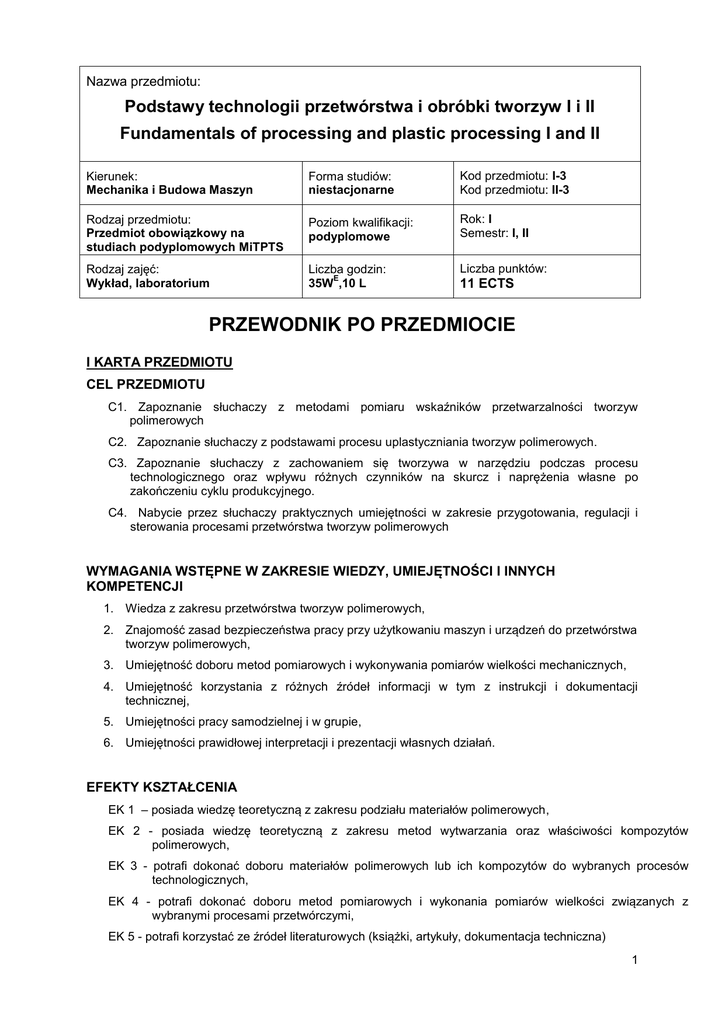 przewodnik po przedmiocie - Zakład Przetwórstwa Polimerów