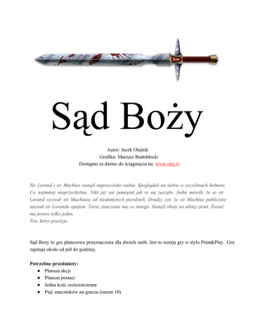 Sąd Boży Autor: Jacek Olejnik Grafika: Mariusz Białobłocki Dostępne za darmo do ściągnięcia na: www.olej.tv Sir Lorand i sir Machius stanęli naprze ci wko siebie. Spoglą dali na siebie w szczelinach hełmów. Co najm niej nieprzy chyl nie. Nikt już nie pamię tał jak to się zaczęło. Jedni mówili, że to sir Lorand wyzwał sir Machiusa od niedomy tych pierdzieli. Drudzy zaś, że sir Machius pub licznie nazwał sir Loranda opo jem. Teraz znacze nie ma co innego. Stanęli oboje na ubitej ziemi. Zostać ma prawo tylko jeden. Ten, który przeżyje. Sąd Boży to gra planszowa przeznaczona dla dwóch osób. Jest to wersja gry w stylu Print&Play. Gra zajmuje około od pół do godziny. Potrzebne przedmioty: ● Plansza akcji ● Plansza postaci ● Jedna kość sześciościenna ● Pięć znaczników na gracza (razem 10) Inicjatywa Najwyższą inicjatywę posiada gracz, który ma mniej punktów życia. W przypadku remisu gracz, grający stroną Wyzywającą. Oznaczenia i testy: Przy teście ataku trafiasz, jeśli wyrzucisz na kości 4, 5 albo 6. Ten test ma również znaczenie przy zadawaniu obrażeń. To co widać poniżej jest bonusem do obrażeń. W tym przypadku bonus wynosi +7. Czyli: Jeśli wyrzucisz 1,2,3 to nic się nie dzieje. Jeśli wyrzucisz 4 to zadajesz 4+7 (+/ ewentualna broń) obrażeń. Jeśli wyrzucisz 5 to zadajesz 5+7 (+/ ewentualna broń) obrażeń. Jeśli wyrzucisz 6 to zadajesz 6+7 (+/ ewentualna broń) obrażeń. Modyfikatory celności i obrażeń. Taki układ oznacza 1 do celności. Przykład: Gdy na kości wypadnie 6 traktujemy jako 5 (także przy obliczaniu obrażeń). Jest tutaj także bonus +5 do obrażeń. Biorąc poprzedni test celności, jeśli wyrzuciliśmy 5 na kości oto co się dzieje: Najpierw z 5 staje się 4. Sprawdzamy czy nadal trafiamy przeciwnika. Trafiamy, więc sprawdzamy obrażenia: 4(z kości)+7(z bonusu karty akcji)+6(z bonusu broni)=17 obrażeń. Przygotowanie do gry: Na planszy postaci Wyzywający wybiera jedną kartę przygotowania, która daje bonusy do końca gry. Zaznacza to jednym ze znaczników. Potem Wyzwany wybiera broń, którą będą walczyli do końca gry, jednak tylko on dostaje bonus (zakłada się, że jest lepiej wyszkolony w posługiwaniu się tą bronią). Zaznacza to jednym ze znaczników. Zaczyna się posiadając 70 punktów życia. Wygrana: Przegrywa gracz, który będzie posiadał mniej niż 1 punkt życia. Gra: Gra dzieli się na dwie fazy: Faza Taktyki i Faza Walki. Faza taktyki: Gracze mają teraz po trzy znaczniki ataku, które rozdysponowują w następujący sposób: ● Gracz z najwyższą inicjatywą rzuca kością i ustawia pierwszy znacznik ataku na karcie, którą wskazała mu kość. Potem to samo robi drugi gracz. ● Gracz z najwyższą inicjatywą wybiera jedną z kart, na której nie ma swojego znacznika i tam kładzie drugi znacznik ataku. Potem robi to drugi gracz. ● Gracz z najwyższą inicjatywą wybiera jedną z kart, na której nie ma swojego znacznika i tam kładzie trzeci znacznik ataku. Potem robi to drugi gracz. ● Gracz z najwyższą inicjatywą usuwa jeden wybrany przez siebie znacznik ataku przeciwnika. Potem to samo robi drugi gracz. Na planszy powinny zostać po dwa znaczniki ataku na gracza. Faza walki: Gracze naprzemiennie zgodnie z inicjatywą wykonują wszystkie działania z listy zgodnie z kolejnością, tak długo jak skończą się znaczniki ataku na planszy: ● Wybór jednej z kart ataku, na której mamy znacznik ataku. ● Test ataku: ○ Jeśli udany, zdejmujemy oba znaczniki ataku, a przeciwnik obniża swoje życie o wartość zadanych przez nas obrażeń. ○ Jeśli nieudany, zdejmujemy jeden znacznik ataku. Uwaga: Potknięcie jest zawsze udane! W skrócie: Faza taktyki: ● Losowa karta ataku ● Wybór jednej karty ataku ● Wybór drugiej karty ataku ● Usunięcie przeciwnikowi jednej z trzech kart ataku Faza walki: ● Test pierwszej karty ataku ● Test drugiej karty ataku, jeśli pierwszy się nie powiódł Podziękowania za testy i konsultacje: Hubert Minta Maciej Marek Wochna Licencja Gra zostaje wydana na licencji CCDY 2.0. Za uznanie autorstwa uważa się publikacje, bądź wydruk w widocznym miejscu: autora, grafika, adresu strony www.olej.tv oraz loga strony dostępnego m.in. pod adresem: www.olej.tv/?attachment_id=555