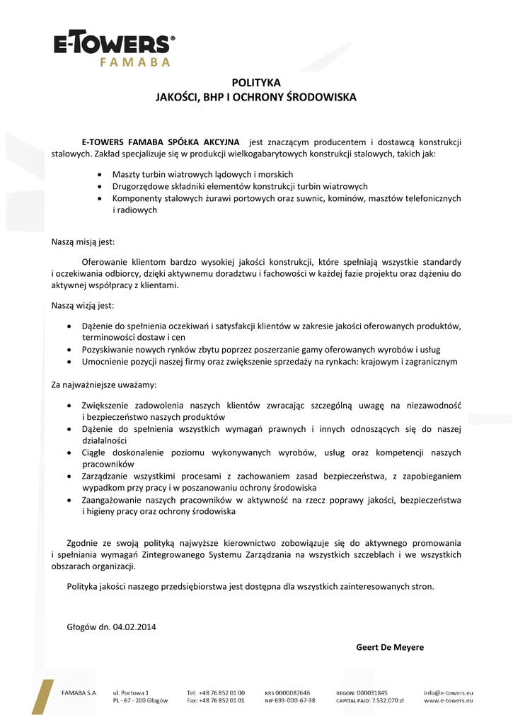 POLITYKA JAKOŚCI, BHP I OCHRONY ŚRODOWISKA E-TOWERS FAMABA SPÓŁKA AKCYJNA jest znaczącym producentem i dostawcą konstrukcji stalowych. Zakład specjalizuje się w produkcji wielkogabarytowych konstrukcji stalowych, takich jak: Maszty turbin wiatrowych lądowych i morskich Drugorzędowe składniki elementów konstrukcji turbin wiatrowych Komponenty stalowych żurawi portowych oraz suwnic, kominów, masztów telefonicznych i radiowych Naszą misją jest: Oferowanie klientom bardzo wysokiej jakości konstrukcji, które spełniają wszystkie standardy i oczekiwania odbiorcy, dzięki aktywnemu doradztwu i fachowości w każdej fazie projektu oraz dążeniu do aktywnej współpracy z klientami. Naszą wizją jest: Dążenie do spełnienia oczekiwań i satysfakcji klientów w zakresie jakości oferowanych produktów, terminowości dostaw i cen Pozyskiwanie nowych rynków zbytu poprzez poszerzanie gamy oferowanych wyrobów i usług Umocnienie pozycji naszej firmy oraz zwiększenie sprzedaży na rynkach: krajowym i zagranicznym Za najważniejsze uważamy: Zwiększenie zadowolenia naszych klientów zwracając szczególną uwagę na niezawodność i bezpieczeństwo naszych produktów Dążenie do spełnienia wszystkich wymagań prawnych i innych odnoszących się do naszej działalności Ciągłe doskonalenie poziomu wykonywanych wyrobów, usług oraz kompetencji naszych pracowników Zarządzanie wszystkimi procesami z zachowaniem zasad bezpieczeństwa, z zapobieganiem wypadkom przy pracy i w poszanowaniu ochrony środowiska Zaangażowanie naszych pracowników w aktywność na rzecz poprawy jakości, bezpieczeństwa i higieny pracy oraz ochrony środowiska Zgodnie ze swoją polityką najwyższe kierownictwo zobowiązuje się do aktywnego promowania i spełniania wymagań Zintegrowanego Systemu Zarządzania na wszystkich szczeblach i we wszystkich obszarach organizacji. Polityka jakości naszego przedsiębiorstwa jest dostępna dla wszystkich zainteresowanych stron. Głogów dn. 04.02.2014 Geert De Meyere
