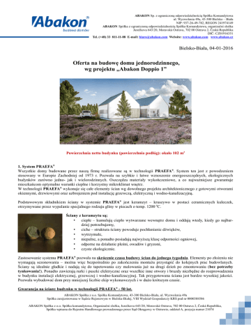 ABAKON Sp. z ograniczoną odpowiedzialnością Spółka Komandytowa ul. Wyzwolenia 49a, 43-300 Bielsko – Biała NIP: 937-26-49-782, REGON 241974149 ABAKON Spółka z ograniczoną odpowiedzialnością Spółka Komandytowa, organizačni složka Jurečkova 643/20, Moravskà Ostrava, 702 00 Ostrava 2, Česká Republika DIČ: CZ01916351 Tel. (+48) 33 811-11-88 E-mail: [email protected] Website: www.abakon.com www.abakon.cz Bielsko-Biała, 04-01-2016 Oferta na budowę domu jednorodzinnego, wg projektu „Abakon Doppio 1” Powierzchnia netto budynku (powierzchnia podłóg): około 102 m2 1. System PRAEFA® Wszystkie domy budowane przez naszą firmę realizowane są w technologii PRAEFA®. System ten jest z powodzeniem stosowany w Europie Zachodniej od 1973 r. Pozwala na szybkie i łatwe wznoszenie energooszczędnych, ekologicznych budynków zarówno jedno- jak i wielorodzinnych. Oszczędza materiały wykończeniowe, a co najważniejsze gwarantuje mieszkańcom optymalne warunki cieplne i korzystny mikroklimat wnętrz. W technologii PRAEFA® wykonuje się całe elementy ścian wg dowolnego projektu architektonicznego z gotowymi otworami okiennymi, drzwiowymi oraz uzbrojeniem pod instalację grzewczą, elektryczną i wodno-kanalizacyjną. Podstawowym składnikiem ściany w systemie PRAEFA® jest keramzyt – kruszywo w postaci ceramicznych kuleczek, otrzymywane przez wypalanie specjalnego rodzaju gliny w piecach o temp. 1200 0C. Ściany z keramzytu są; • ciepłe – kumulują ciepło wytwarzane wewnątrz domu i oddają wtedy, kiedy go najbardziej potrzebujemy, • ciche – struktura ściany powoduje pochłanianie dźwięków, • wytrzymałe, • niepalne, a ponadto posiadają najwyższą klasę odporności ogniowej, • odporne na działanie pleśni, owadów i gryzoni, • czyste ekologicznie. Zastosowanie systemu PRAEFA® pozwala na skrócenie czasu budowy ścian do jednego tygodnia. Elementy po złożeniu nie wymagają sezonowania – można więc bezpośrednio po zakończeniu montażu przystąpić do kolejnych prac budowlanych. Ściany są idealnie gładkie i nadają się do tapetowania czy malowania już na drugi dzień po zmontowaniu (bez potrzeby tynkowania!). Ponadto zawierają rurki i puszki elektryczne oraz wszelkie inne otwory i bruzdy niezbędne do rozprowadzenia w budynku instalacji elektrycznej, grzewczej i wodno-kanalizacyjnej. Tak przygotowana ściana jest bardzo wysokiej jakości. Pozwala wybudować dom przy mniejszej liczbie ekip wykonawczych i w dużo krótszym czasie. Gwarancja na ściany budynku w technologii PRAEFA® - 50 lat. ABAKON Spółka z o.o. Spółka Komandytowa, 43-300 Bielsko-Biała, ul. Wyzwolenia 49a Spółka zarejestrowana w Sądzie Rejonowym w Bielsku-Białej, VIII Wydział Gospodarczy KRS pod nr 0000388586 ABAKON Spółka z o.o. Spółka komandytowa, Organizačni složka, Jurečkova 643/20, Moravskà Ostrava, 702 00 Ostrava 2, Česká Republika, Spółka wpisana do Rejestru Handlowego prowadzonego przez Sąd Okręgowy w Ostrawie, oddział A, pozycja numer 21074 ABAKON Sp. z ograniczoną odpowiedzialnością Spółka Komandytowa ul. Wyzwolenia 49a, 43-300 Bielsko – Biała NIP: 937-26-49-782, REGON 241974149 ABAKON Spółka z ograniczoną odpowiedzialnością Spółka Komandytowa, organizačni složka Jurečkova 643/20, Moravskà Ostrava, 702 00 Ostrava 2, Česká Republika DIČ: CZ01916351 Tel. (+48) 33 811-11-88 E-mail: [email protected] Website: www.abakon.com www.abakon.cz PRAEFA® ZOSTAŁA NAGRODZONA ZŁOTYM MEDALEM ZA SYSTEM BUDOWY Z ELEMENTÓW KERAMZYTOWYCH NA MIĘDZYNARODOWYCH TARGACH BUDOWLANYCH W POZNANIU BUDMA 2003! PRAEFA® OTRZYMAŁA CERTYFIKAT JAKOŚCI ISO:9001 ISO 9001:2000 Podsumowując: Z bardzo bogatej oferty technologii budowlanych dostępnych na rynku wybraliśmy i stosujemy te, które pozwalają na szybkie budowanie ciepłych (ściany zapewniają bardzo dobrą izolacyjność termiczną budynku U=0,244 W/m2K), wygodnych i niedrogich zarówno w budowie, jak i utrzymaniu domów. Przywiązujemy szczególną uwagę zarówno do jakości wykonania i terminowości, jak i do szczegółów wykończeniowych np. stosujemy drewnianą podbitkę barwioną na kolor harmonizujący z kolorystyką elewacji budynku i dachu. Staramy się również, aby plac budowy nie wyglądał jak pole bitwy po kolejnych ekipach budowlanych. ABAKON Spółka z o.o. Spółka Komandytowa, 43-300 Bielsko-Biała, ul. Wyzwolenia 49a Spółka zarejestrowana w Sądzie Rejonowym w Bielsku-Białej, VIII Wydział Gospodarczy KRS pod nr 0000388586 ABAKON Spółka z o.o. Spółka komandytowa, Organizačni složka, Jurečkova 643/20, Moravskà Ostrava, 702 00 Ostrava 2, Česká Republika, Spółka wpisana do Rejestru Handlowego prowadzonego przez Sąd Okręgowy w Ostrawie, oddział A, pozycja numer 21074 ABAKON Sp. z ograniczoną odpowiedzialnością Spółka Komandytowa ul. Wyzwolenia 49a, 43-300 Bielsko – Biała NIP: 937-26-49-782, REGON 241974149 ABAKON Spółka z ograniczoną odpowiedzialnością Spółka Komandytowa, organizačni složka Jurečkova 643/20, Moravskà Ostrava, 702 00 Ostrava 2, Česká Republika DIČ: CZ01916351 Tel. (+48) 33 811-11-88 E-mail: [email protected] Website: www.abakon.com www.abakon.cz 1. FUNDAMENT PŁYTOWY Zakres robót obejmuje: − geodezyjne wytyczenie budynku, − usunięcie warstwy nienośnej gruntu o grubości 25-30 cm, na odkład, − wykonanie podbudowy pod fundament zgodnie z przygotowanym wcześniej projektem i zagęszczenie jej ubijarką mechaniczną, − wykonanie przepustu wprowadzającego wodę do budynku, − wykonanie podziemnej części kanalizacji z wyprowadzeniem jej 1m poza obrys fundamentu, − ustawienie styropianowych elementów brzegowych, − izolacja pozioma ze styropianu MARBET Styrohart EPS-P 100-036 o gr. 5 cm, − izolacja pozioma z dwóch warstw styropianu EPS 100-038 gr. po 5 cm, − wykonanie czerpni do kominka, − ułożenie zbrojenia, − dostarczenie i wypełnienie płyty betonem C16/20 grubości 20 cm, − wyk