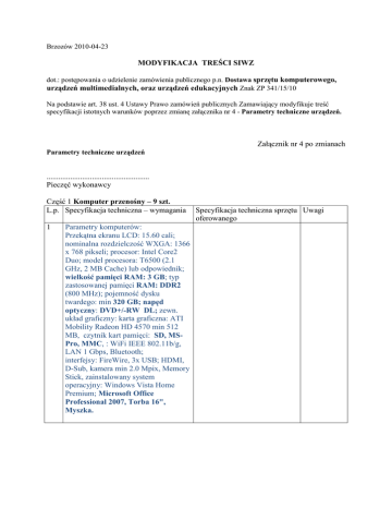 Brzozów 2010-04-23 MODYFIKACJA TREŚCI SIWZ dot.: postępowania o udzielenie zamówienia publicznego p.n. Dostawa sprzętu komputerowego, urządzeń multimedialnych, oraz urządzeń edukacyjnych Znak ZP 341/15/10 Na podstawie art. 38 ust. 4 Ustawy Prawo zamówień publicznych Zamawiający modyfikuje treść specyfikacji istotnych warunków poprzez zmianę załącznika nr 4 - Parametry techniczne urządzeń. Załącznik nr 4 po zmianach Parametry techniczne urządzeń .................................................... Pieczęć wykonawcy Część 1 Komputer przenośny – 9 szt. L.p. Specyfikacja techniczna – wymagania 1 Parametry komputerów: Przekątna ekranu LCD: 15.60 cali; nominalna rozdzielczość WXGA: 1366 x 768 pikseli; procesor: Intel Core2 Duo; model procesora: T6500 (2.1 GHz, 2 MB Cache) lub odpowiednik; wielkość pamięci RAM: 3 GB; typ zastosowanej pamięci RAM: DDR2 (800 MHz); pojemność dysku twardego: min 320 GB; napęd optyczny: DVD+/-RW DL; zewn. układ graficzny: karta graficzna: ATI Mobility Radeon HD 4570 min 512 MB, czytnik kart pamięci: SD, MSPro, MMC, : WiFi IEEE 802.11b/g, LAN 1 Gbps, Bluetooth; interfejsy: FireWire, 3x USB; HDMI, D-Sub, kamera min 2.0 Mpix, Memory Stick, zainstalowany system operacyjny: Windows Vista Home Premium; Microsoft Office Professional 2007, Torba 16", Myszka. Specyfikacja techniczna sprzętu Uwagi oferowanego Część 2 Programy komputerowe edukacyjne L.p. Specyfikacja techniczna – wymagania Specyfikacja techniczna sprzętu oferowanego 1 Program komputerowy – Logopedyczne zabawy – 9 szt. każdej części Część 1 Ćwiczenia zawarte w programie logopedyczne zabawy, wspomagają terapię logopedyczną dzieci w wieku od 4-9 lat, ćwiczą wymowę określonych głosek sz,ż,cz,dż. Program komputerowy powinien zawierać minimum 5 - 6 multimedialnych gier. Część 2 Ćwiczenia zawarte w programie logopedyczne zabawy, wspomagają terapię logopedyczną dzieci w wieku od 4-9 lat, ćwiczą wymowę określonych głosek s,z,c, dz. Program komputerowy powinien zawierać 5 lub 6 multimedialnych gier. Część 3 Ćwiczenia zawarte w programie logopedyczne zabawy, wspomagają terapię logopedyczną dzieci w wieku od 4-9 lat, ćwiczą wymowę określonych głosek j,l,r. Program komputerowy powinien zawierać 5 lub 6 multimedialnych gier. 2 Edu ROM multimedialne lekcje z chemii – pakiet przedmiotowy do gimnazjum – 8 szt. eduROM Chemia (Gimnazjum) klasa 1,2,3. EduROM multimedialna baza wiedzy Chemia to edukacyjny program komputerowy, obejmujący cały materiał nauczania chemii w gimnazjum. Część 3 Rzutnik multimedialny 9 szt. Uwagi L.p. Specyfikacja techniczna – wymagania Opis Techniczny: minimalne parametry techniczne: Technologia Rozdzielczość podstawowa Rozdzielczość Jasność minimalna Moc lampy Żywotność lampy (normal) Żywotność lampy (econo) Kontrast minimum Format obrazu (standard) Format obrazu (kompresowany) Zoom optyczny Korekcja pionowa (Keystone) Min. wielkość obrazu Maks. wielkość obrazu Obsługa NTSC/PAL/SECAM Obsługa HDTV Specyfikacja techniczna sprzętu oferowanego DLP XGA (1024 x 768) SXGA (1280 x 1024) 2500 ANSI lumen 180 W 3000 h 4000 h 3000 :1 4:3 16:9 1,1 :1 Auto +,-40 Stopni 23 cale 300 cale Tak 480i, 480p, 576p, 720p, 1080i 1 szt. 1 szt. 1 szt. 1 szt. Wejście HDMI (ilość) Wejście D-Sub 15pin (ilość) Wyjście D-Sub 15pin (ilość) Wejście S-Video mini DIN (ilość) Wejście Composite video RCA Cinch (ilość) Wejście audio RCA Cinch (ilość) Gniazdo RS-232 Gniazdo RJ-45 Network Gniazdo USB (ilość) Głośniki Głośność (normal) Głośność (econo) Torba w komplecie Pilot 1 szt. 1 szt. 1 szt. 1 szt. 1x10Watt 30 dB 28 dB 1 szt 1 szt Gwarancja na projektor Gwarancja na lampę 36 mies 6 mies Część 4 Ekran na statywie 8 szt. L.p. Specyfikacja techniczna – wymagania 1 Ekran ręczny Crystal Line Tripod 1 szt. Specyfikacja techniczna sprzętu oferowanego Uwagi 180x180 cm Opis Techniczny: Wysokość min 180 cm, Szerokość min 180 cm Format 1:1 Materiał Matt White Materiał - Grubość powierzchni min 0.30 mm, Rodzaj ekranu Rozwijany ręcznie, Mocowanie na trójnogu, Część 5 Odtwarzacz DVD – 9 szt L.p. Specyfikacja techniczna – Specyfikacja techniczna sprzętu wymagania oferowanego Odtwarzanie płyt DVD, DVD-R, DVD-RW Odtwarzanie DivX, XviD, WMA, MPEG4, MP3, JPEG Odtwarzania plików DivX i XviD z napisami Odtwarzanie płyt CD, VCD, CD-R, CD-RW , Standard Wideo PAL Skanowanie progresywne (Progresive Scan), Dolby ProLogic II, Dolby Prologi, Dolby Digital AC-3, Digital Theater System DTS ,Gniazdo SCART (Eurozłącze) min 1, Wyjście HDTV (component) 3*RCA Cinch, Wyjście Composite video RCA Cinch, Wyjście audio 5 + 1 (6 x RCA Cinch), Wyjście słuchawkowe, Wyjście cyfrowe optyczne, Pilot Na wyposażeniu, Port USB, Certyfikaty CE Część 6 Przenośny sprzęt nagłaśniający 11 szt. L.p. Specyfikacja techniczna – wymagania Specyfikacja techniczna sprzętu oferowanego Kolumna aktywna ze wzmacnianego polipropylenu - dwudrożna. Głośnik niskotonowy 12" na sztywnym zawieszeniu oraz głośnik wysokotonowy dynamiczny z membraną o średnicy 1". Przednia część kolumny zabezpieczona metalową maskownicą. Wbudowany wzmacniacz o mocy ciągłej (RMS) min 200W. Wszystkie wejścia z osobną regulacją głośności. Regulacja głośności master, dwupasmowy korektor graficzny barwy dźwięku na sumie. Wskaźnik kontrolka zasilania POWER oraz CLIP. Uwagi Uwagi Minimalne Dane techniczne: 1 x Wejście mikrofonowe symetryczne XLR/Jack 6,3mm 1 x Wejście liniowe symetryczne XLR/2 x Cinch 1 x Wyjście liniowe symetryczne XLR/Jack 6,3 mm Pasmo przenoszenia: od min 40 Hz do 20 000 Hz Wymiary: 430 x 560 x 310 mm Waga: od 20 do 23 kg Część 7 Radiomagnetofony 12 szt. L.p. Specyfikacja techniczna – wymagania Specyfikacja techniczna sprzętu oferowanego Radiomagnetofon CD z tunerem Uwagi cyfrowym, portem USB, możliwość nagrywania i odtwarzania plików MP3, systemem głośników Wide Dir