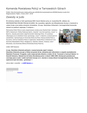 Komenda Powiatowa Policji w Tarnowskich Górach Źródło: http://tarnowskie-gory.slaska.policja.gov.pl/k26/informacje/wiadomosci/63508,Zawody-w-Judo.html Wygenerowano: Piątek, 3 marca 2017, 19:54 Zawody w Judo W minioną sobotę w hali sportowej GKS Czarni Bytom przy ul. Łużyckiej 90, odbyły się MISTRZOSTWA POLSKI POLICJI W JUDO. Do zawodów zgłosiło się kilkadziesiąt drużyn z komend w całym kraju oraz jedna drużyna strażaków. St.asp. Stanisław Urbaniak z tarnogórskiej komendy stanał na podium zajmując 3 miejsce... Mistrzostwa Polski Policji w Judo zorganizowane zostały przez Wydział Kadr i Szkolenia KWP w Katowicach, Polską Federację Sportu „Gwardia” oraz klub sportowy „Czarni” w Bytomiu. Zawody patronatem objął Komendant Głównego Policji. W rywalizacji odbywającej się na obiektach klubu sportowego „Czarni” w Bytomiu uczestniczyło 54 zawodników, reprezentujących Komendę Stołeczną Policji, Wyższą Szkołę Policji w Szczytnie, Centrum Szkolenia Policji w Legionowie, Szkołę Policji w Katowicach oraz Komendy Wojewódzkie Policji z Bydgoszczy, Gdańska, Katowic, Krakowa, Łodzi i Wrocławia, oraz Komendę Główną Państwowej Straży Pożarnej. fot. Adam Jakubiak żródło: KWP Katowice st.asp. Stanisław Urbaniak policjant z naszej komendy zajął 3 miejsce. Stanisław Urbaniak pracuje w Policji od ponad 18 lat, aktualnie jest referentem w zespole wywiadowców Wydziału Prewencji. Przygodę z judo rozpoczął jako dziecko w wieku 10 lat. Trenował w Czarnych Bytom i w Gwardii Katowice. Należał też do Kadry Narodowej junior w latach 1986-1989. Dzisiaj jest posiadaczem czarnego pasa w judo i nadal wytrwale trenuje m.in. również w nowej siłowni tarnogórskiej komendy. Panie aspirancie byle tak dalej – gratulacje !!! wiecej zdjęć z zawodów >>KMP Bytom<< Ocena: 0/5 (0) Tweetnij