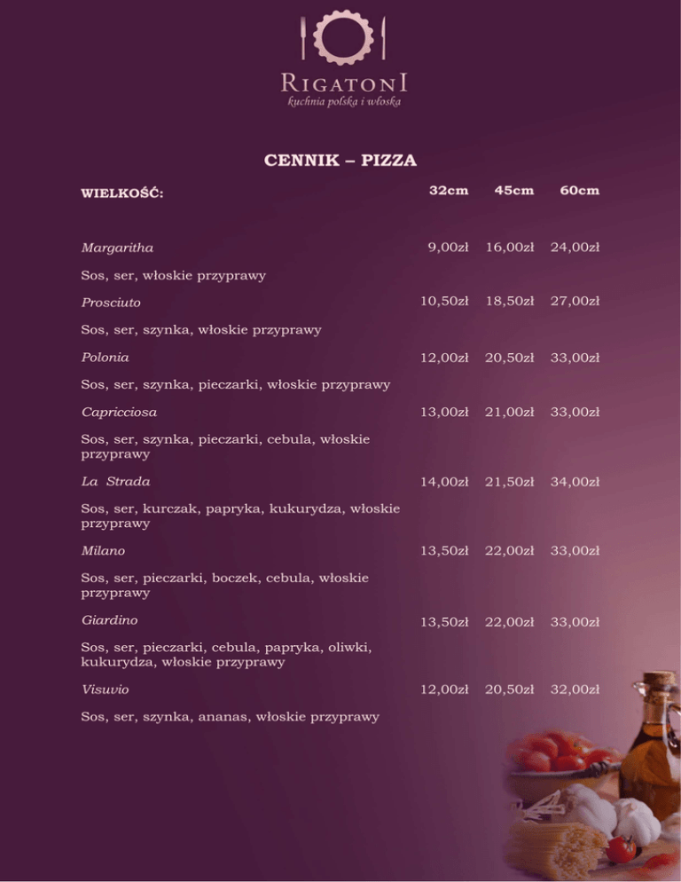 CENNIK – KUCHNIA POLSKA CENNIK – PIZZA WIELKOŚĆ: 32cm 45cm 60cm Margaritha 9,00zł 16,00zł 24,00zł 10,50zł 18,50zł 27,00zł 12,00zł 20,50zł 33,00zł 13,00zł 21,00zł 33,00zł 14,00zł 21,50zł 34,00zł 13,50zł 22,00zł 33,00zł 13,50zł 22,00zł 33,00zł 12,00zł 20,50zł 32,00zł Sos, ser, włoskie przyprawy Prosciuto Sos, ser, szynka, włoskie przyprawy Polonia Sos, ser, szynka, pieczarki, włoskie przyprawy Capricciosa Sos, ser, szynka, pieczarki, cebula, włoskie przyprawy La Strada Sos, ser, kurczak, papryka, kukurydza, włoskie przyprawy Milano Sos, ser, pieczarki, boczek, cebula, włoskie przyprawy Giardino Sos, ser, pieczarki, cebula, papryka, oliwki, kukurydza, włoskie przyprawy Visuvio Sos, ser, szynka, ananas, włoskie przyprawy CENNIK – KUCHNIA POLSKA Siciliana 15,00zł 23,50zł 36,00zł 15,00zł 23,00zł 36,00zł 14,00zł 21,50zł 35,00zł 15,00zł 23,00zł 36,00zł 14,00zł 21,50zł 34,00zł 13,00zł 21,00zł 30,00zł 13,50zł 22,00zł 35,00zł 11,50zł 18,50zł 32,00zł 13,50zł 22,00zł 33,50zł Sos, ser, szynka, salami, mięso mielone, chilli, cebula, włoskie przyprawy Tonno Sos, ser, tuńczyk, cebula, kukurydza, oliwki, włoskie przyprawy Quatro Stagioni Sos, ser, szynka, salami, cebula, papryka, włoskie przyprawy Quatro Formaggi Sos, cztery rodzaje sera: mozzarella, ser pleśniowy, ser kozi, ser wędzony, włoskie przyprawy Pollo Sos, ser, kurczak, suszone pomidory, cebula, włoskie przyprawy Speciale Ser, kiełbasa, cebula, pomidor, włoskie przyprawy Maestro Sos, ser, pieczarki, karkówka, pomidor, papryka, cebula, cebula, włoskie przyprawy Peperoni Sos, ser, salami, włoskie przyprawy Roma Sos, ser, kurczak, salami, boczek, włoskie przyprawy CENNIK – KUCHNIA POLSKA Bolognese 16,00zł 23,50zł 34,00zł 16,00zł 23,50zł 34,00zł 16,00zł 23,50zł 34,00zł 16,50zł 25,00zł 38,00zł 12,00zł 20,50zł 32,00zł 12,50zł 21,00zł 34,00zł 2,00zł 1,50zł 1,00zł 2,50zł 1,50zł 1,50zł 3,00zł 1,50zł 2,00zł Sos bolognese, ser, szynka, salami, papryka, kukurydza, cebula, włoskie przyprawy Boss Sos, ser, szynka, kiełbasa, boczek, cebula, ogórki konserwowe, pomidor, pieczarki, włoskie przyprawy Frutti Di Mare Sos, ser, owoce morza, włoskie przyprawy Laguna Sos, ser, 5 składników do wyboru Cosanostra Sos, ser, szynka, pieczarki, kukurydza, włoskie przyprawy Verona Sos, ser, mięso mielone, salami, oliwki, cebula, włoskie przyprawy DO ŚREDNIEJ I DUśEJ PIZZY SOS GRATIS! Dodatki: Mięsny, warzywny lub serowy Sos Opakowanie SERDECZNIE ZAPRASZAMY!!!