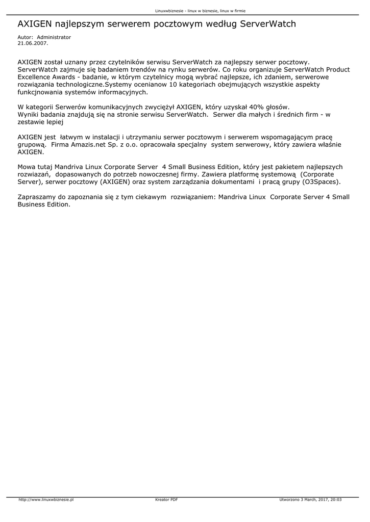 Linuxwbiznesie - linux w biznesie, linux w firmie AXIGEN najlepszym serwerem pocztowym według ServerWatch Autor: Administrator 21.06.2007. AXIGEN został uznany przez czytelników serwisu ServerWatch za najlepszy serwer pocztowy. ServerWatch zajmuje się badaniem trendów na rynku serwerów. Co roku organizuje ServerWatch Product Excellence Awards - badanie, w którym czytelnicy mogą wybrać najlepsze, ich zdaniem, serwerowe rozwiązania technologiczne.Systemy ocenianow 10 kategoriach obejmujących wszystkie aspekty funkcjnowania systemów informacyjnych. W kategorii Serwerów komunikacyjnych zwyciężył AXIGEN, który uzyskał 40% głosów. Wyniki badania znajdują się na stronie serwisu ServerWatch. Serwer dla małych i średnich firm - w zestawie lepiej AXIGEN jest łatwym w instalacji i utrzymaniu serwer pocztowym i serwerem wspomagającym pracę grupową. Firma Amazis.net Sp. z o.o. opracowała specjalny system serwerowy, który zawiera właśnie AXIGEN. Mowa tutaj Mandriva Linux Corporate Server 4 Small Business Edition, który jest pakietem najlepszych rozwiazań, dopasowanych do potrzeb nowoczesnej firmy. Zawiera platformę systemową (Corporate Server), serwer pocztowy (AXIGEN) oraz system zarządzania dokumentami i pracą grupy (O3Spaces). Zapraszamy do zapoznania się z tym ciekawym rozwiązaniem: Mandriva Linux Corporate Server 4 Small Business Edition. http://www.linuxwbiznesie.pl Kreator PDF Utworzono 3 March, 2017, 20:03