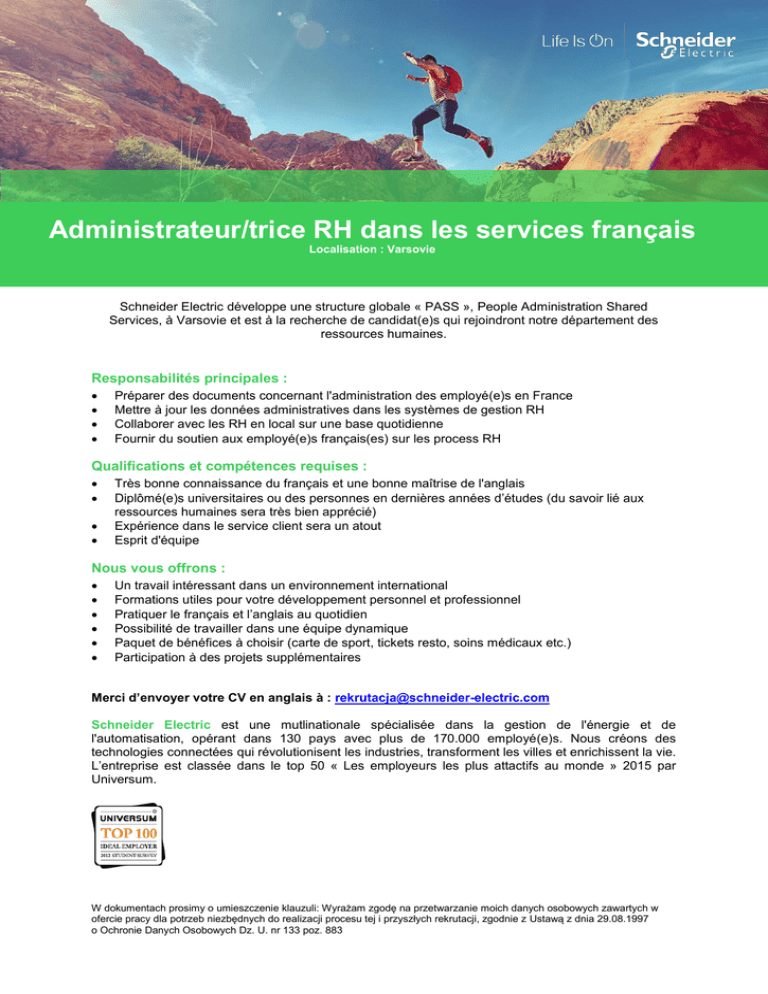 Administrateur/trice RH dans les services français Localisation : Varsovie Schneider Electric développe une structure globale « PASS », People Administration Shared Services, à Varsovie et est à la recherche de candidat(e)s qui rejoindront notre département des ressources humaines. Responsabilités principales : Préparer des documents concernant l'administration des employé(e)s en France Mettre à jour les données administratives dans les systèmes de gestion RH Collaborer avec les RH en local sur une base quotidienne Fournir du soutien aux employé(e)s français(es) sur les process RH Qualifications et compétences requises : Très bonne connaissance du français et une bonne maîtrise de l'anglais Diplômé(e)s universitaires ou des personnes en dernières années d’études (du savoir lié aux ressources humaines sera très bien apprécié) Expérience dans le service client sera un atout Esprit d'équipe Nous vous offrons : Un travail intéressant dans un environnement international Formations utiles pour votre développement personnel et professionnel Pratiquer le français et l’anglais au quotidien Possibilité de travailler dans une équipe dynamique Paquet de bénéfices à choisir (carte de sport, tickets resto, soins médicaux etc.) Participation à des projets supplémentaires Merci d’envoyer votre CV en anglais à : [email protected] Schneider Electric est une mutlinationale spécialisée dans la gestion de l'énergie et de l'automatisation, opérant dans 130 pays avec plus de 170.000 employé(e)s. Nous créons des technologies connectées qui révolutionisent les industries, transforment les villes et enrichissent la vie. L’entreprise est classée dans le top 50 « Les employeurs les plus attactifs au monde » 2015 par Universum. W dokumentach prosimy o umieszczenie klauzuli: Wyrażam zgodę na przetwarzanie moich danych osobowych zawartych w ofercie pracy dla potrzeb niezbędnych do realizacji procesu tej i przyszłych rekrutacji, zgodnie z Ustawą z dnia 29.08.1997 o Ochronie Danych Osobowych Dz. U. nr 133 poz. 883