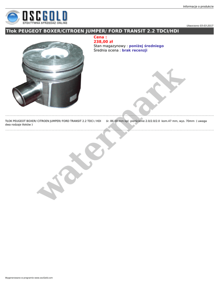 Informacje o produkcie Utworzono 03-03-2017 Tłok PEUGEOT BOXER/CITROEN JUMPER/ FORD TRANSIT 2.2 TDCI/HDI Cena : 238,00 zł er m ar k Stan magazynowy : poniżej średniego Średnia ocena : brak recenzji w at TŁOK PEUGEOT BOXER/ CITROEN JUMPER/ FORD TRANSIT 2.2 TDCI / HDI dwa rodzaje tłoków ) Wygenerowano w programie www.oscGold.com śr. 86,00 mm kpl pierścienie 2.0/2.0/2.0 kom.47 mm, wys. 70mm ( uwaga
