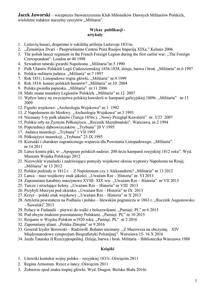 Jacek Jaworski – wiceprezes Stowarzyszenia Klub Miłośników Dawnych Militariów Polskich, wieloletni redaktor naczelny zeszytów ,,Militaria”. Wykaz publikacji artykuły 1. Lietuvių husari, desperatai ir sukil÷lių artilerja Lietuvoje 1831m. 2. ,,Žemaitijos Dvari – Pasipriešinimo Centrai Prieš Rusijos Imperiją XIXa.” Kelm÷s 2006 3. The polish lancer regiment in the French Foreign Legion during the first carlist war. ,,The Foreign Correspondent”. London nr 40 1998 4. Szwadron tatarski gwardii Napoleona. ,,Militaria”nr.5 1990 5. Pułk Ułanów Polskich Legii Cudzoziemskiej 1836-1838, dzieje, barwa i broń. ,,Militaria” nr.6 1997 6. Polskie militaria judaica. ,,Militaria” nr.7 1997 7. Rok 1831; Listopadowe trupie główki. ,,Militaria” nr.9 1999 8. Rok 1814- koniec polskich huzarów? ,,Militaria” nr.10 2004 9. Polska gwardia papieska. ,,Militaria” nr.11 2006 10. Mało znane mundury Legionów Polskich. ,,Militaria” nr.12 2007 11. Wpływ lancy na zwycięstwa polskiej kawalerii w kampanii galicyjskiej 1809r. ,,Militaria” nr.13 2009 12. Figurki wojskowe. ,,Archeologia Wojskowa” nr.1 1992 13. Z Napoleonem do Moskwy. ,,Archeologia Wojskowa” nr.3 1993 14. Nieznany 5-ty pułk ułanów (Turcja 1856r.). ,,Nowy Przegląd Kawalerii” nr. 3/23 2007 15. Polskie orły na śyznym PółksięŜycu. ,,Rocznik Muzułmański”. Warszawa, nr.2 1994 16. Poprzednicy dąbrowszczaków. ,,Trybuna” 20 V 1995 17. Judaica insurekcji. ,,Trybuna” 1 VII 1995 18. PółksięŜyce insurekcji. ,,Trybuna” 23 IX 1995 19. Kierunki i charakter zagranicznego wsparcia dla Powstania Listopadowego. ,,Militaria” nr 14 2011 20. Lance kontra piki, w: ,,Apogeum polskich nadziei. 200-lecie kampanii rosyjskiej 1812 roku”. Wyd. Muzeum Wojska Polskiego 2012 21. Niezwykłe wynalazki i zadziwiające pomysły wojskowe okresu wyprawy Napoleona na Rosję. ,,Militaria” nr 13 2012 22. Polskie podziały w 1812 r. – Z Napoleonem czy z Aleksandrem? ,,Militaria” nr 13 2012 23. Lanca – nasz wojskowy znak jakości. ,,UwaŜam Rze – Historia” nr. VI 2013 24. Zapomniane karabiny maszynowe XVIII- XIX ww. ,,UwaŜam Rze – Historia” nr VII 2013 25. Tarcze i strzelające hełmy. ,,UwaŜam Rze – Historia” nr VIII 2013 26. Przybyli Murzyni pod okienko. ,,UwaŜam Rze – Historia” nr IX 2013 27. KrzyŜ – polski znak wojskowy. ,,UwaŜam Rze – Historia” nr X 2013 28. Artyleria powstańcza na Podlasiu i polsko – litewskim pograniczu w 1863 r. ,,Rocznik Augustowsko – Suwalski” 2013 29. Polacy w Finlandii – pierwsi do walki z bolszewikami. ,,Pamięć. PL” nr 6 2015 30. Pod obcym znakiem pozostaniemy Polakami. ,,Pamięć. PL” nr 10 2015 31. Rosjanie w Wojsku Polskim w1920 roku. ,,Pamięć. PL” nr 2 2016 32. Zapomniany aliant. ,,Polska Zbrojna” nr 9 2016 33. Generał Izydor Borowski – Radziwiłł. Bohater nieznany. ,,Z Mazowsza na obczyznę. XIV Międzynarodowe sympozjum Biografistyki Polonijnej”. Warszawa 15- 16 X 2016 34. Jazda Tatarska II Rzeczypospolitej. Dzieje, barwa i broń. Militaria – Biblioteczka Warszawa 1988 KsiąŜki 1. Litewski kontekst wojny polsko – rosyjskiej 1831r. Oświęcim 2011 2. Regina Armorum. Rzecz o lancy. Oświęcim 2011 3. śołnierze spod znaku trupiej główki. Wyd. Dragon. Bielsko Biała 2016r. 1 Udział w konferencjach naukowych KMDMP i innych 1. 2. 3. 4. 5. 6. 7. 8. 9. 10. 11. 12. 13. 14. 15. XIV Sesja Naukowa Stowarzyszenia Miłośników Dawnej Broni i Barwy w Muzeum Narodowym w Warszawie, 12 –13 XI 1988r. z okazji 70-ej rocznicy odzyskania Niepodległości. Referat pt.: Oddział Jazdy Tatarskiej w Wojsku Polskim 1919 – 1920 r. Konferencja: Dwory Ŝmudzkie jako ośrodki oporu wobec imperium rosyjskiego w XIX w. Muzeum w Kelm÷s – Litwa, 26 IV 2006r. Referat pt.: Litewscy huzarzy, Hufiec Desperatów i powstańcza artyleria w powiatach litewskich w 1831r. V Międzynarodowy Kongres Stowarzyszenia Napoleońskiego w Zamku KsiąŜąt Pomorskich w Słupsku, 5 - 9 VII 2007 r. Referat pt.: Konnopolcy i Kozacy wołyńscy – zbrojne ramię orientacji prorosyjskiej Konferencja w Mazowieckim Centrum Kultury i Sztuki poświęcona 40-leciu Klubu Miłośników Dawnych Militariów Polskich Referat pt.: KsiąŜę Józef Poniatowski – człowiek i wódz jakiego nie znamy Konferencja Naukowa z okazji 200 - lecia zwycięskiej wojny polsko – austriackiej 1809 r. organizowanej w dn. 20 IV 2009 r. przez Mazowieckie Centrum Kultury i Klub Miłośników Dawnych Militariów Polskich w Warszawie Referat: Rola lancy w zwycięskiej kampanii galicyjskiej 1809 r. Konferencja Naukowa poświęcona 180 rocznicy Powstania Listopadowego organizowana przez Klub Militariów Polskich, Państwowe Muzeum Archeologiczne w Warszawie i Muzeum Niepodległości w Warszawie w dn. 27 XI 2010 r. Referat: Kierunki i charakter zagranicznego wsparcia Powstania Listopadowego Konferencja Naukowa w Kownie organizowana przez Muzeum Wojska w Kownie w dn. 19 maja 2011r. poświęcona 180 rocznicy powstania na Litwie Referat: Udział Litwinów i śmudzinów w działaniach wojennych w Królestwie Polskim w 1831r. Konferencja Naukowa w Muzeum Okręgowym w Ostrołęce poświęcona 180. rocznicy bitwy pod Ostrołęką 20 V 2011r. Referat: Piesi kirasjerzy Powstania Listopadowego Konferencja w Muzeum Miejskim w Brodnicy poświęcona 180. rocznicy upadku Powstania Listopadowego 20 X 2011r. Referat: Litwa i Litwini szansą Polaków na zwycięstwo Konferencja w Muzeum Niepodległości 15 X 2011r. - Tradycje Powstania Listopadowego. Referat: Polscy kozacy Powstania Listopadowego Konferencja w Muzeum Niepodległości 20 IX 2012 – W 200. rocznicę kampanii napoleońskiej w Rosji. Referaty: a. Niezwykłe wynalazki i zadziwiające pomysły wojskowe okresu wyprawy Napoleona na Rosję. b. Polskie podziały w 1812r. – Z Napoleonem czy z Aleksandrem? Konferencja w Muzeum Romantyzmu w Opinogórze – 200. rocznica wyprawy na Moskwę. Referat: My z Aleksandrem – polska opcja prorosyjska i polskie form