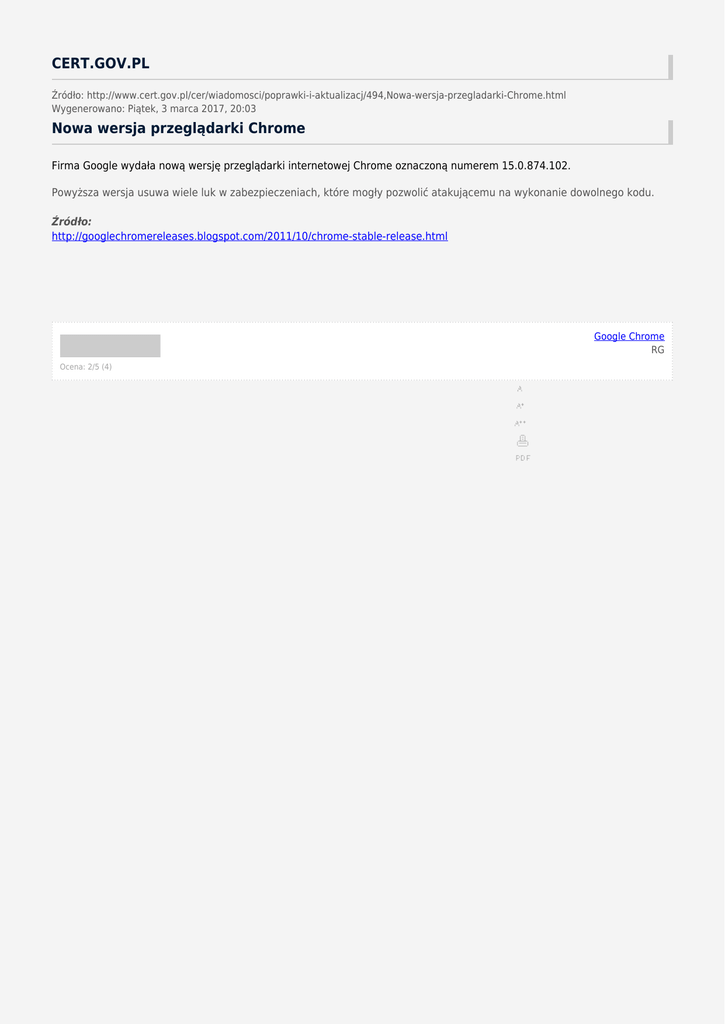 CERT.GOV.PL Źródło: http://www.cert.gov.pl/cer/wiadomosci/poprawki-i-aktualizacj/494,Nowa-wersja-przegladarki-Chrome.html Wygenerowano: Piątek, 3 marca 2017, 20:03 Nowa wersja przeglądarki Chrome Firma Google wydała nową wersję przeglądarki internetowej Chrome oznaczoną numerem 15.0.874.102. Powyższa wersja usuwa wiele luk w zabezpieczeniach, które mogły pozwolić atakującemu na wykonanie dowolnego kodu. Źródło: http://googlechromereleases.blogspot.com/2011/10/chrome-stable-release.html Google Chrome RG Ocena: 2/5 (4)