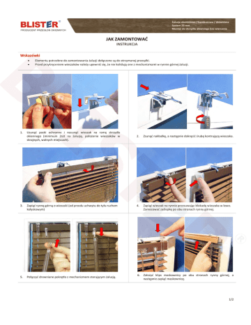 Żaluzja aluminiowa / bambusowa / drewniana System 25 mm Montaż do skrzydła okiennego bez wiercenia JAK ZAMONTOWAĆ INSTRUKCJA Wskazówki • • Elementy potrzebne do zamontowania żaluzji dołączone są do otrzymanej przesyłki. Przed przykręceniem wieszaków należy upewnić się, że nie kolidują one z mechanizmami w rynnie górnej żaluzji. 1. Usunąć paski ochronne i nasunąć wieszak na ramę skrzydła okiennego (minimum 2szt na żaluzję, położenie wieszaków w skrajnych, wolnych miejscach). 3. Zapiąć rynnę górną o wieszaki (od przodu uchwytu do tyłu ruchem kołyskowym) 5. Połączyć drewniane pokrętło z mechanizmem sterującym żaluzją. 2. Zsunąć nakładkę, a następnie dokręcić śrubę kontrującą wieszaka. 4. Zapiąć wieszak na rynnie przesuwając blokadę wieszaka w lewo. Zamocować zaślepkę po obu stronach rynny górnej. 6. Założyć klips maskownicy po obu stronach rynny górnej, a następnie zapiąć maskownicę. 1/2 7. Po opuszczeniu żaluzji do dołu zamocować ozdobną końcówkę sznurka. Opcje dodatkowe - Prowadzenie boczne 8. Zamocować klips na dole skrzydła okiennego. Nasunąć tulejkę kontrującą na naciągniętą linkę, a następnie dokręcić wkręt w tulejce (czynność wykonać z obu stron żaluzji). 9. Nadmiar linki odciąć kleszczykami. Użytkowanie • • • Do ustawienia kąta nachylenia lameli służy drewniane pokrętło. Aby opuścić żaluzję, należy chwycić za sznurki sterujące i pociągnąć je w kierunku środka żaluzji. Aby zahamować żaluzję, należy opuścić ją na wybraną wysokość, wychylić sznurki sterujące na zewnątrz żaluzji i następnie delikatnie je popuścić. Tel. 13 43 226 04 | 799 129 900 e-mail: [email protected] | www.zaluzjedrewniane.pl | www.zaluzjedrewniane.com | www.zaluzjedrewniane.eu